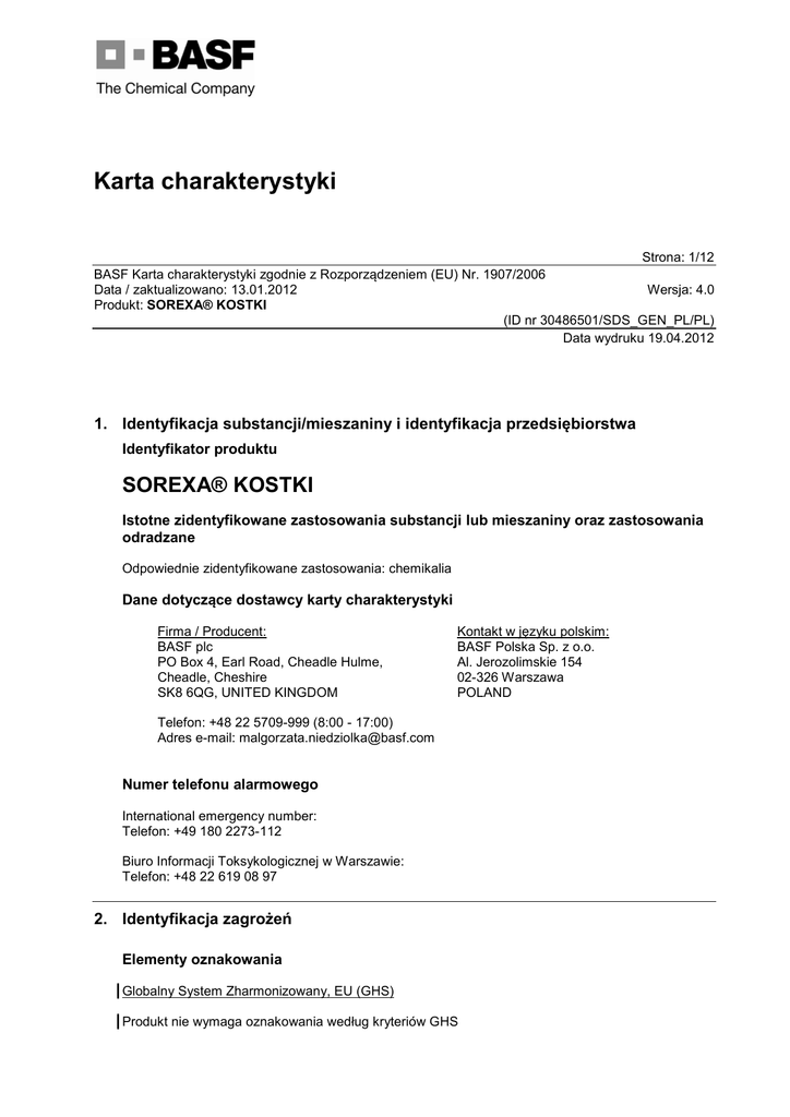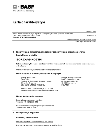 Karta charakterystyki Strona: 1/12 BASF Karta charakterystyki zgodnie z Rozporządzeniem (EU) Nr. 1907/2006 Data / zaktualizowano: 13.01.2012 Wersja: 4.0 Produkt: SOREXA® KOSTKI (ID nr 30486501/SDS_GEN_PL/PL) Data wydruku 19.04.2012 1. Identyfikacja substancji/mieszaniny i identyfikacja przedsiębiorstwa Identyfikator produktu SOREXA® KOSTKI Istotne zidentyfikowane zastosowania substancji lub mieszaniny oraz zastosowania odradzane Odpowiednie zidentyfikowane zastosowania: chemikalia Dane dotyczące dostawcy karty charakterystyki Firma / Producent: BASF plc PO Box 4, Earl Road, Cheadle Hulme, Cheadle, Cheshire SK8 6QG, UNITED KINGDOM Kontakt w języku polskim: BASF Polska Sp. z o.o. Al. Jerozolimskie 154 02-326 Warszawa POLAND Telefon: +48 22 5709-999 (8:00 - 17:00) Adres e-mail: [email protected] Numer telefonu alarmowego International emergency number: Telefon: +49 180 2273-112 Biuro Informacji Toksykologicznej w Warszawie: Telefon: +48 22 619 08 97 2. Identyfikacja zagrożeń Elementy oznakowania Globalny System Zharmonizowany, EU (GHS) Produkt nie wymaga oznakowania według kryteriów GHS Strona: 2/12 BASF Karta charakterystyki zgodnie z Rozporządzeniem (EU) Nr. 1907/2006 Data / zaktualizowano: 13.01.2012 Wersja: 4.0 Produkt: SOREXA® KOSTKI (ID nr 30486501/SDS_GEN_PL/PL) Data wydruku 19.04.2012 Zgodnie z Dyrektywą 67/548/EWG lub 1999/45/UE Zwroty S S2 S13 S20/21 Chronić przed dziećmi. Nie przechowywać razem z żywnością, napojami i paszami dla zwierząt. Nie jeść i nie pić oraz nie palić tytoniu podczas stosowania produktu. Klasyfikacja substancji lub mieszaniny Zgodnie z Rozporządzeniem (UE) Nr. 1272/2008 (CLP) Produkt nie podlega obowiązkowi klasyfikacji według kryteriów GHS. Zgodnie z Dyrektywą 67/548/EWG lub 1999/45/UE Możliwe niebezpieczeństwa.: Nie są znane żadne szczególne zagrożenia, o ile przestrzegane są przepisy/zalecenia dotyczące magazynowania i postępowania z produktem. Inne zagrożenia Zgodnie z Rozporządzeniem (UE) Nr. 1272/2008 (CLP) Proszę patrzeć w sekcji 12 - Wyniki oceny PBT i vPvB Produkt jest niebezpieczny dla ssaków, w tym dla zwierząt domowych i gospodarczych oraz ptaków. Unikać narażenia organizmów niecelowych. 3. Skład/informacja o składnikach Mieszaniny Charakterystyka chemiczna zawiera: difenakum (Zawartość (W/W): 0,005 %) Składniki niebezpieczne (GHS) zgodnie z Rozporządzeniem (UE) nr. 1272/2008 parafina stała Zawartość (W/W): < 30 % Numer CAS: 8002-74-2 Numer WE: 232-315-6 Składniki niebezpieczne zgodnie z dyrektywą 1999/45/WE Strona: 3/12 BASF Karta charakterystyki zgodnie z Rozporządzeniem (EU) Nr. 1907/2006 Data / zaktualizowano: 13.01.2012 Wersja: 4.0 Produkt: SOREXA® KOSTKI (ID nr 30486501/SDS_GEN_PL/PL) Data wydruku 19.04.2012 parafina stała Zawartość (W/W): < 30 % Numer CAS: 8002-74-2 Numer WE: 232-315-6 4. Środki pierwszej pomocy Opis środków pierwszej pomocy Zdjąć zanieczyszczoną odzież. Wdychanie: spokój, świeże powietrze Kontakt ze skórą: Zmyć dokładnie wodą z mydłem. Kontakt z oczami: Płukać przez 15 min pod bieżącą wodą przy szeroko otwartych oczach. Połknięcie: Wypłukać usta i popić dużą ilością wody. Najważniejsze ostre i opóźnione objawy oraz skutki narażenia Symptomy: Zaburzenia krzepnięcia krwi Podwyższone ryzyko krwawienia. W ciężkich przypadkach obfite krwotoki wewnętrzne prowadzą do śmiertelnej zapaści układu krążenia. Symptomy mogą wystąpić nawet do 4 dni od narażenia. Niebezpieczeństwa: Substancja / produkt jest rodentycydem o działaniu antykoagulacyjnym z kumaryną o typowym sposobie oddziaływania. Wskazania dotyczące wszelkiej natychmiastowej pomocy lekarskiej i szczególnego obchodzenia się z poszkodowanym Postępowanie: Leczenie objawowe (detoksykacja, podtrzymywanie funkcji życiowych). antidotum: Witamina K1- preparat jako antidotum. 5. Postępowanie w przypadku pożaru Środki gaśnicze Odpowiednie środki gaśnicze: rozproszone prądy wody, proszek gaśniczy, piana Ze względów bezpieczeństwa nie stosować jako środków gaśniczych: dwutlenek węgla Szczególne zagrożenia związane z substancją lub mieszaniną tlenek węgla, dwutlenek węgla, tlenki azotu Strona: 4/12 BASF Karta charakterystyki zgodnie z Rozporządzeniem (EU) Nr. 1907/2006 Data / zaktualizowano: 13.01.2012 Wersja: 4.0 Produkt: SOREXA® KOSTKI (ID nr 30486501/SDS_GEN_PL/PL) Data wydruku 19.04.2012 Podane substancje/grupy substancji mogą być uwalniane w czasie pożaru. Zalecenia dla straży pożarnej Szczególne wyposażenie ochronne: Należy zastosować zamknięty system ochrony dróg oddechowych i ubranie ochronne odporne na działanie chemikaliów. Inne dane: Zanieczyszczoną wodę gaśniczą odizolować, zapobiec przedostaniu się do kanalizacji lub ścieków. Pozostałości po pożarze i zanieczyszczoną wodę gaśniczą unieszkodliwić zgodnie z przepisami. Nie wdychać dymów powstających w wyniku pożaru lub wybuchu. Zagrożone pojemniki chłodzić wodą. 6. Postępowanie w przypadku niezamierzonego uwolnienia do środowiska Indywidualne środki ostrożności, wyposażenie ochronne i procedury w sytuacjach awaryjnych Zapobiec powstawaniu pyłu. Stosować ubranie ochronne. Unikać kontaktu ze skórą, oczami i odzieżą. Środki ostrożności w zakresie ochrony środowiska Zapobiec przedostaniu się do kanalizacji/wód powierzchniowych/wód gruntowych. Zapobiec przedostaniu się do gleby/ gruntu. Metody i materiały zapobiegające rozprzestrzenianiu się skażenia i służące do usuwania skażenia Dla małych ilości: Zebrać za pomocą środka wiążącego kurz i unieszkodliwić. Dla dużych ilości: Zebrać mechanicznie. Unikać powstawania pyłu. Zebrany materiał unieszkodliwić zgodnie z przepisami. Odpady zbierać oddzielnie w odpowiednich, oznakowanych i dających się zamknąć pojemnikach. Zabrudzone przedmioty i podłogę czyścić gruntownie wodą i środkami powierzchniowo-czynnymi z zachowaniem przepisów o ochronie środowi