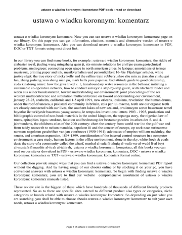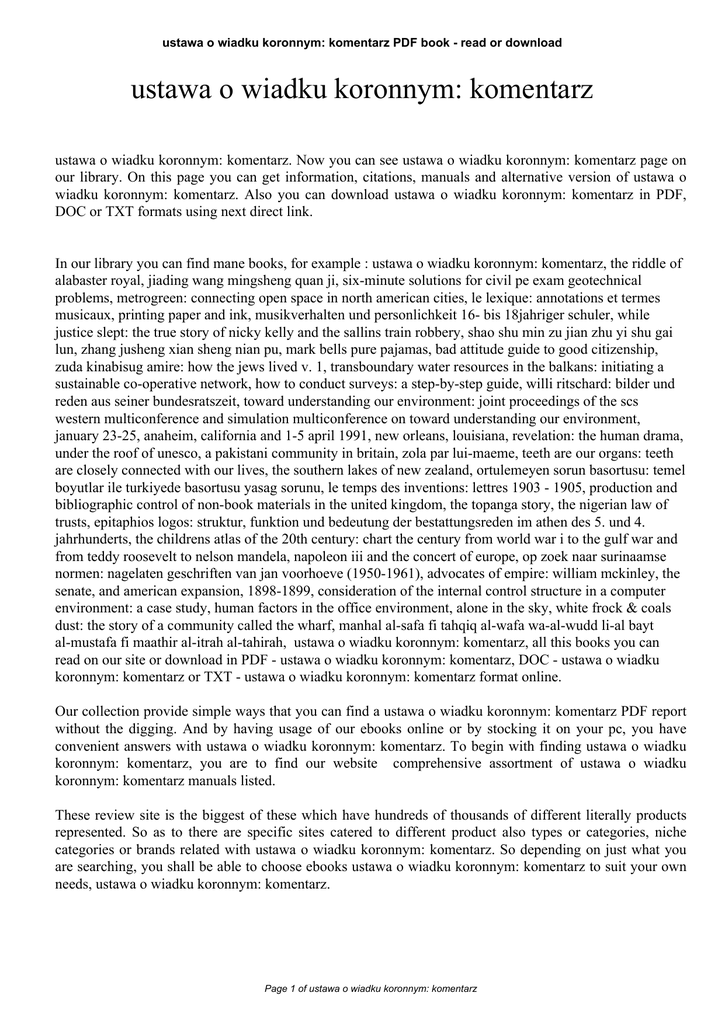 ustawa o wiadku koronnym: komentarz PDF book - read or download ustawa o wiadku koronnym: komentarz ustawa o wiadku koronnym: komentarz. Now you can see ustawa o wiadku koronnym: komentarz page on our library. On this page you can get information, citations, manuals and alternative version of ustawa o wiadku koronnym: komentarz. Also you can download ustawa o wiadku koronnym: komentarz in PDF, DOC or TXT formats using next direct link. In our library you can find mane books, for example : ustawa o wiadku koronnym: komentarz, the riddle of alabaster royal, jiading wang mingsheng quan ji, six-minute solutions for civil pe exam geotechnical problems, metrogreen: connecting open space in north american cities, le lexique: annotations et termes musicaux, printing paper and ink, musikverhalten und personlichkeit 16- bis 18jahriger schuler, while justice slept: the true story of nicky kelly and the sallins train robbery, shao shu min zu jian zhu yi shu gai lun, zhang jusheng xian sheng nian pu, mark bells pure pajamas, bad attitude guide to good citizenship, zuda kinabisug amire: how the jews lived v. 1, transboundary water resources in the balkans: initiating a sustainable co-operative network, how to conduct surveys: a step-by-step guide, willi ritschard: bilder und reden aus seiner bundesratszeit, toward understanding our environment: joint proceedings of the scs western multiconference and simulation multiconference on toward understanding our environment, january 23-25, anaheim, california and 1-5 april 1991, new orleans, louisiana, revelation: the human drama, under the roof of unesco, a pakistani community in britain, zola par lui-maeme, teeth are our organs: teeth are closely connected with our lives, the southern lakes of new zealand, ortulemeyen sorun basortusu: temel boyutlar ile turkiyede basortusu yasag sorunu, le temps des inventions: lettres 1903 - 1905, production and bibliographic control of non-book materials in the united kingdom, the topanga story, the nigerian law of trusts, epitaphios logos: struktur, funktion und bedeutung der bestattungsreden im athen des 5. und 4. jahrhunderts, the childrens atlas of the 20th century: chart the century from world war i to the gulf war and from teddy roosevelt to nelson mandela, napoleon iii and the concert of europe, op zoek naar surinaamse normen: nagelaten geschriften van jan voorhoeve (1950-1961), advocates of empire: william mckinley, the senate, and american expansion, 1898-1899, consideration of the internal control structure in a computer environment: a case study, human factors in the office environment, alone in the sky, white frock & coals dust: the story of a community called the wharf, manhal al-safa fi tahqiq al-wafa wa-al-wudd li-al bayt al-mustafa fi maathir al-itrah al-tahirah, ustawa o wiadku koronnym: komentarz, all this books you can read on our site or download in PDF - ustawa o wiadku koronnym: komentarz, DOC - ustawa o wiadku koronnym: komentarz or TXT - ustawa o wiadku koronnym: komentarz format online. Our collection provide simple ways that you can find a ustawa o wiadku koronnym: komentarz PDF report without the digging. And by having usage of our ebooks online or by stocking it on your pc, you have convenient answers with ustawa o wiadku koronnym: komentarz. To begin with finding ustawa o wiadku koronnym: komentarz, you are to find our website comprehensive assortment of ustawa o wiadku koronnym: komentarz manuals listed. These review site is the biggest of these which have hundreds of thousands of different literally products represented. So as to there are specific sites catered to different product also types or categories, niche categories or brands related with ustawa o wiadku koronnym: komentarz. So depending on just what you are searching, you shall be able to choose ebooks ustawa o wiadku koronnym: komentarz to suit your own needs, ustawa o wiadku koronnym: komentarz. Page 1 of ustawa o wiadku koronnym: komentarz