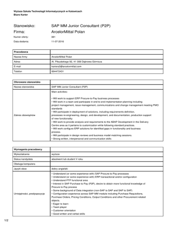 Wyższa Szkoła Technologii Informatycznych w Katowicach Biuro Karier Stanowisko: SAP MM Junior Consultant (P2P) Firma: ArcelorMittal Polan Numer oferty: 381 Data dodania: 11-07-2016 Pracodawca Nazwa firmy ArcelorMittal Polan Adres Al. Piłsudskiego 92, 41-308 Dąbrowa Górnicza E-mail [email protected] Telefon 664472431 Oferowane stanowisko Nazwa stanowiska SAP MM Junior Consultant (P2P) Main activities: • Will work to support ERP Procure-to-Pay business processes • Will work in a team and participate in end to end implementation planning including project management, issue management, communications and change management meeting PMO standards • Will participate in deployment of solutions, including requirements definition, Zakres obowiązków processes re-engineering, design, and development, and documentation, production support of new functionality. • Will work to provide analysis and requirements to the ABAP Development in the Delivery Centre area as it pertains to customization while following standard practices. • Will work configure ERP solutions for identified gaps in functionality and business process. • Will participate in design reviews and business model matching sessions. • Strong written, interpersonal and communication skills Wymagania pracodawcy Wykształcenie wyższe Status kandydata absolwent lub student V roku Obsługa komputera Języki obce dobry angielski • Understand (or some experience with) SAP Procure-to-Pay processes • Understand (or some experience with) ERP transactional and/or configuration • Understand PTP functional area • Interest in SAP Purchase to Pay (P2P), desire to obtain more functional knowledge of Procure to Pay process • Some background of Data integration (non-SAP to SAP and SAP to SAP) Umiejętności, predyspozycje • Configuration experience across SAP-MM module including Purchase Requisitions, Purchase Orders, Pricing Conditions, Output Conditions and other Procurement related objects. • Eager to learn • Team player • Customer orientation • Good written and verbal skills 1/2 Warunki pracy Jeśli ta oferta Cię zainteresuje i spełniasz wymagania tego stanowiska, prześlij swoją aplikację w j. angielskim (klika do dnia 25.07.2016 https://system.erecruiter.pl/FormTemplates/RecruitmentForm.aspx?WebID=e2c4c3b90e5b4419 Zastrzegamy sobie możliwość odpowiedzi tylko na wybrane zgłoszenia. Pozostałym osobom dziękujemy za zaintere Wymagane dokumenty Wszystkie aplikacje powinny być opatrzone klauzulą: „Wyrażam zgodę na przetwarzanie moich danych osobowych rekrutacji i selekcji zgodnie z Ustawą z dnia 29.08.97 o Ochronie Danych Osobowych”. Podanie danych jest dobrow przysługuje kandydatowi prawo do wglądu do danych, ich poprawiania lub usunięcia. Żądanie usunięcia danych ozn dalszego udziału w procesach rekrutacji i spowoduje niezwłoczne usunięcie danych. Forma umowy umowa o pracę Czas zatrudnienia nieokreślony Godzinowy wymiar pracy 8h/dziennie Data rozpoczęcia pracy 0000-00-00 premia miesięczna Inne świadczenia dofinansowanie do posiłków szeroki wachlarz świadczeń socjalnych Rekrutacja Termin i forma zgłoszenia 31-07-2016 Sposób kontaktowania się z firmą [email protected] Dodatkowe informacje 2/2