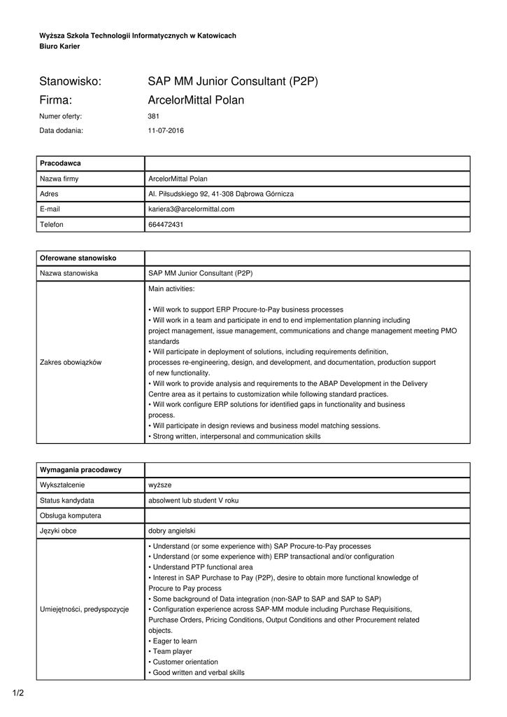 SAP MM Junior Consultant (P2P) - Wyższa Szkoła Technologii