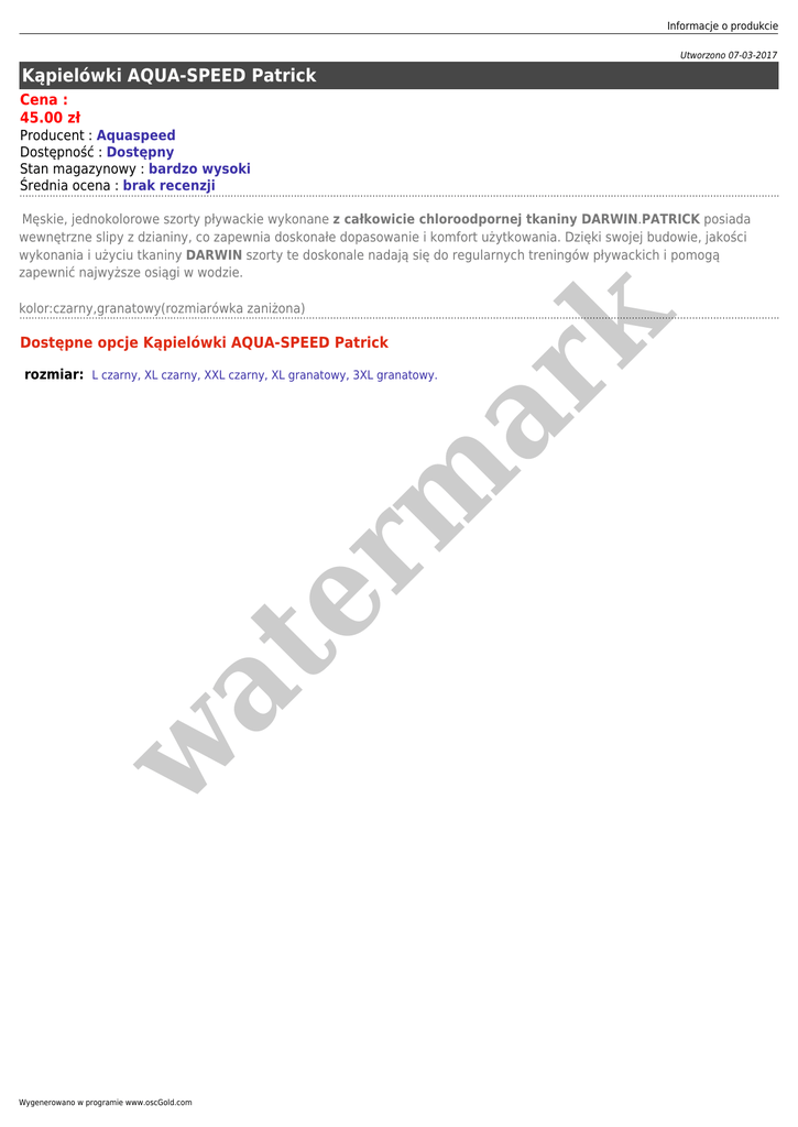 Informacje o produkcie Utworzono 07-03-2017 Kąpielówki AQUA-SPEED Patrick Cena : 45.00 zł Producent : Aquaspeed Dostępność : Dostępny Stan magazynowy : bardzo wysoki Średnia ocena : brak recenzji Męskie, jednokolorowe szorty pływackie wykonane z całkowicie chloroodpornej tkaniny DARWIN.PATRICK posiada wewnętrzne slipy z dzianiny, co zapewnia doskonałe dopasowanie i komfort użytkowania. Dzięki swojej budowie, jakości wykonania i użyciu tkaniny DARWIN szorty te doskonale nadają się do regularnych treningów pływackich i pomogą zapewnić najwyższe osiągi w wodzie. er m ar k kolor:czarny,granatowy(rozmiarówka zaniżona) Dostępne opcje Kąpielówki AQUA-SPEED Patrick w at rozmiar: L czarny, XL czarny, XXL czarny, XL granatowy, 3XL granatowy. Wygenerowano w programie www.oscGold.com
