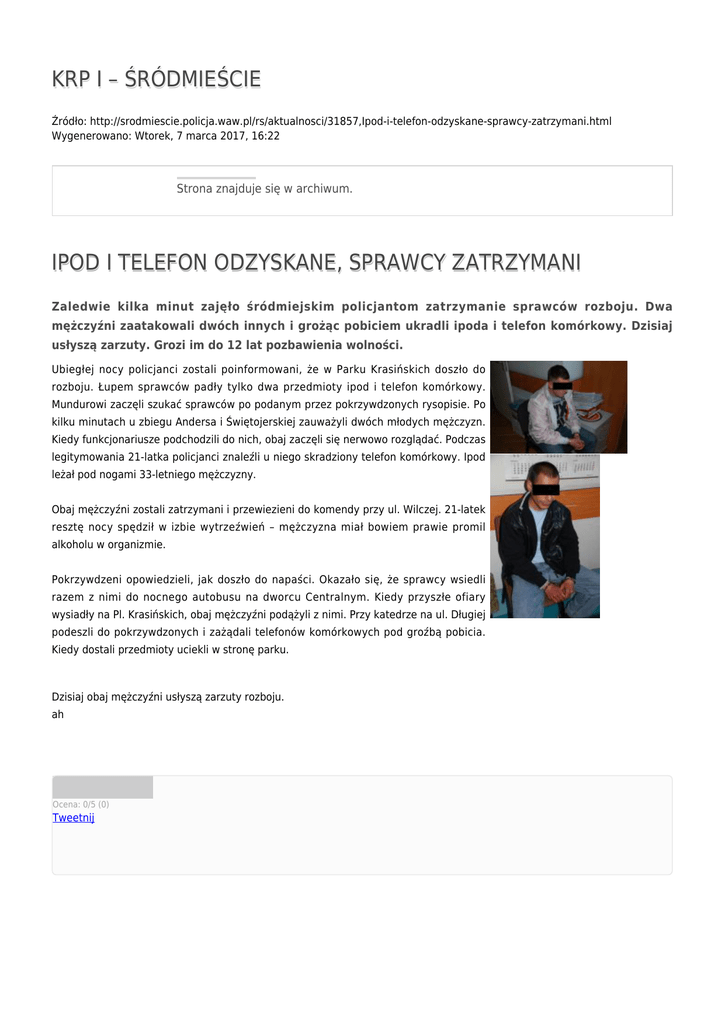 KRP I – ŚRÓDMIEŚCIE Źródło: http://srodmiescie.policja.waw.pl/rs/aktualnosci/31857,Ipod-i-telefon-odzyskane-sprawcy-zatrzymani.html Wygenerowano: Wtorek, 7 marca 2017, 16:22 Strona znajduje się w archiwum. IPOD I TELEFON ODZYSKANE, SPRAWCY ZATRZYMANI Zaledwie kilka minut zajęło śródmiejskim policjantom zatrzymanie sprawców rozboju. Dwa mężczyźni zaatakowali dwóch innych i grożąc pobiciem ukradli ipoda i telefon komórkowy. Dzisiaj usłyszą zarzuty. Grozi im do 12 lat pozbawienia wolności. Ubiegłej nocy policjanci zostali poinformowani, że w Parku Krasińskich doszło do rozboju. Łupem sprawców padły tylko dwa przedmioty ipod i telefon komórkowy. Mundurowi zaczęli szukać sprawców po podanym przez pokrzywdzonych rysopisie. Po kilku minutach u zbiegu Andersa i Świętojerskiej zauważyli dwóch młodych mężczyzn. Kiedy funkcjonariusze podchodzili do nich, obaj zaczęli się nerwowo rozglądać. Podczas legitymowania 21-latka policjanci znaleźli u niego skradziony telefon komórkowy. Ipod leżał pod nogami 33-letniego mężczyzny. Obaj mężczyźni zostali zatrzymani i przewiezieni do komendy przy ul. Wilczej. 21-latek resztę nocy spędził w izbie wytrzeźwień – mężczyzna miał bowiem prawie promil alkoholu w organizmie. Pokrzywdzeni opowiedzieli, jak doszło do napaści. Okazało się, że sprawcy wsiedli razem z nimi do nocnego autobusu na dworcu Centralnym. Kiedy przyszłe ofiary wysiadły na Pl. Krasińskich, obaj mężczyźni podążyli z nimi. Przy katedrze na ul. Długiej podeszli do pokrzywdzonych i zażądali telefonów komórkowych pod groźbą pobicia. Kiedy dostali przedmioty uciekli w stronę parku. Dzisiaj obaj mężczyźni usłyszą zarzuty rozboju. ah Ocena: 0/5 (0) Tweetnij