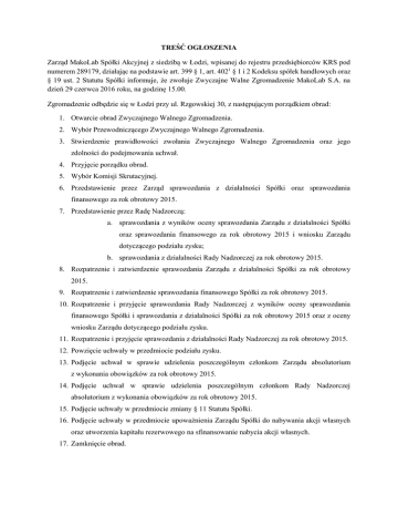 TREŚĆ OGŁOSZENIA Zarząd MakoLab Spółki Akcyjnej z siedzibą w Łodzi, wpisanej do rejestru przedsiębiorców KRS pod numerem 289179, działając na podstawie art. 399 § 1, art. 4021 § 1 i 2 Kodeksu spółek handlowych oraz § 19 ust. 2 Statutu Spółki informuje, że zwołuje Zwyczajne Walne Zgromadzenie MakoLab S.A. na dzień 29 czerwca 2016 roku, na godzinę 15.00. Zgromadzenie odbędzie się w Łodzi przy ul. Rzgowskiej 30, z następującym porządkiem obrad: 1. Otwarcie obrad Zwyczajnego Walnego Zgromadzenia. 2. Wybór Przewodniczącego Zwyczajnego Walnego Zgromadzenia. 3. Stwierdzenie prawidłowości zwołania Zwyczajnego Walnego Zgromadzenia oraz jego zdolności do podejmowania uchwał. 4. Przyjęcie porządku obrad. 5. Wybór Komisji Skrutacyjnej. 6. Przedstawienie przez Zarząd sprawozdania z działalności Spółki oraz sprawozdania finansowego za rok obrotowy 2015. 7. Przedstawienie przez Radę Nadzorczą: a. sprawozdania z wyników oceny sprawozdania Zarządu z działalności Spółki oraz sprawozdania finansowego za rok obrotowy 2015 i wniosku Zarządu dotyczącego podziału zysku; b. sprawozdania z działalności Rady Nadzorczej za rok obrotowy 2015. 8. Rozpatrzenie i zatwierdzenie sprawozdania Zarządu z działalności Spółki za rok obrotowy 2015. 9. Rozpatrzenie i zatwierdzenie sprawozdania finansowego Spółki za rok obrotowy 2015. 10. Rozpatrzenie i przyjęcie sprawozdania Rady Nadzorczej z wyników oceny sprawozdania finansowego Spółki i sprawozdania z działalności Spółki za rok obrotowy 2015 oraz z oceny wniosku Zarządu dotyczącego podziału zysku. 11. Rozpatrzenie i przyjęcie sprawozdania z działalności Rady Nadzorczej za rok obrotowy 2015. 12. Powzięcie uchwały w przedmiocie podziału zysku. 13. Podjęcie uchwał w sprawie udzielenia poszczególnym członkom Zarządu absolutorium z wykonania obowiązków za rok obrotowy 2015. 14. Podjęcie uchwał w sprawie udzielenia poszczególnym członkom Rady Nadzorczej absolutorium z wykonania obowiązków za rok obrotowy 2015. 15. Podjęcie uchwały w przedmiocie zmiany § 11 Statutu Spółki. 16. Podjęcie uchwały w przedmiocie upoważnienia Zarządu Spółki do nabywania akcji własnych oraz utworzenia kapitału rezerwowego na sfinansowanie nabycia akcji własnych. 17. Zamknięcie obrad. Procedury dotyczące uczestnictwa i wykonania prawa głosu Zgodnie z art. 401 § 1 Kodeksu spółek handlowych (dalej ksh), akcjonariusz lub akcjonariusze reprezentujący co najmniej jedną dwudziestą kapitału zakładowego mogą żądać umieszczenia określonych spraw w porządku obrad Walnego Zgromadzenia. Żądanie powinno zostać zgłoszone Zarządowi w formie pisemnej (drogą pocztową lub faksową) nie później niż do dnia 8 czerwca 2016 r. i powinno zawierać uzasadnienie lub projekt uchwały dotyczącej proponowanego punktu porządku obrad. Dopuszczalnym jest, aby żądanie zostało złożone w postaci elektronicznej. W tym celu, stosowne żądanie powinno zostać przesłane na adres poczty elektronicznej Spółki ([email protected]). Zgodnie z art. 401 § 4 ksh akcjonariusz lub akcjonariusze reprezentujący co najmniej jedną dwudziestą kapitału zakładowego mogą przed dniem 29 czerwca 2016 r. zgłosić Spółce na piśmie (drogą pocztową lub faksową) lub przy wykorzystaniu środków komunikacji elektronicznej, projekty uchwał dotyczące spraw wprowadzonych do porządku obrad Walnego Zgromadzenia lub sprawy, które mają zostać wprowadzone do porządku obrad. Projekty uchwał w formie elektronicznej powinny zostać przesłane na adres e-mail Spółki ([email protected]). Spółka niezwłocznie ogłasza otrzymane projekty uchwał na swojej stronie internetowej. Realizacja uprawnień wynikających z art. 401 § 1 oraz § 4 ksh, w odniesieniu do akcji na okaziciela, może nastąpić, jeżeli podmioty uprawnione: w przypadku akcji zdematerializowanych – przekażą drogą pocztową, faksową, elektroniczną lub złożą w Spółce, imienne świadectwo depozytowe (obowiązujące w dniu realizacji uprawnienia) wraz z odpowiednim dokumentem identyfikującym uprawnionego, w przypadku akcji niezdematerializowanych – złożą w Spółce dokumenty akcji lub zaświadczenie wydane na dowód złożenia akcji u notariusza, w banku lub firmie inwestycyjnej mających siedzibę lub oddział na terytorium Unii Europejskiej lub państwa będącego stroną umowy o Europejskim Obszarze Gospodarczym. Realizacja uprawnień wynikających z art. 401 § 1 oraz § 4 ksh, w przypadku akcji imiennych i świadectw tymczasowych oraz zastawników i użytkowników, którym przysługuje prawo głosu, może nastąpić, jeżeli podmioty te wpisane będą do księgi akcyjnej w dniu realizacji uprawnień wskazanych w art. 401 § 1 oraz § 4 ksh. Zgodnie z art. 401 § 5 ksh każdy akcjonariusz może podczas Walnego Zgromadzenia zgłaszać projekty uchwał dotyczące spraw wprowadzonych do porządku obrad. Akcjonariusz będący osobą fizyczną może uczestniczyć w Walnym Zgromadzeniu i wykonywać prawo głosu osobiście lub przez pełnomocnika. Akcjonariusz niebędący osobą fizyczną może uczestniczyć w Walnym Zgromadzeniu oraz wykonywać prawo głosu przez osobę uprawnioną do składania oświadczeń woli w jego imieniu lub przez pełnomocnika. Prawo do reprezentowania akcjonariusza niebędącego osobą fizyczną powinno wynikać z okazanego przy sporządzaniu listy obecności odpisu z właściwego rejestru (składanego w oryginale lub kopii potwierdzonej za zgodność z oryginałem przez notariusza), ewentualnie ciągu pełnomocnictw. Osoba lub osoby udzielające pełnomocnictwa w imieniu akcjonariusza niebędącego osobą fizyczną powinny być uwidocznione w aktualnym odpisie z właściwego dla danego akcjonariusza rejestru. Pełnomocnik głosuje zgodnie z instrukcjami udzielonymi przez akcjonariusza. Wzór formularza do wykorzystania przez akcjonariusza w przypadku głosowania przez pełnomocnika zamieszczony jest na stron