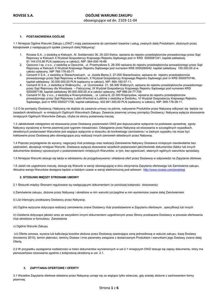 ROVESE S.A. OGÓLNE WARUNKI ZAKUPU obowiązujące od dn. 2103-11-04 POSTANOWIENIA OGÓLNE 1. 1.1 Niniejsze Ogólne Warunki Zakupu („OWZ”) mają zastosowanie do zamówień towarów i usług, zwanych dalej Produktami, złożonych przez którąkolwiek z następujących spółek (zwanych dalej Nabywcą): Rovese S.A., z siedzibą w Kielcach, Al. Solidarności 36, 25-323 Kielce, wpisana do rejestru przedsiębiorców prowadzonego przez Sąd Rejonowy w Kielcach X Wydział Gospodarczy Krajowego Rejestru Sądowego pod nr KRS 0000081341, kapitał zakładowy 81.144.015,90 PLN (wpłacony w całości), NIP: 564-000-16-66 Opoczno I sp. z o.o., z siedzibą w Opocznie, ul. Przemysłowa 5, 26-300 wpisana do rejestru przedsiębiorców prowadzonego przez Sąd Rejonowy w Kielcach X Wydział Krajowego Rejestru Sądowego pod numerem KRS 0000280042, kapitał zakładowy 150.000,00 zł w całości opłacony, NIP 768-176-93-71 Cersanit II S.A., z siedzibą w Starachowicach, ul. Józefa Bema 2, 27-200 Starachowice, wpisana do rejestru przedsiębiorców prowadzonego przez Sąd Rejonowy w Kielcach, X Wydział Gospodarczy Krajowego Rejestru Sądowego pod nr KRS 0000070746, kapitał zakładowy: 30.000.000,00 PLN (wpłacony w całości), NIP: 664-182-07-11, Cersanit III S.A., z siedzibą w Wałbrzychu, , ul. Uczniowska 21, 58-306 Wałbrzych, wpisana do rejestru przedsiębiorców prowadzonego przez Sąd Rejonowy dla Wrocławia – Fabrycznej ,IX Wydział Gospodarczy Krajowego Rejestru Sądowego pod numerem KRS 0000087138, kapitał zakładowy 90.000.000,00 zł w całości opłacony, NIP 886-24-77-709 Cersanit IV Sp. z o.o., z siedzibą w Krasnymstawie, , ul. Leśna 6, 22-300 Krasnystaw, wpisana do rejestru przedsiębiorców prowadzonego przez Sąd Rejonowy Lublin-Wschód w Lublinie z siedzibą w Świdniku, VI Wydział Gospodarczy Krajowego Rejestru Sądowego, pod nr KRS 0000271736, kapitał zakładowy: 402.941.500,00 PLN (wpłacony w całości), NIP: 959-176-28-11, 1. 2. 3. 4. 5. 1.2 O ile pomiędzy Dostawcą i Nabywcą nie dojdzie do zawarcia umowy na piśmie, nabywanie Produktów przez Nabywcę odbywać się będzie na zasadach określonych w niniejszych Ogólnych Warunkach Zakupu. Zawarcie pisemnej umowy pomiędzy Dostawcą i Nabywcą wyłącza stosowanie niniejszych Ogólnych Warunków Zakupu, chyba że strony postanowią inaczej. 1.3 Jakiekolwiek odstępstwo od stosowania przez Dostawcę postanowień OWZ jest dopuszczalne wyłącznie na podstawie uprzedniej zgody Nabywcy wyrażonej w formie pisemnej pod rygorem nieważności. Odstąpienie przez Nabywcę od stosowania w szczególnych wypadkach, określonych postanowień Warunków jest wiążące wyłącznie w stosunku do konkretnego zamówienia i w żadnym wypadku nie może być traktowane przez Dostawcę jako obowiązujące przy realizacji innych zamówień składanych przez Nabywcę. 1.4 Poprzez przystąpienie do wyceny, negocjacji i/lub przetargu oraz realizacji Zamówienia Nabywcy Dostawca niniejszym nieodwołalnie bez zastrzeżeń, akceptuje niniejsze Warunki. Dostawca wyłącza stosowanie wszelkich postanowień jakichkolwiek dokumentów (faktur lub innych dokumentów dostawy) sprzecznych z postanowieniami niniejszych Warunków, w tym, bez ograniczeń, własnych ogólnych warunków sprzedaży. 1.5 Niniejsze Warunki stosuje się także w odniesieniu do przygotowywania i składania ofert przez Dostawcę w odpowiedzi na Zapytanie ofertowe. 1.6 Jeżeli nie uzgodniono inaczej, stosuje się Warunki w wersji obowiązującej w dniu otrzymania Zapytania ofertowego lub Zamówienia zakupu. Aktualna wersja Warunków dostępna będzie w każdym czasie w wersji elektronicznej pod adresem http://www.rovese.com/przetargi 2. STOSUNKI MIĘDZY STRONAMI UMOWY 2.1 Stosunki między Stronami regulowane są następującymi dokumentami (w poniższej kolejności stosowania): i) Zamówienie zakupu, złożone przez Nabywcę i określone w nim warunki szczególne w nim wymienione zwane dalej Zamówieniem ii) List intencyjny przekazany Dostawcy przez Nabywcę. (iii) Ogólne wytyczne dotyczące realizacji zamówienia znane Dostawcy i/lub przedstawione w Zapytaniu ofertowym , specyfikacji lub innych iv) Ustalenia dotyczące jakości wraz ze wszystkimi innymi dokumentami uzgodnionymi przez Strony przekazane Dostawcy w procesie ofertowania i/lub określone w formularzu Zamówienia v) Ogólne Warunki Zakupu (vi) Oferta cenowa, wycena lub kalkulacja kosztów złożona przez Dostawcę zawierająca cenę jednostkową w walucie zakupu, bazę Dostawy (Incoterms 2010), termin płatności, terminy Dostaw i inne parametry związane z dostarczanym Produktem i warunkami jego Dostawy zwana dalej Ofertą. 2.2 W przypadku wystąpienia rozbieżności w treści dokumentów wymienionych w ust 2.1 niniejszych OWZ stosuje się zapisy dokumentu, który ma pierwszeństwo stosowania zgodnie z kolejnością określoną w ust. 2.1. 3. ZAPYTANIA OFERTOWE I OFERTY 3.1 Wszelkie Zapytania ofertowe składane przez Nabywcę uznaje się za wiążące tylko wówczas, gdy zostały złożone z zachowaniem formy pisemnej. Strona 1 z 6 ROVESE S.A. OGÓLNE WARUNKI ZAKUPU obowiązujące od dn. 2103-11-04 3.2 W Ofercie należy wyraźnie określić walutę i cenę. Wszelkie ceny są cenami netto, nieuwzględniającymi wartości podatku od towarów i usług według obowiązujących przepisów prawa, chyba że wyraźnie zastrzeżono inaczej. Przygotowanie Oferty przez Dostawcę jest w każdym przypadku bezpłatne, a wszelkie koszty które mogły powstać w trakcie jej przygotowania pokrywa w całości Dostawca. 3.3 Jeżeli nie zastrzeżono inaczej, ceny wskazane w Ofercie zawierają całkowity koszt przygotowania, zaprojektowania, wykonania oraz montażu Produktów (jeśli dotyczy), a także koszty załadunku, transportu, wysyłki, opakowania, ubezpieczenia, należności celnych i wyładunku do momentu wydania Nabywcy Produktów w miejscu dostawy wskazanym przez Nabywcę, a także wszelkiej niezbędnej dokumentacji. 3.4 Zapytania ofe