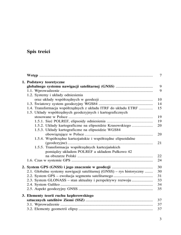 Spis treci Wstêp ................................................................................................................. 7 1. Podstawy teoretyczne globalnego systemu nawigacji satelitarnej (GNSS) ..................................... 1.1. Wprowadzenie ............................................................................................ 1.2. Systemy i uk³ady odniesienia oraz uk³ady wspó³rzêdnych w geodezji ..................................................... 1.3. wiatowy system geodezyjny WGS84 ...................................................... 1.4. Transformacja wspó³rzêdnych z uk³adu ITRF do uk³adu ETRF .............. 1.5. Uk³ady wspó³rzêdnych geodezyjnych i kartograficznych stosowane w Polsce .................................................................................... 1.5.1. Sieæ POLREF, elipsoidy odniesienia .............................................. 1.5.2. Uk³ady kartograficzne na elipsoidzie Krasowskiego ..................... 1.5.3. Uk³ady kartograficzne na elipsoidzie WGS84 obowi¹zuj¹ce w Polsce .................................................................... 1.5.4. Wspó³rzêdne kartezjañskie i wspó³rzêdne elipsoidalne (geodezyjne) ..................................................................................... 1.5.5. Transformacja wspó³rzêdnych kartezjañskich pomiêdzy uk³adem POLREF a uk³adem Pu³kowo 42 na obszarze Polski ........................................................................... 1.6. Czas w systemie GPS ................................................................................. 22 24 2. System GPS (GNSS) i jego znaczenie w geodezji ......................................... 2.1. Globalne systemy nawigacji satelitarnej (GNSS) – rys historyczny ........ 2.2. System GPS – ewolucja segmentu satelitarnego ....................................... 2.3. System GLONASS – stan aktualny i perspektywy rozwoju ..................... 2.4. System Galileo ............................................................................................ 2.5. Aspekt geodezyjny GNSS .......................................................................... 30 30 31 33 34 35 3. Elementy teorii ruchu keplerowskiego sztucznych satelitów Ziemi (SSZ) ................................................................... 3.1. Wprowadzenie ............................................................................................ 3.2. Elementy geometrii elipsy .......................................................................... 37 37 37 9 9 10 14 15 19 19 20 20 21 3 3.3. 3.4. 3.5. 3.6. 3.7. 3.8. 3.9. Rozwi¹zanie równania ruchu keplerowskiego, prawa Keplera ................ Prawo zachowania energii w ruchu keplerowskim ................................... Ruch satelity w p³aszczynie orbity ........................................................... Po³o¿enie SSZ w przestrzeni ...................................................................... Po³o¿enie satelity GPS w uk³adzie geocentrycznym ................................ Wspó³rzêdne satelity GPS w uk³adzie horyzontalnym ............................. Transformacja b³êdów rednich wspó³rzêdnych punktu (σX, σY, σZ) z uk³adu geocentrycznego kartezjañskiego na uk³ad geodezyjny (σϕ, σλ, σh) ............................................................... 4. Wybrane zadania geodezyjne wykonywane z wykorzystaniem techniki GPS ..................................................................... 4.1. Wykorzystanie techniki GPS do wyznaczenia undulacji quasi-geoidy .................................................... 4.1.1. Wprowadzenie ................................................................................. 4.1.2. Metody wyznaczenia odstêpu lokalnej quasi-geoidy od elipsoidy oraz sk³adowych odchylenia linii pionu .................... 4.1.3. Problemy wyznaczenia i wykorzystania precyzyjnego lokalnego modelu quasi-geoidy ............................... 4.1.4. Eksperymenty pomiarowe ............................................................... 4.1.5. Porównanie lokalnego modelu quasi-geoidy z modelami krajowymi .................................................................... 4.1.6. Wyznaczenie wspó³rzêdnych punktów niedostêpnych na podstawie pomiarów k¹towych i GPS z uwzglêdnieniem wp³ywu odchylenia linii pionu ......................... 4.2. Przyk³ady zastosowania techniki GPS w badaniach deformacji terenu na obszarach górniczych ............................................................................ 4.2.1. Wprowadzenie ................................................................................. 4.2.2. Nawi¹zanie sieci niwelacyjnych za pomoc¹ techniki GPS ............ 4.2.3. Kontrolne pomiary GPS w sieciach niwelacyjnych ....................... 4.2.4. Adaptacja sieci niwelacyjnych do wykonywania niwelacji za pomoc¹ techniki GPS .................................................................. 4.2.5. Monitorowanie sta³oci punktów nawi¹zania sieci niwelacyjnej za pomoc¹ pomiarów GPS .............................................................. 4.2.6. Wykorzystanie techniki GPS do badania deformacji powierzchni terenu na obszarze górniczym .................................................................... 4.3. Przyk³ady wykorzystania techniki GPS do badania dok³adnoci wspó³rzêdnych punktów osnów geodezyjnych ................................................................... 4.3.1. Transformacja wspó³rzêdnych uzyskanych za pomoc¹ pomiarów GPS do uk³adu lokalnego ............................ 4 40 45 46 49 50 57 61 64 64 64 65 70 71 81 82 86 86 88 93 93 94 97 99 99 4.3.2. Badanie dok³adnoci osnowy poziomej II klasy ............................ 4.3.3. Wykorzystanie stacji permanentnej KRAW przy weryfikacji dok³adnoci transformacji osnowy klasy III z uk³adu lokalnego krakowskiego do uk³adu 2000 .................... 4.3.4. Porównanie wyników z pomiarów GPS uzyskanych metod¹