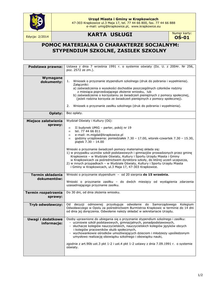 Urząd Miasta i Gminy w Krapkowicach 47-303 Krapkowice ul.3 Maja 17, tel. 77 44 66 800, fax. 77 44 66 888 e-mail: [email protected], www.krapkowice.eu KARTA USŁUGI Edycja: 2/2014 Numer karty: OŚ-01 POMOC MATERIALNA O CHARAKTERZE SOCJALNYM: STYPENDIUM SZKOLNE, ZASIŁEK SZKOLNY Podstawa prawna: Wymagane dokumenty: Opłaty: Miejsce załatwienia sprawy: Ustawa z dnia 7 września 1991 r. o systemie oświaty (Dz. U. z 2004r. Nr 256, poz. 2572 ze zm.). 1. Wniosek o przyznanie stypendium szkolnego (druk do pobrania i wypełnienia). Załączniki: a) zaświadczenia o wysokości dochodów poszczególnych członków rodziny z miesiąca poprzedzającego złożenie wniosku, lub b) zaświadczenie o korzystaniu ze świadczeń pieniężnych z pomocy społecznej, (jeżeli rodzina korzysta ze świadczeń pieniężnych z pomocy społecznej). 2. Wniosek o przyznanie zasiłku szkolnego (druk do pobrania i wypełnienia). Bez opłaty. Wydział Oświaty i Kultury (Oś): • • • • II budynek UMiG – parter, pokój nr 19 tel. 77 44 66 811 e-mail: [email protected] godziny urzędowania: poniedziałek 7.30 – 17.00, wtorek-czwartek 7.30 – 15.30, piątek 7.30 – 14.00 Wnioski o przyznanie świadczeń pomocy materialnej składa się: 1) w przypadku uczniów szkół podstawowych i gimnazjów prowadzonych przez gminę Krapkowice – w Wydziale Oświaty, Kultury i Sportu Urzędu Miasta i Gminy w Krapkowicach za pośrednictwem dyrektora szkoły, do której uczeń uczęszcza, 2) w innych przypadkach – w Wydziale Oświaty, Kultury i Sportu Urzędu Miasta i Gminy w Krapkowicach, ul.3 Maja 17, 47-303 Krapkowice. Termin składania dokumentów: Termin rozpatrzenia sprawy: Tryb odwoławczy: Uwagi i dodatkowe informacje: Wnioski o przyznanie stypendium – od 20 sierpnia do 15 września. Wnioski o przyznanie zasiłku – do dwóch miesięcy od wystąpienia zdarzenia uzasadniającego przyznanie zasiłku. Do 30 dni, od dnia złożenia wniosku. Od decyzji odmownej przysługuje odwołanie do Samorządowego Kolegium Odwoławczego w Opolu za pośrednictwem Burmistrza Krapkowic w terminie do 14 dni od dnia jej doręczenia. Odwołanie należy składać w sekretariacie Urzędu. Osoby uprawnione do ubiegania się o przyznanie stypendium szkolnego i zasiłku: - uczniowie szkół podstawowych, gimnazjalnych, ponadpodstawowych, - słuchacze kolegiów nauczycielskich, nauczycielskich kolegiów języków obcych i kolegiów pracowników służb społecznych, - wychowankowie ośrodków umożliwiających dzieciom i młodzieży upośledzonym umysłowo realizację obowiązku szkolnego i obowiązku nauki, zgodnie z art.90b ust.3 pkt 1-2 i ust.4 pkt 1-2 ustawy z dnia 7.09.1991 r. o systemie oświaty. 1/2 Uwagi i dodatkowe informacje: Stypendium szkolne może otrzymać uczeń (słuchacz, wychowanek) znajdujący się trudnej sytuacji materialnej wynikającej z niskich dochodów na osobę w rodzinie, w szczególności gdy w rodzinie tej występuje bezrobocie, niepełnosprawność, ciężka lub długotrwała choroba, wielodzietność, brak umiejętności wypełniania funkcji opiekuńczo-wychowawczych, alkoholizm lub narkomania, a także gdy rodzina jest niepełna lub wystąpiło zdarzenie losowe. O przyznanie stypendium może się ubiegać uczeń (słuchacz, wychowanek) zamieszkały na terenie gminy Krapkowice, w rodzinie którego miesięczna wysokość dochodu na osobę w rodzinie nie przekracza kwoty, o której mowa w art. 6 ust. 2 pkt 2 ustawy z dnia 28 listopada 2003 r. o świadczeniach rodzinnych (Dz. U. z 2006 r. Nr 139, poz. 992 ze zm.) Stypendium szkolne udziela się uczniom w formie: 1) całkowitego lub częściowego pokrycia kosztów udziału w zajęciach edukacyjnych, w tym wyrównawczych, wykraczających poza zajęcia realizowane w szkole w ramach planu nauczania, 2) całkowitego lub częściowego pokrycia kosztów udziału w zajęciach edukacyjnych realizowanych poza szkołą, w szczególności: kursy językowe, informatyczno-komputerowe, zajęcia logopedyczne, 3) pomocy rzeczowej o charakterze edukacyjnym, w szczególności zakupu: a) podręczników szkolnych, lektur, b) pomocy dydaktycznych typu encyklopedie lub słowniki, c) materiałów do wykonania pracy dyplomowej w szkole zawodowej, d) wyposażenia szkolnego typu: - tornister lub plecak szkolny, - przybory szkolne, - strój sportowy, obuwie sportowe na zajęcia wychowania fizycznego, e) materiały dydaktyczne dla niepełnosprawnych uczniów, 4) całkowitego lub częściowego pokrycia kosztów związanych z pobieraniem nauki poza miejscem zamieszkania, ale tylko w stosunku do uczniów szkół ponadgimnazjalnych oraz słuchaczy kolegiów nauczycielskich, nauczycielskich kolegiów języków obcych i kolegiów pracowników służb społecznych, w szczególności na pokrycie kosztów: a) zakwaterowania poza miejscem zamieszkania, b) posiłków w stołówce szkolnej lub prowadzonej przez inny podmiot, c) dojazdu do szkoły, kolegium, d) czesnego za naukę w szkole niepublicznej posiadającej uprawnienia szkoły publicznej, a w przypadku szkół ponadgimnazjalnych lub kolegiów również bez uprawnień szkoły publicznej, e) innych opłat wymaganych obowiązkowo przez szkołę, kolegium. Zasiłek szkolny może otrzymać uczeń (słuchacz, wychowanek) znajdujący się przejściowo w trudnej sytuacji określonej w art.90 e ust.1 ustawy, z powodu zdarzenia losowego. Za zdarzenie losowe uznaje się, w szczególności: 1) całkowitą lub częściową utratę przez rodzinę ucznia, słuchacza mienia wskutek powodzi, pożaru, klęski żywiołowej, kradzieży, 2) wypadek członka rodziny, wskutek którego to wypadku osoba ta jest niezdolna do świadczenia pracy przez okres co najmniej miesiąca, 3) śmierć rodzica lub opiekuna prawnego ucznia, słuchacza. Formularze druki do pobrania: Wniosek o przyznanie stypendium szkolnego» druk:OŚ-01(1) (w roku szkolnym 2014/2015) Wniosek o przyznanie zasiłku szkolnego» druk:OŚ-01(2) (w roku szkolnym 2014/2015) Oświadczenie o wysokości doch