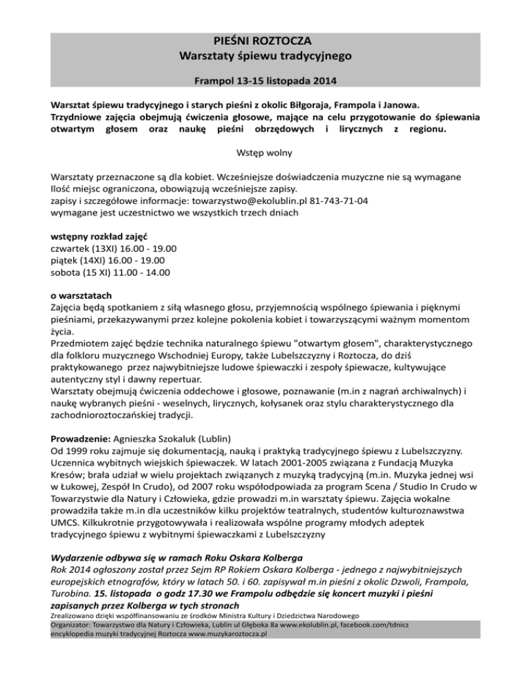 PIEŚNI ROZTOCZA Warsztaty śpiewu tradycyjnego Frampol 13-15 listopada 2014 Warsztat śpiewu tradycyjnego i starych pieśni z okolic Biłgoraja, Frampola i Janowa. Trzydniowe zajęcia obejmują ćwiczenia głosowe, mające na celu przygotowanie do śpiewania otwartym głosem oraz naukę pieśni obrzędowych i lirycznych z regionu. Wstęp wolny Warsztaty przeznaczone są dla kobiet. Wcześniejsze doświadczenia muzyczne nie są wymagane Ilość miejsc ograniczona, obowiązują wcześniejsze zapisy. zapisy i szczegółowe informacje: [email protected] 81-743-71-04 wymagane jest uczestnictwo we wszystkich trzech dniach wstępny rozkład zajęć czwartek (13XI) 16.00 - 19.00 piątek (14XI) 16.00 - 19.00 sobota (15 XI) 11.00 - 14.00 o warsztatach Zajęcia będą spotkaniem z siłą własnego głosu, przyjemnością wspólnego śpiewania i pięknymi pieśniami, przekazywanymi przez kolejne pokolenia kobiet i towarzyszącymi ważnym momentom życia. Przedmiotem zajęć będzie technika naturalnego śpiewu "otwartym głosem", charakterystycznego dla folkloru muzycznego Wschodniej Europy, także Lubelszczyzny i Roztocza, do dziś praktykowanego przez najwybitniejsze ludowe śpiewaczki i zespoły śpiewacze, kultywujące autentyczny styl i dawny repertuar. Warsztaty obejmują ćwiczenia oddechowe i głosowe, poznawanie (m.in z nagrań archiwalnych) i naukę wybranych pieśni - weselnych, lirycznych, kołysanek oraz stylu charakterystycznego dla zachodnioroztoczańskiej tradycji. Prowadzenie: Agnieszka Szokaluk (Lublin) Od 1999 roku zajmuje się dokumentacją, nauką i praktyką tradycyjnego śpiewu z Lubelszczyzny. Uczennica wybitnych wiejskich śpiewaczek. W latach 2001-2005 związana z Fundacją Muzyka Kresów; brała udział w wielu projektach związanych z muzyką tradycyjną (m.in. Muzyka jednej wsi w Łukowej, Zespół In Crudo), od 2007 roku współodpowiada za program Scena / Studio In Crudo w Towarzystwie dla Natury i Człowieka, gdzie prowadzi m.in warsztaty śpiewu. Zajęcia wokalne prowadziła także m.in dla uczestników kilku projektów teatralnych, studentów kulturoznawstwa UMCS. Kilkukrotnie przygotowywała i realizowała wspólne programy młodych adeptek tradycyjnego śpiewu z wybitnymi śpiewaczkami z Lubelszczyzny Wydarzenie odbywa się w ramach Roku Oskara Kolberga Rok 2014 ogłoszony został przez Sejm RP Rokiem Oskara Kolberga - jednego z najwybitniejszych europejskich etnografów, który w latach 50. i 60. zapisywał m.in pieśni z okolic Dzwoli, Frampola, Turobina. 15. listopada o godz 17.30 we Frampolu odbędzie się koncert muzyki i pieśni zapisanych przez Kolberga w tych stronach Zrealizowano dzięki współfinansowaniu ze środków Ministra Kultury i Dziedzictwa Narodowego Organizator: Towarzystwo dla Natury i Człowieka, Lublin ul Głęboka 8a www.ekolublin.pl, facebook.com/tdnicz encyklopedia muzyki tradycyjnej Roztocza www.muzykaroztocza.pl