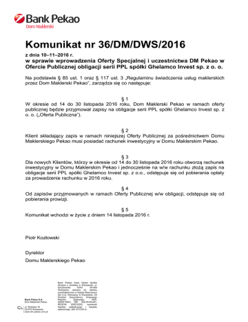 Komunikat nr 36/DM/DWS/2016 z dnia 10–11–2016 r. w sprawie wprowadzenia Oferty Specjalnej i uczestnictwa DM Pekao w Ofercie Publicznej obligacji serii PPL spółki Ghelamco Invest sp. z o. o. Na podstawie § 85 ust. 1 oraz § 117 ust. 3 „Regulaminu świadczenia usług maklerskich przez Dom Maklerski Pekao”, zarządza się co następuje: §1 W okresie od 14 do 30 listopada 2016 roku, Dom Maklerski Pekao w ramach oferty publicznej będzie przyjmował zapisy na obligacje serii PPL spółki Ghelamco Invest sp. z o. o. („Oferta Publiczna”). §2 Klient składający zapis w ramach niniejszej Oferty Publicznej za pośrednictwem Domu Maklerskiego Pekao musi posiadać rachunek inwestycyjny w Domu Maklerskim Pekao. §3 Dla nowych Klientów, którzy w okresie od 14 do 30 listopada 2016 roku otworzą rachunek inwestycyjny w Domu Maklerskim Pekao i jednocześnie na w/w rachunku złożą zapis na obligacje serii PPL spółki Ghelamco Invest sp. z o.o., odstępuje się od pobierania opłaty za prowadzenie rachunku w 2016 roku. §4 Od zapisów przyjmowanych w ramach Oferty Publicznej w/w obligacji, odstępuje się od pobierania prowizji. §5 Komunikat wchodzi w życie z dniem 14 listopada 2016 r. Piotr Kozłowski Dyrektor Domu Maklerskiego Pekao Bank Pekao S.A. Dom Maklerski Pekao ul. Wołoska 18 02-675 Warszawa www.dm.pekao.com.pl Bank Polska Kasa Opieki Spółka Akcyjna z siedzibą w Warszawie, ul. Grzybowska 53/57, 00-950 Warszawa, wpisany do rejestru przedsiębiorców w Sądzie Rejonowym dla m.st. Warszawy w Warszawie, XII Wydział Gospodarczy Krajowego Rejestru Sądowego, KRS: 0000014843, NIP: 526-00-06-841, REGON: 000010205, wysokość kapitału zakładowego i kapitału wpłaconego: 262 470 034 zł. Zastrzeżenie prawne: Zaprezentowane w niniejszej publikacji informacje służą wyłącznie celom marketingowym i informacyjnym i nie stanowią oferty ani zaproszenia do zakupu lub subskrypcji bądź składania ofert na zakup obligacji Ghelamco Invest sp. z o.o. Oferta przeprowadzana jest wyłącznie na podstawie prospektu emisyjnego (z ewentualnymi aneksami) zatwierdzonego przez Komisję Nadzoru Finansowego. Wszelkie decyzje inwestycyjne powinny być podejmowane wyłącznie w oparciu o treść prospektu emisyjnego. Prospekt jest dostępny bezpłatnie http://www.ghelamco.be/site/pl/pl/investor-relations-poland.html. Bank Pekao S.A. Dom Maklerski Pekao ul. Wołoska 18 02-675 Warszawa www.dm.pekao.com.pl Bank Polska Kasa Opieki Spółka Akcyjna z siedzibą w Warszawie, ul. Grzybowska 53/57, 00-950 Warszawa, wpisany do rejestru przedsiębiorców w Sądzie Rejonowym dla m.st. Warszawy w Warszawie, XII Wydział Gospodarczy Krajowego Rejestru Sądowego, KRS: 0000014843, NIP: 526-00-06-841, REGON: 000010205, wysokość kapitału zakładowego i kapitału wpłaconego: 262 470 034 zł.