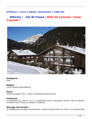 OTIUM.pl ∗ narty w Alpach i Dolomitach ∗ FREE SKI Włochy / Val Di Fassa / Alba Di Canazei / Casa Canazei / Kategoria brak Region Val di Fassa/Trydent/Włochy Atuty blisko wyciągów, Wi-Fi - gratis, komfortowe apartamenty Położenie na wysokości ok. 1520 m n.p.m., w spokojnej okolicy, pomiędzy Canazei i Alba di Canazei w Dolinie Val di Fassa we włoskim Trydencie Wyciągi narciarskie do najbliższego wyciągu narciarskiego - gondoli Canazei-Pecol ok. 900 m, do gondoli Alba- 1/5 Col dei Rossi ok. 1,2 km - połączenie trasami i wyciągami ze słynną karuzelą narciarską Sella Ronda (Val di Fassa-Val Gardena-Alta Badia-Arabba). Przystanek skibusa (za opłatą) znajduje się ok. 50 m od obiektu Wyposażenie recepcja (czynna w godz. 08.30-12.00, 16.00-21.00), sala TV, bar/tawerna, ogrzewana przechowalnia sprzętu narciarskiego, pralnia (za opłatą), parking zadaszony (gratis, 1 auto/apt.), pokój gier (za opłatą - tenis stołowy, gry wideo), ok. 400 m od rezydencji znajduje się restauracja i supermarket. Obiekt składa się z czterech 3-piętrowych budynków (brak windy) Internet tak (Wi-Fi - gratis, w wyznaczonych miejscach) Karty kredytowe nie Sport i relaks sauna (za opłatą - 5 euro/sesja) Apartament Bilo dla 4-5 osób (ok. 45 m<sup>2</sup>), składa się z sypialni z łóżkiem małżeńskim, pokoju dziennego z dwuosobową rozkładaną sofą i rozkładanym łóżkiem pojedynczym, aneksu kuchennego w pełni wyposażonego (naczynia, sztućce, kuchenka, lodówka). Łazienka z WC; TV Apartament Trilo dla 4-6 osób (ok. 50 m<sup>2</sup>), składa się z sypialni z łóżkiem małżeńskim, sypialni z łóżkiem piętrowym, pokoju dziennego z dwuosobową rozkładaną sofą, aneksu kuchennego w pełni wyposażonego (naczynia, sztućce, kuchenka, lodówka). Łazienka z WC; TV Pieski nie Kategoria lokalna brak Świadczenia 7 noclegów, ubezpieczenie Signal Iduna - Bezpieczne Podróże (w tym rekreacyjne uprawianie narciarstwa zjazdowego, biegowego lub snowboardu na oznakowanych trasach zjazdowych) - KL, KR, NNW i bagażu, opieka włoskiego kontrahenta Uwaga Zalecamy dodatkowe ubezpieczenie OC/SS (w tym sprzęt sportowy) Signal Iduna - 35 zł/os/pobyt W cenie 2/5 prąd, woda, ogrzewanie, taksa klimatyczna, bielizna pościelowa, ręczniki, sprzątanie końcowe (aneks kuchenny należy posprzątać we własnym zakresie, śmieci należy wyrzucić). Możliwość wypożyczenia łóżeczka dla dziecka do 1,9 lat - gratis (wymagane zgłoszenie przy rezerwacji) Dopłaty Dopłata za ubezpieczenie od kosztów rezygnacji 2,4% Obowiązkowe opłaty na miejscu kaucja zwrotna 155 euro/apt (płatne gotówką) Zakwaterowanie przyjazd - w godz. 16.00-22.00 (w przypadku opóźnienia, konieczny telefon do recepcji, który jest podany na voucherze, nie gwarantujemy zakwaterowania w nocy), wyjazd - w godz. 07.00-10.00 Autokar przejazd komfortowym autokarem (klimatyzacja, WC, bar, video), warunki przewozu, cennik, program i rozkład jazdy - dostępne na stronie organizatora Oferta Free Ski nie Promocja Niezmienność ceny - dla rezerwacji potwierdzonych do 30.11.2016 data skąd pobyt opis cena / os 10.03.2017 Bielsko - Biała 8 dni Pokój: Apartament BILO 5 Wyżywienie: bez wyżywienia 989 zł / os 10.03.2017 Bielsko - Biała 8 dni Pokój: Apartament BILO 4 Wyżywienie: bez wyżywienia 1139 zł / os 10.03.2017 Bielsko - Biała 8 dni Pokój: Apartament BILO 3 os. Wyżywienie: bez wyżywienia 1389 zł / os 17.03.2017 Bielsko - Biała 8 dni Pokój: Apartament BILO 5 Wyżywienie: bez wyżywienia 989 zł / os 3/5 17.03.2017 Bielsko - Biała 8 dni Pokój: Apartament TRILO 6 Wyżywienie: bez wyżywienia 990 zł / os 17.03.2017 Bielsko - Biała 8 dni Pokój: Apartament TRILO 5 Wyżywienie: bez wyżywienia 1110 zł / os 17.03.2017 Bielsko - Biała 8 dni Pokój: Apartament BILO 4 Wyżywienie: bez wyżywienia 1139 zł / os 17.03.2017 Bielsko - Biała 8 dni Pokój: Apartament TRILO 4 Wyżywienie: bez wyżywienia 1292 zł / os 17.03.2017 Bielsko - Biała 8 dni Pokój: Apartament BILO 3 os. Wyżywienie: bez wyżywienia 1389 zł / os 24.03.2017 Bielsko - Biała 8 dni Pokój: Apartament BILO 5 Wyżywienie: bez wyżywienia 989 zł / os 24.03.2017 Bielsko - Biała 8 dni Pokój: Apartament TRILO 6 Wyżywienie: bez wyżywienia 990 zł / os 24.03.2017 Bielsko - Biała 8 dni Pokój: Apartament TRILO 5 Wyżywienie: bez wyżywienia 1110 zł / os 24.03.2017 Bielsko - Biała 8 dni Pokój: Apartament BILO 4 Wyżywienie: bez wyżywienia 1139 zł / os 24.03.2017 Bielsko - Biała 8 dni Pokój: Apartament TRILO 4 Wyżywienie: bez wyżywienia 1292 zł / os 4/5 24.03.2017 Bielsko - Biała 8 dni Pokój: Apartament BILO 3 os. Wyżywienie: bez wyżywienia 1389 zł / os OTIUM POLSKA SP. Z O.O. 30-150 KRAKÓW UL. ARMII KRAJOWEJ 12 lok. 11 tel./fax +48-12.4469214, 12.4469215, 12.4469216, 12.4469217 Zapraszamy poniedziałek-piątek w godzinach 10.00-18.00 (soboty 10.00-14.00 od połowy listopada do połowy kwietnia) E-mail: [email protected] Strona Internetowa: www.otium.pl 5/5 Powered by TCPDF (www.tcpdf.org)