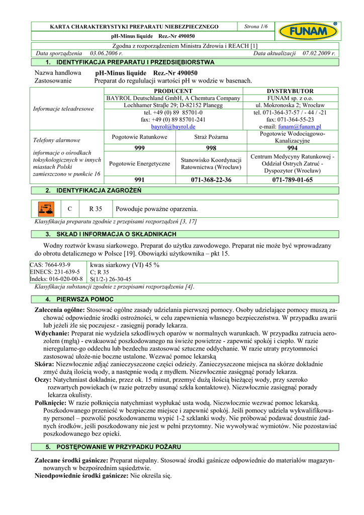 KARTA CHARAKTERYSTYKI PREPARATU NIEBEZPIECZNEGO pH-Minus liquide Strona 1/6 Rez.-Nr 490050 Zgodna z rozporządzeniem Ministra Zdrowia i REACH [1] Data sporządzenia 03.06.2006 r. Data aktualizacji 1. IDENTYFIKACJA PREPARATU I PRZEDSIĘBIORSTWA Nazwa handlowa Zastosowanie 07.02.2009 r. pH-Minus liquide Rez.-Nr 490050 Preparat do regululacji wartości pH w wodzie w basenach. Informacje teleadresowe Telefony alarmowe informacje o ośrodkach toksykologicznych w innych miastach Polski zamieszczono w punkcie 16 PRODUCENT BAYROL Deutschland GmbH, A Chemtura Company Lochhamer Straβe 29; D-82152 Planegg tel. +49 (0) 89 85701-0 fax: +49 (0) 89 85701-241 [email protected] DYSTRYBUTOR FUNAM sp. z o.o. ul. Mokronoska 2; Wrocław tel. 071-364-37-57 / - 44 / -21 fax: 071-364-55-23 e-mail: [email protected] Pogotowie WodociągowoKanalizacyjne Pogotowie Ratunkowe StraŜ PoŜarna 999 998 994 Pogotowie Energetyczne Stanowisko Koordynacji Ratownictwa (Wrocław) Centrum Medycyny Ratunkowej Oddział Ostrych Zatruć Dyspozytor (Wrocław) 991 071-368-22-36 071-789-01-65 2. IDENTYFIKACJA ZAGROśEŃ C R 35 Powoduje powaŜne oparzenia. Klasyfikacja preparatu zgodnie z przepisami rozporządzeń [3, 17] 3. SKŁAD I INFORMACJA O SKŁADNIKACH Wodny roztwór kwasu siarkowego. Preparat do uŜytku zawodowego. Preparat nie moŜe być wprowadzany do obrotu detalicznego w Polsce [19]. Obowiązki uŜytkownika – pkt 15. CAS: 7664-93-9 kwas siarkowy (VI) 45 % EINECS: 231-639-5 C; R 35 Indeks: 016-020-00-8 S(1/2-) 26-30-45 Klasyfikacja substancji zgodnie z przepisami rozporządzenia [4]. 4. PIERWSZA POMOC Zalecenia ogólne: Stosować ogólne zasady udzielania pierwszej pomocy. Osoby udzielające pomocy muszą zachować odpowiednie środki ostroŜności, w celu zapewnienia własnego bezpieczeństwa. W przypadku awarii lub jeŜeli źle się poczujesz - zasięgnij porady lekarza. Wdychanie: Preparat nie wydziela szkodliwych oparów w normalnych warunkach. W przypadku zatrucia aerozolem (mgłą) - ewakuować poszkodowanego na świeŜe powietrze - zapewnić spokój i ciepło. W razie nieregularne-go oddechu lub bezdechu zastosować sztuczne oddychanie. W razie utraty przytomności zastosować ułoŜe-nie boczne ustalone. Wezwać pomoc lekarską Skóra: Niezwłocznie zdjąć zanieczyszczone części odzieŜy. Zanieczyszczone miejsca na skórze dokładnie zmyć duŜą ilością wody, a następnie wodą z mydłem. Niezwłocznie zasięgnąć porady lekarza. Oczy: Natychmiast dokładnie, przez ok. 15 minut, przemyć duŜą ilością bieŜącej wody, przy szeroko rozwartych powiekach (w razie potrzeby usunąć szkła kontaktowe). Niezwłocznie zasięgnąć porady lekarza okulisty. Połknięcie: W razie połknięcia natychmiast wypłukać usta wodą. Niezwłocznie wezwać pomoc lekarską. Poszkodowanego przenieść w bezpieczne miejsce i zapewnić spokój. Jeśli pomocy udziela wykwalifikowany personel – pozwolić poszkodowanemu wypić 1-2 szklanki wody. Nie próbować podawać doustnie Ŝadnych środków, jeśli poszkodowany nie jest w pełni przytomny. Nie wywoływać wymiotów. Nie pozostawiać poszkodowanego bez opieki. 5. POSTĘPOWANIE W PRZYPADKU POśARU Zalecane środki gaśnicze: Preparat niepalny. Stosować środki gaśnicze odpowiednie do materiałów magazynnowanych w bezpośrednim sąsiedztwie. Nieodpowiednie środki gaśnicze: Nie określa się. KARTA CHARAKTERYSTYKI PREPARATU NIEBEZPIECZNEGO pH-Minus liquide Strona 2/6 Rez.-Nr 490050 Szczególne zagroŜenia ze strony produktów spalania i wydzielających się gazów: Podczas poŜaru, w strefie wysokiej temperatury, powstaje mgła kwasu siarkowego i tlenki siarki. Wdychanie produktów rozkładu moŜe powodować powaŜne skutki zdrowotne. Mogą wystąpić rozpryski gorącej i Ŝrącej cieczy. Specjalne wyposaŜenie ochronne straŜaków: WyposaŜenie straŜaków dostosować do lokalnych warunków akcji gaśniczej, zalecane jest pełne wyposaŜenie bojowe z aparatami oddechowymi. Inne informacje: Sąsiednie pojemniki chłodzić wodą. W przypadku wydzielania się substancji z rozkładu preparatu, pokrywać uciekające opary mgiełką wodną. 6. POSTĘPOWANIE W PRZYPADKU NIEZAMIERZONEGO UWOLNIENIA DO ŚRODOWISKA Indywidualne środki ostroŜności: Szczegółowe informacje zamieszczone są w punkcie 7 i 8. UniemoŜliwić dostęp osób postronnych. Nie wdychać oparów (gazów) / aerozolu. Unikać kontaktu z preparatem. UŜywać odzieŜy ochronnej. Środki ostroŜności w zakresie ochrony środowiska: Nie dopuszczać do zanieczyszczania wód powierzchniowych (gruntowych) oraz gruntu. Zapobiegać przedostaniu się zanieczyszczeń do kanalizacji. W przypadku przedostania się do rzek, przewodów kanalizacyjnych lub wodociągowych, powiadomić odpowiednie władze (Inspekcja Ochrony Środowiska, Państwowa StraŜ PoŜarna, Przedsiębiorstwo Wodno - Kanalizacyjne). Metody oczyszczania/usuwania: W przypadku wycieku absorbować ciecz materiałem chłonnym do kwasów np. piaskiem, ziemią okrzemkową, wermikulitem, sorbentem do cieczy silnie kwaśnych. Zebrać sorbent i umieścić w oznakowanym pojemniku, w celu dalszego bezpiecznego usunięcia. Zanieczyszczony grunt zebrać i umieścić w oznakowanym pojemniku. Postępowanie z odpadami - pkt 13. Nie spłukiwać cieczy wodą. Pozostałości na powierzchni utwardzonej, po dokładnym zebraniu sorbentu, zmyć duŜą ilością wody. 7. POSTĘPOWANIE Z PREPARATEM I JEGO MAGAZYNOWANIE Postępowanie z preparatem: Przestrzegać ogólnych zasad bezpieczeństwa i higieny pracy [5] oraz szczegółowych wymagań rozporządzenia [18]. Podczas pracy nie jeść i nie pić. Zapobiegać tworzeniu się aerozolu. Unikać kontaktu z oczami i ze skórą. Nie wdychać aerozolu. UŜywać środków ochrony osobistej wymienionych w punkcie 8. W przypadku rozcieńczania zawsze dodawać kwas do wody. Magazynowanie: Zabezpieczyć przed dostępem osób nieuprawnionych. Magazynować w suchym i chłodnym miejscu. Magazynować na utwardzonej powierzchni. Pojemniki pr