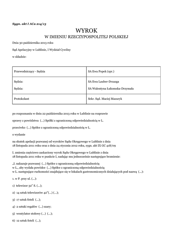 Sygn. akt I ACa 214/13 WYROK W IMIENIU RZECZYPOSPOLITEJ POLSKIEJ Dnia 30 października 2013 roku Sąd Apelacyjny w Lublinie, I Wydział Cywilny w składzie: Przewodniczący - Sędzia SA Ewa Popek (spr.) Sędzia: SA Ewa Lauber-Drzazga Sędzia: SA Walentyna Łukomska-Drzymała Protokolant Sekr. Sąd. Maciej Mazuryk po rozpoznaniu w dniu 22 października 2013 roku w Lublinie na rozprawie sprawy z powództwa (...) Spółki z ograniczoną odpowiedzialnością w L. przeciwko (...) Spółce z ograniczoną odpowiedzialnością w L. o wydanie na skutek apelacji pozwanej od wyroków Sądu Okręgowego w Lublinie z dnia 18 listopada 2011 roku oraz z dnia 24 stycznia 2012 roku, sygn. akt IX GC 418/09 I. zmienia częściowo zaskarżony wyrok Sądu Okręgowego w Lublinie z dnia 18 listopada 2011 roku w punkcie I, nadając mu jednocześnie następujące brzmienie: „I. nakazuje pozwanej (...) Spółce z ograniczoną odpowiedzialnością w L., aby wydała powódce (...) Spółce z ograniczoną odpowiedzialnością w L. następujące ruchomości znajdujące się w lokalach gastronomicznych działających pod nazwą (...): 1. w P. przy ul. (...): 1) telewizor 32" S. (...); 2) 14 sztuk telewizorów 42"(...) (...); 3) 17 sztuk foteli (...); 4) 2 sztuki regałów (...) szary; 5) wentylator stołowy (...) (...); 6) 12 sztuk foteli (...); 7) 4 sztuki szaf stalowych (...) (...) 180x60x49; 8) sofy – 13 sztuk narożników koloru czarnego i 2 sztuki koloru białego, 37 sztuk puf koloru czarnego, 2 sztuki puf koloru białego, 39 sztuk puf z oparciem koloru czarnego, 2 sztuki puf z oparciem koloru białego, 9) meble – 17 sztuk stolików na nodze chromowanej w formie okręgu, z czarnym blatem, 10) naczynia, sztućce, przybory kuchenne i szkło; - 40 sztuk kwadratowych talerzy, 42 sztuki noży obiadowych, 44 sztuki widelców obiadowych, 55 sztuk łyżek obiadowych, 75 sztuk łyżeczek do kawy, 10 dzbanków; 11) oświetlenie; dwa żyrandole na zamówienie według projektu G. D., o wymiarach 2,5m x 7m, 2,5m x 2,5m, 8 sztuk oświetlenia sufitowego 2 x 50W, 40 sztuk oświetlenia sufitowego 1 x 50W, 9 sztuk kinkietów aluminium, 4 sztuki oświetlenia awaryjnego; 12) elektryczną kruszarkę do lodu(...) (...); 2. w L. przy ul. (...): 1) klimatyzację - komplet klimatyzacji klimatyzacja (...) sztuki plus klimatyzator M., 2) kamery T. (...) sztuk; 3) 2 sztuki klimatyzacji M. (...) hW; 4) pompę (...) P (...); 5) komputer notebook (...) F. (...) A. P. 6) komputer I. (...); 7) monitor N. (...)" z nakładką dotykową; 8) (...) E. (...)(...); 9) projektor A. (...) M. (...); 10) 2 sztuki (...) H. (...); 11) monitor 15" z nakładką dotykową G. (...); 12) kostkarkę (...) model (...); 13) telewizor plazmowy P. (...) (...)wraz z uchwytem; 14) 5 sztuk telewizorów (...) P. (...)" wraz z uchwytami; 15) 3 sztuki telefonów P. (...); 16) centralę telefoniczną P. (...); 17) zespół urządzeń do nagłośnienia i prowadzenia imprez „D. T. x 2 mixer dźwięków (...) 909, zestaw do nagłośnienia + 2 kolumny (...), 18) wzmacniacz(...) (...); 19) wytwornicę dymu (...); 20) kulę lustrzaną S. (...); 21) ciemno brązową markizę z logotypem (...); 22) kamerę cyfrową S. (...)- (...).(...); 23) regat (...); 24) 2 sztuki komór (...); 25) 2 sztuki półek (...); 26) szafkę komodę 110x210x50; 27) komodę 80x160x45; 28) sofę E. (...) z elementami; 29) meble - hokery barowe z siedziskiem tapicerowanym – 30 sztuk, kanapy czarne welurowe składające się z modułów o wymiarze około 60 cm x 60 cm w pikowanym oparciem – 25 modułów, z pikowanym obiciem, kanapy różowe welurowe składające się z modułów i wymiarach około 60 cm x 60 cm – 25 modułów, pufy w formie prostopadłościanu czarne welurowe – 30 sztuk, pufy w formie prostopadłościanu różowe welurowe – 12 sztuk, stoliki kawowe lakierowane na czarno o wymiarach 40 cm x 40 cm na nogach V. F. – 22 sztuki, stoliki kawowe lakierowane na czarno o wymiarach 40 cm x 60 cm na nogach V. F. – 6 sztuk, stolik 120 cm x 120 cm na nogach V. F. – 1 sztuka, zabudowa baru z płyty mdf lakierowanej na czarno około 300 cm x 40 cm x 90 cm – 2 sztuki, bar składający się z modułów w kształcie litery L, obwód około 16 m, blat drewniany, fronty baru tapicerowane, 30) naczynia, sztućce, przybory kuchenne i szkło - 50 sztuk kieliszków do wódki, 20 sztuk kieliszków do wina 210, 20 sztuk kieliszków do wina 270, 20 sztuk kieliszków do szampana, 150 sztuk szklanek; 31) oświetlenie - zestaw operowania oświetleniem (...) (...) + 11 lamp, 31 czarnych i 9 brązowych abażurów do kinkietów w formie stożka, 33 sztuki kinkietów z oprawami koloru starego złota, żyrandol w formie kaskady przeźroczystych kulek zwisających na drutach o różnych długościach; 3. w Ł. przy ul. (...): 1) kurtynę powietrzną; - elektryczna nagrzewnica powietrza mocowana do ściany przy drzwiach wejściowych; 2) 2 sztuki wentylatorów z pilotem; 3) chłodziarkę (...); 4) podgrzewacz podwójny 1200x300x700; 5) stół podgrzewacza 1200x700x850; 6) dźwig towarowy; 7) ekspres ciśnieniowy (...)(...); 8) filtr (...); 9) filtr wody (...); 10) oświetlenie prz.-4.2 - podświetlana (...) L. scena o wymiarach 230 cm x 260 cm, rura trawers (...) do montażu oświetlenia (reflektorów) 4,5 b, 2 sztuki, reflektor (...) L./ (...) 8 sztuk, kula lustrzana (...) z napędem wewnętrznym 1 sztuka, oświetlacz kuli (...)z filtrem i żarówka 4 sztuki, laser (...) (...) 1 sztuka, efekt świetlny głowica (...) 2 sztuki, pojemnik (...)w oprawą 2 sztuki, sterownik do urządzeń (...) 1 sztuka, rozdzielacz (...) (...) 1 sztuka, panel załączający (...)-6 1 sztuka, moduł świetlny (...)(...)/L. (...)/(...) sztuki, sterownik (...) z zasilaczem pfc24 (...) 1 sztuka, reklama świetlna – kaseton 1 sztuka; 11) 2 sztuki frytkownic gazowych(...); 12) L. grill (...) napęd (...); 13) kloc masarski 50x60x20 z podstawką; 14) kostkarkę do lodu (...); 15) kostkarkę do lodu (...); 16) kuchnię gazową z 