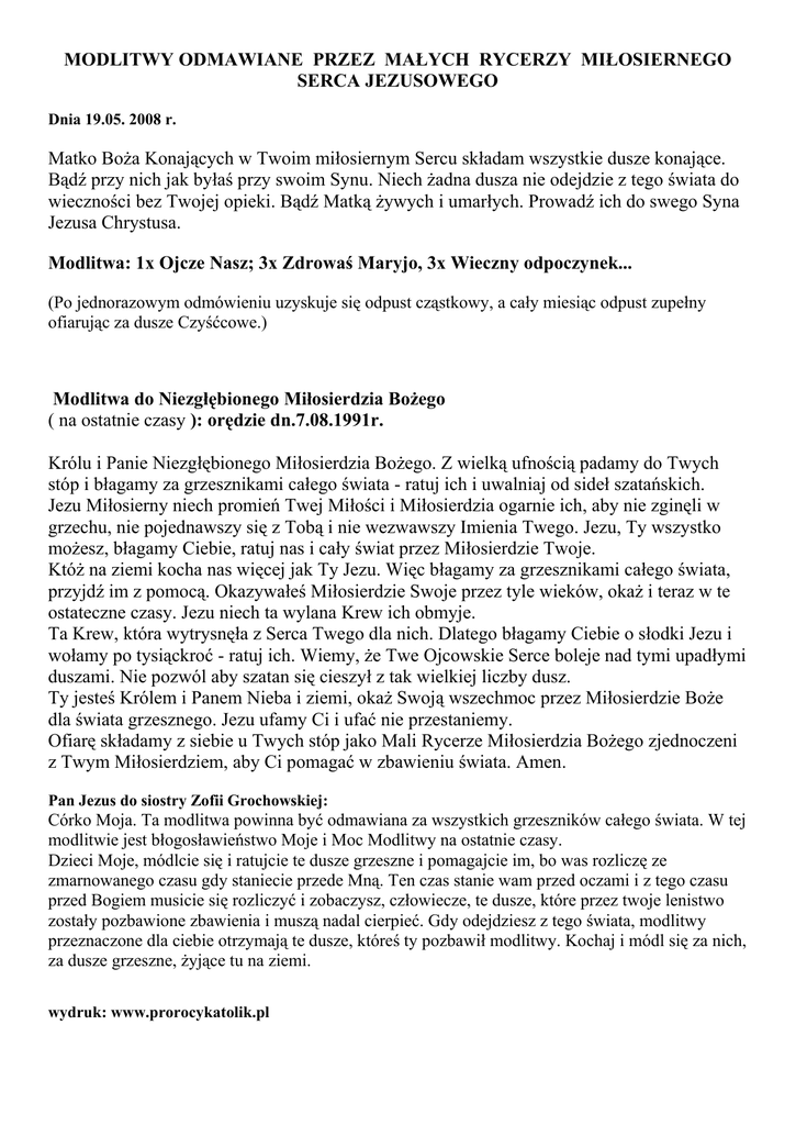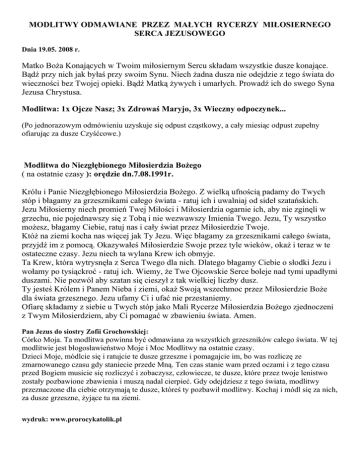 MODLITWY ODMAWIANE PRZEZ MAŁYCH RYCERZY MIŁOSIERNEGO SERCA JEZUSOWEGO Dnia 19.05. 2008 r. Matko Boża Konających w Twoim miłosiernym Sercu składam wszystkie dusze konające. Bądź przy nich jak byłaś przy swoim Synu. Niech żadna dusza nie odejdzie z tego świata do wieczności bez Twojej opieki. Bądź Matką żywych i umarłych. Prowadź ich do swego Syna Jezusa Chrystusa. Modlitwa: 1x Ojcze Nasz; 3x Zdrowaś Maryjo, 3x Wieczny odpoczynek... (Po jednorazowym odmówieniu uzyskuje się odpust cząstkowy, a cały miesiąc odpust zupełny ofiarując za dusze Czyśćcowe.) Modlitwa do Niezgłębionego Miłosierdzia Bożego ( na ostatnie czasy ): orędzie dn.7.08.1991r. Królu i Panie Niezgłębionego Miłosierdzia Bożego. Z wielką ufnością padamy do Twych stóp i błagamy za grzesznikami całego świata - ratuj ich i uwalniaj od sideł szatańskich. Jezu Miłosierny niech promień Twej Miłości i Miłosierdzia ogarnie ich, aby nie zginęli w grzechu, nie pojednawszy się z Tobą i nie wezwawszy Imienia Twego. Jezu, Ty wszystko możesz, błagamy Ciebie, ratuj nas i cały świat przez Miłosierdzie Twoje. Któż na ziemi kocha nas więcej jak Ty Jezu. Więc błagamy za grzesznikami całego świata, przyjdź im z pomocą. Okazywałeś Miłosierdzie Swoje przez tyle wieków, okaż i teraz w te ostateczne czasy. Jezu niech ta wylana Krew ich obmyje. Ta Krew, która wytrysnęła z Serca Twego dla nich. Dlatego błagamy Ciebie o słodki Jezu i wołamy po tysiąckroć - ratuj ich. Wiemy, że Twe Ojcowskie Serce boleje nad tymi upadłymi duszami. Nie pozwól aby szatan się cieszył z tak wielkiej liczby dusz. Ty jesteś Królem i Panem Nieba i ziemi, okaż Swoją wszechmoc przez Miłosierdzie Boże dla świata grzesznego. Jezu ufamy Ci i ufać nie przestaniemy. Ofiarę składamy z siebie u Twych stóp jako Mali Rycerze Miłosierdzia Bożego zjednoczeni z Twym Miłosierdziem, aby Ci pomagać w zbawieniu świata. Amen. Pan Jezus do siostry Zofii Grochowskiej: Córko Moja. Ta modlitwa powinna być odmawiana za wszystkich grzeszników całego świata. W tej modlitwie jest błogosławieństwo Moje i Moc Modlitwy na ostatnie czasy. Dzieci Moje, módlcie się i ratujcie te dusze grzeszne i pomagajcie im, bo was rozliczę ze zmarnowanego czasu gdy staniecie przede Mną. Ten czas stanie wam przed oczami i z tego czasu przed Bogiem musicie się rozliczyć i zobaczysz, człowiecze, te dusze, które przez twoje lenistwo zostały pozbawione zbawienia i muszą nadal cierpieć. Gdy odejdziesz z tego świata, modlitwy przeznaczone dla ciebie otrzymają te dusze, któreś ty pozbawił modlitwy. Kochaj i módl się za nich, za dusze grzeszne, żyjące tu na ziemi. wydruk: www.prorocykatolik.pl