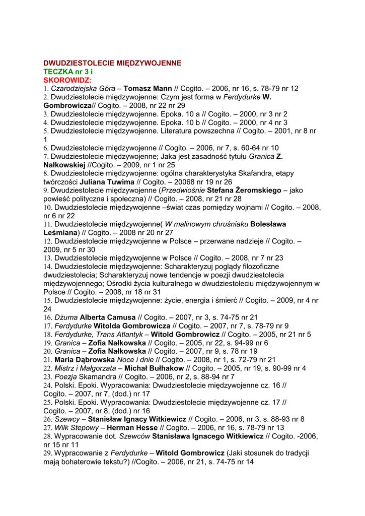 DWUDZIESTOLECIE MIĘDZYWOJENNE TECZKA nr 3 i SKOROWIDZ: 1. Czarodziejska Góra – Tomasz Mann // Cogito. – 2006, nr 16, s. 78-79 nr 12 2. Dwudziestolecie międzywojenne: Czym jest forma w Ferdydurke W. Gombrowicza// Cogito. – 2008, nr 22 nr 29 3. Dwudziestolecie międzywojenne. Epoka. 10 a // Cogito. – 2000, nr 3 nr 2 4. Dwudziestolecie międzywojenne. Epoka. 10 b // Cogito. – 2000, nr 4 nr 3 5. Dwudziestolecie międzywojenne. Literatura powszechna // Cogito. – 2001, nr 8 nr 1 6. Dwudziestolecie międzywojenne // Cogito. – 2006, nr 7, s. 60-64 nr 10 7. Dwudziestolecie międzywojenne; Jaka jest zasadność tytułu Granica Z. Nałkowskiej //Cogito. – 2009, nr 1 nr 25 8. Dwudziestolecie międzywojenne: ogólna charakterystyka Skafandra, etapy twórczości Juliana Tuwima // Cogito. – 20068 nr 19 nr 26 9. Dwudziestolecie międzywojenne (Przedwiośnie Stefana Żeromskiego – jako powieść polityczna i społeczna) // Cogito. – 2008, nr 21 nr 28 10. Dwudziestolecie międzywojenne –świat czas pomiędzy wojnami // Cogito. – 2008, nr 6 nr 22 11. Dwudziestolecie międzywojenne( W malinowym chruśniaku Bolesława Leśmiana) // Cogito. – 2008 nr 20 nr 27 12. Dwudziestolecie międzywojenne w Polsce – przerwane nadzieje // Cogito. – 2009, nr 5 nr 30 13. Dwudziestolecie międzywojenne w Polsce // Cogito. – 2008, nr 7 nr 23 14. Dwudziestolecie międzywojenne: Scharakteryzuj poglądy filozoficzne dwudziestolecia; Scharakteryzuj nowe tendencje w poezji dwudziestolecia międzywojennego; Ośrodki życia kulturalnego w dwudziestoleciu międzywojennym w Polsce // Cogito. – 2008, nr 18 nr 31 15. Dwudziestolecie międzywojenne: życie, energia i śmierć // Cogito. – 2009, nr 4 nr 24 16. Dżuma Alberta Camusa // Cogito. – 2007, nr 3, s. 74-75 nr 21 17. Ferdydurke Witolda Gombrowicza // Cogito. – 2007, nr 7, s. 78-79 nr 9 18. Ferdydurke, Trans Atlantyk – Witold Gombrowicz // Cogito. – 2005, nr 21 nr 5 19. Granica – Zofia Nałkowska // Cogito. – 2005, nr 22, s. 94-99 nr 6 20. Granica – Zofia Nałkowska // Cogito. – 2007, nr 9, s. 78 nr 19 21. Maria Dąbrowska Noce i dnie // Cogito. – 2008, nr 1, s. 72-79 nr 21 22. Mistrz i Małgorzata – Michał Bułhakow // Cogito. – 2005, nr 19, s. 90-99 nr 4 23. Poezja Skamandra // Cogito. – 2006, nr 2, s. 88-94 nr 7 24. Polski. Epoki. Wypracowania: Dwudziestolecie międzywojenne cz. 16 // Cogito. – 2007, nr 7, (dod.) nr 17 25. Polski. Epoki. Wypracowania: Dwudziestolecie międzywojenne cz. 17 // Cogito. – 2007, nr 8, (dod.) nr 16 26. Szewcy – Stanisław Ignacy Witkiewicz // Cogito. – 2006, nr 3, s. 88-93 nr 8 27. Wilk Stepowy – Herman Hesse // Cogito. – 2006, nr 16, s. 78-79 nr 13 28. Wypracowanie dot. Szewców Stanisława Ignacego Witkiewicz // Cogito. -2006, nr 15 nr 11 29. Wypracowanie z Ferdydurke – Witold Gombrowicz (Jaki stosunek do tradycji mają bohaterowie tekstu?) //Cogito. – 2006, nr 21, s. 74-75 nr 14 30. Wypracowanie z Leśmiana dot. wiersza W malinowym chruśniaku // Cogito. – 2007, nr 4 nr 15 31. Zamek – Franz Kafka // Cogito. – 2006, nr 18, s. 78-79 nr 18 32. „Dżuma” Alberta Camusa // Cogito.- 2010, nr 1 nr 32 33. „Szewcy” Stanisława Witkiewicza // Cogito.- 2010, nr 5 nr 33 34. Wiersze Bolesława Leśmiana // Cogito.- 2010, nr 6 nr 34 35. Wiersze Juliana Tuwima // Cogito.- 2010, nr 7 nr 35 36. Wiersze Marii Pawlikowskiej-Jasnorzewskiej // Cogito.- 2010, nr 8 nr 36 37. „Cudzoziemka” Marii Kuncewiczowej // Cogito.- 2009, nr 22 nr 37 38. „Granica” Zofii Nałkowskiej // Cogito.- 2009, nr 21 nr 38 39. „Mistrz i Małgorzata” Michaiła Bułhakowa // Cogito.- 2009, nr 18 nr 39 40. „Proces” Franza Kafki // Cogito.- 2009, nr 18 nr 40 41. „Trans – Atlantyk” Witolda Gombrowicza // Cogito.- 2009, nr 20 nr 41 42. “Ferdydurke” Witolda Gombrowicza // Cogito.- 2009, nr 19 nr 42 43. Przemiany Schulza // Polonistyka.- 2010, nr 4 nr 43 44. Wiersze Marii Pawlikowskiej-Jasnorzewskiej // Cogito.- 2010, nr 8 nr 44 45. Franz Kafka // Cogito.- 2010, nr 17 nr 45 46. Bruno Schulz // Cogito.- 2010, nr 19 nr 46 47. Historiozoficzne horyzonty “Mistrza i Małgorzaty“ nr 47 48. Leśmianowska kraina poezji // Cogito. – 2000 nr 48 49. Twórczość M. Szołochowa w opinii pisarzy polskich nr 49 50. „Granica” Zofii Nałkowskiej// Cogito.-2011, nr 7 nr 50 51. Dwudziestolecie międzywojenne// Cogito.-2011, nr 7 nr 51 52. „Przedwiośnie” Stefana Żeromskiego// Cogito.- 2011, nr 9 nr 52 53. Modernizm w Europie// Cogito.- 2012, nr 1 nr 53