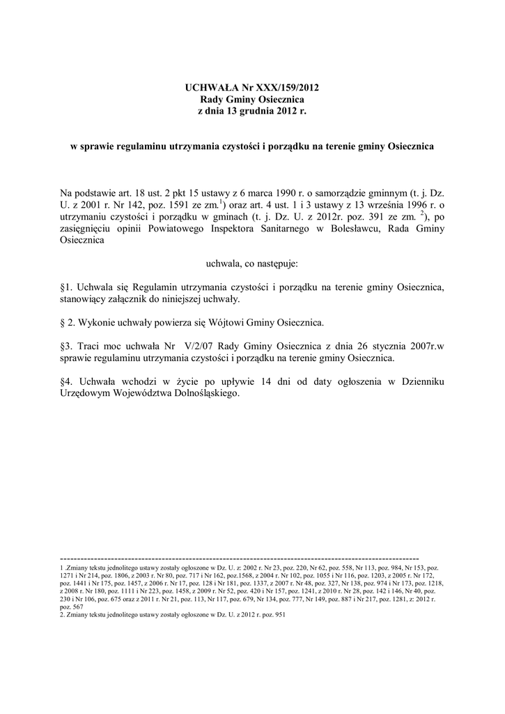 UCHWA A Nr XXX/159/2012 Rady Gminy Osiecznica z dnia 13 grudnia 2012 r. w sprawie regulaminu utrzymania czysto ci i porz dku na terenie gminy Osiecznica Na podstawie art. 18 ust. 2 pkt 15 ustawy z 6 marca 1990 r. o samorz dzie gminnym (t. j. Dz. U. z 2001 r. Nr 142, poz. 1591 ze zm.1) oraz art. 4 ust. 1 i 3 ustawy z 13 wrze nia 1996 r. o utrzymaniu czysto ci i porz dku w gminach (t. j. Dz. U. z 2012r. poz. 391 ze zm. 2), po zasi gni ciu opinii Powiatowego Inspektora Sanitarnego w Boles awcu, Rada Gminy Osiecznica uchwala, co nast puje: §1. Uchwala si Regulamin utrzymania czysto ci i porz dku na terenie gminy Osiecznica, stanowi cy za cznik do niniejszej uchwa y. § 2. Wykonie uchwa y powierza si Wójtowi Gminy Osiecznica. §3. Traci moc uchwa a Nr V/2/07 Rady Gminy Osiecznica z dnia 26 stycznia 2007r.w sprawie regulaminu utrzymania czysto ci i porz dku na terenie gminy Osiecznica. §4. Uchwa a wchodzi w ycie po up ywie 14 dni od daty og oszenia w Dzienniku Urz dowym Województwa Dolno skiego. ---------------------------------------------------------------------------------------------------------1 .Zmiany tekstu jednolitego ustawy zosta y og oszone w Dz. U. z: 2002 r. Nr 23, poz. 220, Nr 62, poz. 558, Nr 113, poz. 984, Nr 153, poz. 1271 i Nr 214, poz. 1806, z 2003 r. Nr 80, poz. 717 i Nr 162, poz.1568, z 2004 r. Nr 102, poz. 1055 i Nr 116, poz. 1203, z 2005 r. Nr 172, poz. 1441 i Nr 175, poz. 1457, z 2006 r. Nr 17, poz. 128 i Nr 181, poz. 1337, z 2007 r. Nr 48, poz. 327, Nr 138, poz. 974 i Nr 173, poz. 1218, z 2008 r. Nr 180, poz. 1111 i Nr 223, poz. 1458, z 2009 r. Nr 52, poz. 420 i Nr 157, poz. 1241, z 2010 r. Nr 28, poz. 142 i 146, Nr 40, poz. 230 i Nr 106, poz. 675 oraz z 2011 r. Nr 21, poz. 113, Nr 117, poz. 679, Nr 134, poz. 777, Nr 149, poz. 887 i Nr 217, poz. 1281, z: 2012 r. poz. 567 2. Zmiany tekstu jednolitego ustawy zosta y og oszone w Dz. U. z 2012 r. poz. 951 Za cznik do uchwa y nr XXX/159/2012 Rady Gminy Osiecznica z dnia 13 grudnia 2012 r. Regulamin utrzymania czysto ci i porz dku na terenie gminy Osiecznica Rozdzia 1 Obowi zki i wymagania w zakresie utrzymania czysto ci i porz dku na terenie nieruchomo ci § 1. ciciele nieruchomo ci prowadz selektywne zbieranie wytwarzanych na terenie nieruchomo ci odpadów komunalnych, co najmniej w zakresie obejmuj cym: 1)papier; 2)tworzywa sztuczne, metale i odpady opakowaniowe wielomateria owe; 3)szk o bezbarwne i kolorowe; 4)zu yty sprz t elektryczny i elektroniczny; 5)zu yte baterie i akumulatory; 6)odpady budowlane i rozbiórkowe; 7)meble i inne odpady wielkogabarytowe; 8)odpady zielone; 9)zu yte opony; 10)przeterminowane leki i chemikalia. § 2. ciciele nieruchomo ci zapewniaj : 1)uprz tanie b ota, lodu i po nych na cz niegu z wydzielonych ci gów komunikacyjnych ciach nieruchomo ci s szczególno ci dróg, chodników, doj cych do u ytku publicznego, w do budynków, gara y oraz miejsc zbierania odpadów, poprzez gromadzenie tych zanieczyszcze utrudnia to ruchu pieszego w miejscach, w których nie i nie zagra a przechodniom, pojazdom oraz istniej cej zieleni, z zachowaniem mo liwo ci odp ywu wody roztopowej do kanalizacji; 2)uprz tanie i usuwanie niewymienionych w pkt 1 zanieczyszcze , w tym opad ych li ci, z cz ci nieruchomo ci s cych do u ytku publicznego. § 3. 1. Mycie pojazdów samochodowych poza myjniami samochodowymi mo e odbywa si na terenie nieruchomo ci wy cznie w miejscach przystosowanych do tego celu poprzez zapewnienie odprowadzania powstaj cych cieków do gminnej sieci kanalizacji sanitarnej lub ogólnosp awnej przepisami lub gromadzenie cieków zgodnie z obowi zuj cymi w zbiornikach bezodp ywowych; w szczególno ci cieki takie nie mog by odprowadzane do zbiorników wodnych, do ziemi oraz do kanalizacji deszczowej. 2. Zakazuje si napraw pojazdów naprawczymi, je eli naprawy te mog samochodowych powodowa zagro enie dla szczególno ci zakazuje napraw zwi zanych z wymian przek adniowego, p ynów ch odniczych poza warsztatami rodowiska, w oleju silnikowego i i hamulcowych lub napraw, w wyniku których mo e nast pi zanieczyszczenie terenu tymi substancjami. Rozdzia 2. Rodzaje pojemników do zbierania odpadów komunalnych na terenie nieruchomo ci, na drogach publicznych, oraz wymagania dotycz ce ich minimalnej pojemno ci oraz rozmieszczenia i utrzymywania § 4. 1. Do zbierania odpadów komunalnych stosuje si pojemniki wykonane z trwa ego materia u, w szczególno ci tworzywa sztucznego, oznakowane odpowiednim kolorem, w sposób jednoznacznie wskazuj cy przeznaczenie pojemnika na odpady okre lonego rodzaju. 1) 2. Odpowiednie kolory, o których mowa w ust. 1, oznaczaj : ty - tworzywa sztuczne, metale i odpady opakowa wielomateria owych; 2)zielony – szk o i opakowania szklane 3)niebieski - papier i makulatur ; 4)czarny - zmieszane odpady komunalne. 3. Je li przepisy poni sze nie stanowi inaczej, do zbierania odpadów komunalnych niewymienionych w ust. 2 stosuje si szczelne pojemniki wykonane z trwa ego materia u, w szczególno ci tworzyw sztucznych, wyposa one w klapy lub pokrywy umo liwiaj ce ich zamkni cie oraz oznakowane w sposób wskazuj cy na rodzaj zbieranych w nich odpadów. 4. Do zbierania zmieszanych odpadów komunalnych stosuje si pojemniki 5. Do selektywnego zbierania odpadów komunalnych stosuje si pojemniki o pojemno ciach 120l, 240l oraz 1100 l. o pojemno ciach od 120l, 240l oraz 1100 l. 6. Konstrukcja pojemników powinna umo liwi ich opró nianie bramowym mechanizmem za adowczym pojazdów przeznaczonych do odbioru odpadów. 7. Do zbierania odpadów segregowanych stosuje si pojemniki o budowie zapewniaj cej ochron przed wp ywem opadów atmosferycznych i rozwiewaniem. 8. Do zbierania odpadów na drogach publicznych oraz w innych miejscach przeznaczonych do u ytku publicznego, stosuje si pojemniki, zwane dalej „koszami ulicznymi”, wykonane z materia ów niepalnych. Sposób mocowania kosza ulicznego do pod a lub jego konstrukcja powinny zabezpiecza kosz przed swobodnym przemieszczaniem kosza przez osoby nieupr