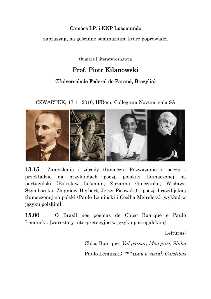 Camões I.P. i KNP Lusomundo zapraszają na gościnne seminarium, które poprowadzi tłumacz i literaturoznawca Prof. Piotr Kilanowski (Universidade Federal do Paraná, Paraná, Brazylia) Brazylia) CZWARTEK, 17.11.2016, IFRom, Collegium Novum, sala 9A 13.15 Zamyślenia i zdrady tłumacza. Rozważania o poezji i przekładzie na przykładach poezji polskiej tłumaczonej na portugalski (Bolesław Leśmian, Zuzanna Ginczanka, Wisława Szymborska, Zbigniew Herbert, Jerzy Ficowski) i poezji brazylijskiej tłumaczonej na polski (Paulo Leminski i Cecilia Meireless) [wykład w języku polskim] 15.00 O Brasil nos poemas de Chico Buarque e Paulo Leminski. [warsztaty interpretacyjne w języku portugalskim] Leituras: Chico Buarque: Vai passar, Meu guri, Sinhá Paulo Leminski: *** (Lua à vista), Curitibas