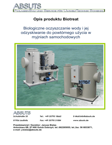 Opis produktu Biotreat Biologiczne oczyszczanie wody i jej odzyskiwanie do powtórnego uŜycia w myjniach samochodowych Schulstraße 35 Tel.: +49 35795 18662 E-Mail:[email protected] 01936 Laußnitz Fax: +49 35795 31084 www.absuts.de Przedstawiciel / Dyrektor: Janusz Bialas Antoniewo 6B, 87-400 Golub Dobrzyń; tel.:662265055; tel.,fax: 56 6833871, e-mail: [email protected] Opis produktu Urządzenie Biotreat do biologicznego oczyszczania wody i jej odzyskiwania do zastosowania w myjniach samochodowych Zastosowanie Urządzenie Biotreat jest przeznaczone do biologicznego oczyszczania wody w myjniach samochodowych i moŜe współpracować ze wszystkimi znanymi typami myjni samochodowych. System ten zapewnia dokładne, biologiczne oczyszczenie wody i jej odzysk do ponownego wykorzystania w myjni. Regulowany dostęp powietrza zapewnia wystarczającą, ściśle określoną dawkę tlenu do całego systemu, tworząc tym samym idealne warunki dla zastosowanych w urządzeniu kultur bakterii. Ponowne uŜycie wody następuje po dokładnym przefiltrowaniu i jej wysterylizowaniu. Stopień oczyszczenia wody w urządzeniu Biotreat odpowiada wymaganiom stawianym wodzie odprowadzanej do kanału deszczowego. Działanie: Biologiczne oczyszczanie wody jest zintegrowane z obiegiem wody, co pozwala oczyścić całą, znajdującą się w obiegu wodę. W rezultacie otrzymujemy wodę o wysokiej jakości, zgodnej z normami. Do pojemnika odbiorczego jest wprowadzone powietrze zaworem membranowym. Podczas pracy myjni, bogata w tlen, zuŜyta woda, jest podawaną pompą do filtra piaskowego, następnie jest odsysana drugą pompą do zbiornika wyjściowego. Stamtąd jest zasysana do myjni, zgodnie z potrzebami. Podczas przerw w pracy myjni zachodzi ten sam proces z tą tylko róŜnicą, Ŝe woda ze zbiornika wyjściowego, wraca do odpływu i w ten sposób urządzenie pozostaje cały czas w gotowości. Bogata w tlen woda sprawia, Ŝe osiągany jest wysoki poziom czystości wody uŜywanej ponownie do mycia. Kultury bakterii stale się reprodukują i dopasowują się do ilości poŜywienia, jakie znajduje się w wodzie zuŜytej do mycia. W ten sposób zapewniona jest stała, optymalna wydajność w oczyszczaniu zuŜytej wody. Ten naturalny proces czyszczenia w urządzeniu Biotreat wspierany jest przez stworzenie optymalnych warunków do Ŝycia mikroorganizmów. Uruchamiając urządzenie naleŜy wprowadzić do niego kultury odpowiednich bakterii i w ten sposób w krótkim czasie urządzenie jest gotowe do pracy, podczas której nie wydziela Ŝadnych nieprzyjemnych zapachów. Budowa urządzenia Biotreat Biotreat zostało pomyślane jako kompaktowe urządzenie, zbudowane z odpornego na uderzenia oraz na ługi i kwasy tworzywa PP. Wszystkie zastosowane rury są wykonane z PVC. Pompa doprowadzająca wodę oraz napowietrzająca są wykonane ze stali szlachetnej. Klasa ochrony szafki sterującej: IP 54. Sterowanie elektroniczne. Załączona jest szczegółowa instrukcja Obsługi. Wszystkie obwody zabezpieczone są bezpiecznikami. Filtr Ŝwirowy chroniący urządzenie W myjniach portalowych nie jest moŜliwe np.: wprowadzenie bezpośrednio z powrotem w dalszy obieg wody zuŜytej do mycia pojazdu, ze względu na zawartość zanieczyszczeń. Unoszące się z wodą zanieczyszczenia powodowałyby uszkodzenia dysz i zatykanie się urządzeń. Dlatego stosuje się, do pozbycia się tych zanieczyszczeń, filtr Ŝwirowy (do < 10 um). Składa się on z następujących elementów: obudowa filtra, dysze filtra w kształcie gwiazdek, stosuje się zwrotne przepłukiwanie filtra wodą pod ciśnieniem. Urządzenie podwyŜszające ciśnienie Woda do uŜytku jest zmagazynowana w zbiorniku. Pobierając wodę powodujemy spadek ciśnienia i wtedy zaczyna pracę pompa. Gdy ustanie pobór wody, wtedy następuje zamknięcie zaworu, wzrasta ciśnienie i pompa się wyłącza. Sterylizacja wody w celu ochrony uŜytkownika Woda oczyszczona, powracająca do uŜytku jest poddawana sterylizacji w celu ochrony uŜytkownika. Dysponujemy róŜnymi systemami. Są to: działanie promieniami UV, natlenianie lub tez dodawanie wody utlenionej. Opis urządzenia zbiornik na wodę sterylizacja promieniami UV pompa filtra Ŝwirowego napowietrzanie zawór spustowy regulacja wysokości Pompa tłocząca filtr Ŝwirowy sterowanie pompa dozująca napowietrzacz Zalety zastosowanej technologii - bezciśnieniowy filtr Ŝwirowy - kompaktowa budowa - zajmuje niewiele miejsca - duŜa wydajność a to oznacza małe zapotrzebowanie na wodę - duŜy otwór do obsługi filtra - moŜliwość regulacji ustawienia zestawu rury z PP / PCV obudowa z PP duŜy otwór do Obsługi filtra NajwaŜniejsze składniki: - obudowa z PP odporna na uderzenia - rama ze stali ocynkowanej z regulowanymi stopkami - rury i uszczelki z PCV - bezciśnieniowy filtr Ŝwirowy o duŜej pojemności Sterowanie: - wykonane wg norm EU - stopień izolacji obudowy metalowej: IP 54 - programowalne sterowanie firmy Simens - wizualizacja firmy Simens - regulowany czas trwania wszystkich procesów - zastosowano: bezpiecznik główny, bezpieczniki sterowania, bezpieczniki przeciąŜeniowe Wizualizacja Programowalne sterowanie