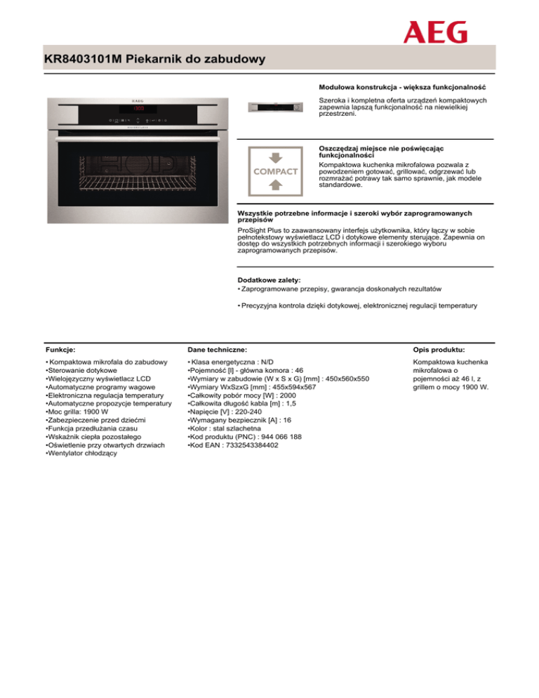 KR8403101M Piekarnik do zabudowy Modułowa konstrukcja - większa funkcjonalność Szeroka i kompletna oferta urządzeń kompaktowych zapewnia lapszą funkcjonalność na niewielkiej przestrzeni. Oszczędzaj miejsce nie poświęcając funkcjonalności Kompaktowa kuchenka mikrofalowa pozwala z powodzeniem gotować, grillować, odgrzewać lub rozmrażać potrawy tak samo sprawnie, jak modele standardowe. Wszystkie potrzebne informacje i szeroki wybór zaprogramowanych przepisów ProSight Plus to zaawansowany interfejs użytkownika, który łączy w sobie pełnotekstowy wyświetlacz LCD i dotykowe elementy sterujące. Zapewnia on dostęp do wszystkich potrzebnych informacji i szerokiego wyboru zaprogramowanych przepisów. Dodatkowe zalety: • Zaprogramowane przepisy, gwarancja doskonałych rezultatów • Precyzyjna kontrola dzięki dotykowej, elektronicznej regulacji temperatury Funkcje: Dane techniczne: Opis produktu: • Kompaktowa mikrofala do zabudowy •Sterowanie dotykowe •Wielojęzyczny wyświetlacz LCD •Automatyczne programy wagowe •Elektroniczna regulacja temperatury •Automatyczne propozycje temperatury •Moc grilla: 1900 W •Zabezpieczenie przed dziećmi •Funkcja przedłużania czasu •Wskaźnik ciepła pozostałego •Oświetlenie przy otwartych drzwiach •Wentylator chłodzący • Klasa energetyczna : N/D •Pojemność [l] - główna komora : 46 •Wymiary w zabudowie (W x S x G) [mm] : 450x560x550 •Wymiary WxSzxG [mm] : 455x594x567 •Całkowity pobór mocy [W] : 2000 •Całkowita długość kabla [m] : 1,5 •Napięcie [V] : 220-240 •Wymagany bezpiecznik [A] : 16 •Kolor : stal szlachetna •Kod produktu (PNC) : 944 066 188 •Kod EAN : 7332543384402 Kompaktowa kuchenka mikrofalowa o pojemności aż 46 l, z grillem o mocy 1900 W. KR8403101M Piekarnik do zabudowy