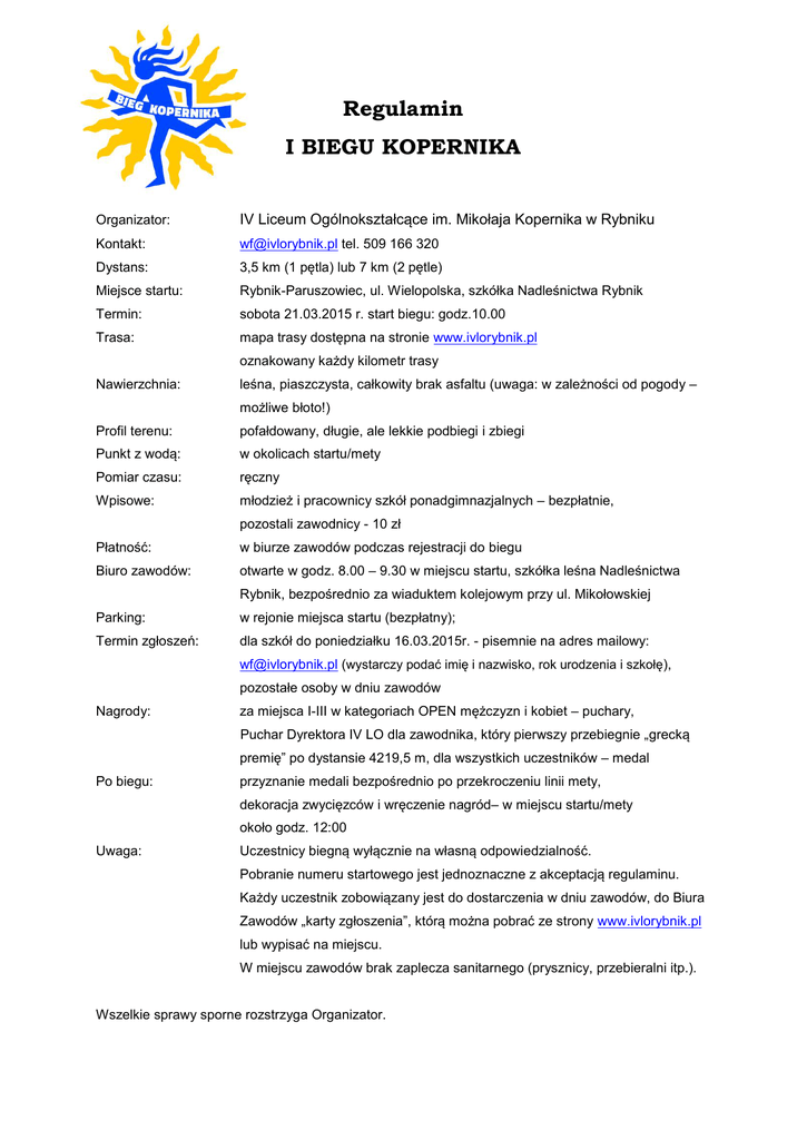 Regulamin I BIEGU KOPERNIKA Organizator: IV Liceum Ogólnokształcące im. Mikołaja Kopernika w Rybniku Kontakt: [email protected] tel. 509 166 320 Dystans: 3,5 km (1 pętla) lub 7 km (2 pętle) Miejsce startu: Rybnik-Paruszowiec, ul. Wielopolska, szkółka Nadleśnictwa Rybnik Termin: sobota 21.03.2015 r. start biegu: godz.10.00 Trasa: mapa trasy dostępna na stronie www.ivlorybnik.pl oznakowany każdy kilometr trasy Nawierzchnia: leśna, piaszczysta, całkowity brak asfaltu (uwaga: w zależności od pogody – możliwe błoto!) Profil terenu: pofałdowany, długie, ale lekkie podbiegi i zbiegi Punkt z wodą: w okolicach startu/mety Pomiar czasu: ręczny Wpisowe: młodzież i pracownicy szkół ponadgimnazjalnych – bezpłatnie, pozostali zawodnicy - 10 zł Płatność: w biurze zawodów podczas rejestracji do biegu Biuro zawodów: otwarte w godz. 8.00 – 9.30 w miejscu startu, szkółka leśna Nadleśnictwa Rybnik, bezpośrednio za wiaduktem kolejowym przy ul. Mikołowskiej Parking: w rejonie miejsca startu (bezpłatny); Termin zgłoszeń: dla szkół do poniedziałku 16.03.2015r. - pisemnie na adres mailowy: [email protected] (wystarczy podać imię i nazwisko, rok urodzenia i szkołę), pozostałe osoby w dniu zawodów Nagrody: za miejsca I-III w kategoriach OPEN mężczyzn i kobiet – puchary, Puchar Dyrektora IV LO dla zawodnika, który pierwszy przebiegnie „grecką premię” po dystansie 4219,5 m, dla wszystkich uczestników – medal Po biegu: przyznanie medali bezpośrednio po przekroczeniu linii mety, dekoracja zwycięzców i wręczenie nagród– w miejscu startu/mety około godz. 12:00 Uwaga: Uczestnicy biegną wyłącznie na własną odpowiedzialność. Pobranie numeru startowego jest jednoznaczne z akceptacją regulaminu. Każdy uczestnik zobowiązany jest do dostarczenia w dniu zawodów, do Biura Zawodów „karty zgłoszenia”, którą można pobrać ze strony www.ivlorybnik.pl lub wypisać na miejscu. W miejscu zawodów brak zaplecza sanitarnego (prysznicy, przebieralni itp.). Wszelkie sprawy sporne rozstrzyga Organizator.