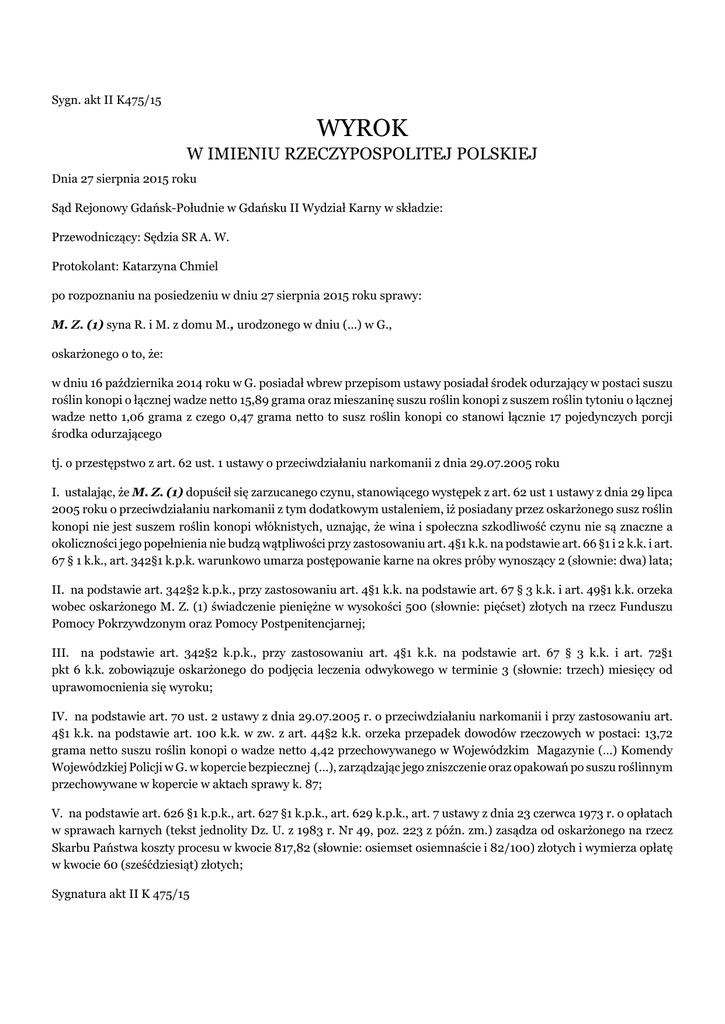 Sygn. akt II K475/15 WYROK W IMIENIU RZECZYPOSPOLITEJ POLSKIEJ Dnia 27 sierpnia 2015 roku Sąd Rejonowy Gdańsk-Południe w Gdańsku II Wydział Karny w składzie: Przewodniczący: Sędzia SR A. W. Protokolant: Katarzyna Chmiel po rozpoznaniu na posiedzeniu w dniu 27 sierpnia 2015 roku sprawy: M. Z. (1) syna R. i M. z domu M., urodzonego w dniu (...) w G., oskarżonego o to, że: w dniu 16 października 2014 roku w G. posiadał wbrew przepisom ustawy posiadał środek odurzający w postaci suszu roślin konopi o łącznej wadze netto 15,89 grama oraz mieszaninę suszu roślin konopi z suszem roślin tytoniu o łącznej wadze netto 1,06 grama z czego 0,47 grama netto to susz roślin konopi co stanowi łącznie 17 pojedynczych porcji środka odurzającego tj. o przestępstwo z art. 62 ust. 1 ustawy o przeciwdziałaniu narkomanii z dnia 29.07.2005 roku I. ustalając, że M. Z. (1) dopuścił się zarzucanego czynu, stanowiącego występek z art. 62 ust 1 ustawy z dnia 29 lipca 2005 roku o przeciwdziałaniu narkomanii z tym dodatkowym ustaleniem, iż posiadany przez oskarżonego susz roślin konopi nie jest suszem roślin konopi włóknistych, uznając, że wina i społeczna szkodliwość czynu nie są znaczne a okoliczności jego popełnienia nie budzą wątpliwości przy zastosowaniu art. 4§1 k.k. na podstawie art. 66 §1 i 2 k.k. i art. 67 § 1 k.k., art. 342§1 k.p.k. warunkowo umarza postępowanie karne na okres próby wynoszący 2 (słownie: dwa) lata; II. na podstawie art. 342§2 k.p.k., przy zastosowaniu art. 4§1 k.k. na podstawie art. 67 § 3 k.k. i art. 49§1 k.k. orzeka wobec oskarżonego M. Z. (1) świadczenie pieniężne w wysokości 500 (słownie: pięćset) złotych na rzecz Funduszu Pomocy Pokrzywdzonym oraz Pomocy Postpenitencjarnej; III. na podstawie art. 342§2 k.p.k., przy zastosowaniu art. 4§1 k.k. na podstawie art. 67 § 3 k.k. i art. 72§1 pkt 6 k.k. zobowiązuje oskarżonego do podjęcia leczenia odwykowego w terminie 3 (słownie: trzech) miesięcy od uprawomocnienia się wyroku; IV. na podstawie art. 70 ust. 2 ustawy z dnia 29.07.2005 r. o przeciwdziałaniu narkomanii i przy zastosowaniu art. 4§1 k.k. na podstawie art. 100 k.k. w zw. z art. 44§2 k.k. orzeka przepadek dowodów rzeczowych w postaci: 13,72 grama netto suszu roślin konopi o wadze netto 4,42 przechowywanego w Wojewódzkim Magazynie (...) Komendy Wojewódzkiej Policji w G. w kopercie bezpiecznej (...), zarządzając jego zniszczenie oraz opakowań po suszu roślinnym przechowywane w kopercie w aktach sprawy k. 87; V. na podstawie art. 626 §1 k.p.k., art. 627 §1 k.p.k., art. 629 k.p.k., art. 7 ustawy z dnia 23 czerwca 1973 r. o opłatach w sprawach karnych (tekst jednolity Dz. U. z 1983 r. Nr 49, poz. 223 z późn. zm.) zasądza od oskarżonego na rzecz Skarbu Państwa koszty procesu w kwocie 817,82 (słownie: osiemset osiemnaście i 82/100) złotych i wymierza opłatę w kwocie 60 (sześćdziesiąt) złotych; Sygnatura akt II K 475/15 UZASADNIENIE Sąd ustalił następujący stan faktyczny: W dniu 16 października 2014 roku na polu w miejscowości P. M. Z. (1) znalazł rośliny marihuany, zerwał je i zapakował w foliowy worek. Tego samego dnia około godziny 18 udał się na ulicę (...) w G., gdzie jako ochroniarz budowy pracował jego kolega A. R.. Poza A. R. w przyczepie kempingowej, będącej jednocześnie „stróżówką”, przebywali także W. S. oraz M. N. (1). Oskarżony wyłożył rośliny marihuany na grzejnik celem jego wysuszenia. Następnie A. R. wymieszał susz z tytoniem i jego część schował do kieszeni bluzy. Działaniom mężczyzn przyglądali się przebywający poza przyczepą funkcjonariusze Policji S. A., A. S. i M. S., którzy następnie dokonali przeszukania ww. osób oraz przyczepy kempingowej. W wyniku podjętych działań w bluzie A. R. ujawniono kartkę papieru z napisem (...) z zawartością suszu roślinnego koloru zielonego, zaś w samej przyczepie susz roślinny koloru zielonego we fragmencie papieru toaletowego, susz roślinny koloru zielonego w chusteczce papierowej koloru białego oraz susz roślinny koloru zielonego w kartce papieru z niebieskim nadrukiem. O godz. 1:01 M. Z. (1) posiadał 0,69 mg/dm3alkoholu w wydychanym powietrzu. W mieszkaniach zajmowanym przez M. Z. (1), A. R., M. N. (2) oraz W. S. nie ujawniono substancji odurzających. dowody: protokoły zatrzymania osoby – k. 2, 8, 14, 21; protokoły przeszukania osoby, jej odzieży i podręcznych przedmiotów – k.5-6, 11-12, 17-18, 24-26; protokół przeszukania przyczepy kampingowej – k. 28-30 protokół z przebiegu badania trzeźwości – k. 20; protokoły przeszukania mieszkania – k. 44-45, 49-50, 53-54, 57-58; zeznania świadka M. Z. (2) – k.47v; wyjaśnienia oskarżonego M. Z. (1) – k. 76; zeznania świadka M. B. – k.38; zeznania świadka M. N. (2) – k. 60v; zeznania świadka W. S. – k.63; zeznania świadka A. R. – k.64v-65 Susz roślinny koloru zielonego we fragmencie papieru toaletowego oraz w chusteczce papierowej, zabezpieczony w trakcie przeszukania przyczepy kempingowej, ważył łącznie 15,89 g netto, nie był suszem roślin konopi włóknistych oraz stanowił 16 pojedynczych porcji środka odurzającego. Susz w kartce papieru z niebieskim nadrukiem był mieszaniną suszu roślin konopi i tytoniu, przy czym mieszanina ta zawierała 0,47 grama netto suszu roślin konopi, co stanowi pojedynczą porcję środka odurzającego. dowody: protokoły użycia testera narkotykowego – k.32, 33, 34, 35; opinia kryminalistyczna – k.66-71 M. Z. (1) w inkryminowanym czasie nie miał zniesionej ani w znacznym stopniu ograniczonej zdolności rozpoznania znaczenia czynu i pokierowania swoim postępowaniem. W aktualnym stanie zdrowia psychicznego może uczestniczyć w czynnościach procesowych. Oskarżony na posiedzeniu w przedmiocie warunkowego umorzenia postępowania karnego wyraził zgodę na zobowiązanie do podjęcia leczenia odwykowego. dowody: opinia sądowo – psychiatryczn