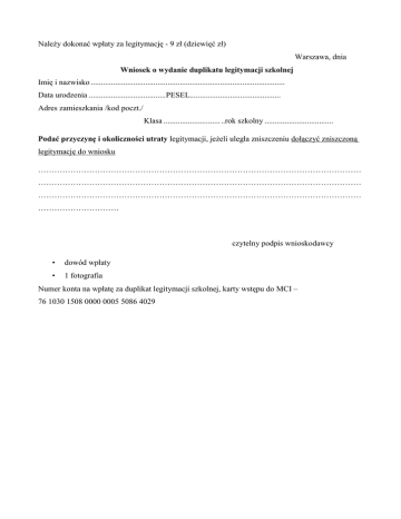 Należy dokonać wpłaty za legitymację - 9 zł (dziewięć zł) Warszawa, dnia Wniosek o wydanie duplikatu legitymacji szkolnej Imię i nazwisko ................................................................................................ Data urodzenia ...................................... PESEL............................................. Adres zamieszkania /kod poczt./ Klasa ............................ ..rok szkolny .................................. Podać przyczynę i okoliczności utraty legitymacji, jeżeli uległa zniszczeniu dołączyć zniszczoną legitymację do wniosku ………………………………………………………………………………………………………… ………………………………………………………………………………………………………… ………………………………………………………………………………………………………… ………………………… czytelny podpis wnioskodawcy • dowód wpłaty • 1 fotografia Numer konta na wpłatę za duplikat legitymacji szkolnej, karty wstępu do MCI – 76 1030 1508 0000 0005 5086 4029