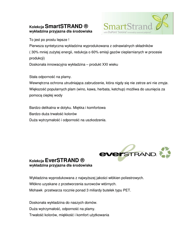 Kolekcja SmartSTRAND ® wykładzina przyjazna dla środowiska To jest po prostu lepsze ! Pierwsza syntetyczna wykładzina wyprodukowana z odnawialnych składników ( 30% mniej zużytej energii, redukcja o 60% emisji gazów cieplarnianych w procesie produkcji) Doskonała innowacyjna wykładzina – produkt XXI wieku Stała odporność na plamy. Wewnętrzna ochrona utrudniająca zabrudzenie, która nigdy się nie zetrze ani nie zmyje. Większość popularnych plam (wino, kawa, herbata, ketchup) możliwa do usunięcia za pomocą ciepłej wody Bardzo delikatna w dotyku. Miękka i komfortowa Bardzo duża trwałość kolorów Duża wytrzymałość i odporność na uszkodzenia. Kolekcja EverSTRAND ® wykładzina przyjazna dla środowiska Wykładzina wyprodukowana z najwyższej jakości włókien poliestrowych. Włókno uzyskane z przetworzenia surowców wtórnych. Mohawk przetwarza rocznie ponad 3 miliardy butelek typu PET. Doskonała wykładzina do naszych domów. Duża wytrzymałość, odporność na plamy. Trwałość kolorów, miękkość i komfort użytkowania