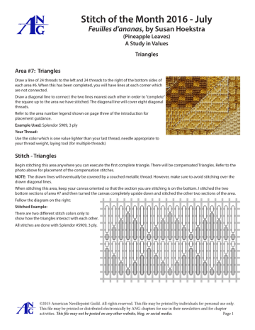 A Stitch of the Month 2016 - July Feuilles d’ananas, by Susan Hoekstra (Pineapple Leaves) A Study in Values Triangles Area #7: Triangles Draw a line of 24 threads to the left and 24 threads to the right of the bottom sides of each area #6. When this has been completed, you will have lines at each corner which are not connected. Draw a diagonal line to connect the two lines nearest each other in order to “complete” the square up to the area we have stitched. The diagonal line will cover eight diagonal threads. Refer to the area number legend shown on page three of the introduction for placement guidance. Example Used: Splendor S909, 3 ply Your Thread: Use the color which is one value lighter than your last thread, needle appropriate to your thread weight, laying tool (for multiple threads) Stitch - Triangles Begin stitching this area anywhere you can execute the first complete triangle. There will be compensated Triangles. Refer to the photo above for placement of the compensation stitches. NOTE: The drawn lines will eventually be covered by a couched metallic thread. However, make sure to avoid stitching over the drawn diagonal lines. When stitching this area, keep your canvas oriented so that the section you are stitching is on the bottom. I stitched the two bottom sections of area #7 and then turned the canvas completely upside down and stitched the other two sections of the area. Follow the diagram on the right: Stitched Example: There are two different stitch colors only to show how the triangles interact with each other. All stitches are done with Splendor #S909, 3 ply. A ©2015 American Needlepoint Guild. All rights reserved. This file may be printed by individuals for personal use only. This file may be printed or distributed electronically by ANG chapters for use in their newsletters and for chapter activities. This file may not be posted on any other website, blog, or social media. Page 1