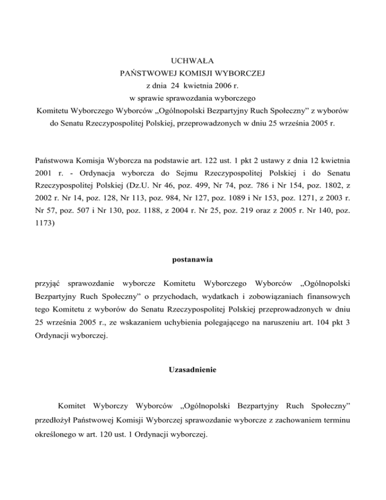 UCHWAŁA PAŃSTWOWEJ KOMISJI WYBORCZEJ z dnia 24 kwietnia 2006 r. w sprawie sprawozdania wyborczego Komitetu Wyborczego Wyborców „Ogólnopolski Bezpartyjny Ruch Społeczny” z wyborów do Senatu Rzeczypospolitej Polskiej, przeprowadzonych w dniu 25 września 2005 r. Państwowa Komisja Wyborcza na podstawie art. 122 ust. 1 pkt 2 ustawy z dnia 12 kwietnia 2001 r. - Ordynacja wyborcza do Sejmu Rzeczypospolitej Polskiej i do Senatu Rzeczypospolitej Polskiej (Dz.U. Nr 46, poz. 499, Nr 74, poz. 786 i Nr 154, poz. 1802, z 2002 r. Nr 14, poz. 128, Nr 113, poz. 984, Nr 127, poz. 1089 i Nr 153, poz. 1271, z 2003 r. Nr 57, poz. 507 i Nr 130, poz. 1188, z 2004 r. Nr 25, poz. 219 oraz z 2005 r. Nr 140, poz. 1173) postanawia przyjąć sprawozdanie wyborcze Komitetu Wyborczego Wyborców „Ogólnopolski Bezpartyjny Ruch Społeczny” o przychodach, wydatkach i zobowiązaniach finansowych tego Komitetu z wyborów do Senatu Rzeczypospolitej Polskiej przeprowadzonych w dniu 25 września 2005 r., ze wskazaniem uchybienia polegającego na naruszeniu art. 104 pkt 3 Ordynacji wyborczej. Uzasadnienie Komitet Wyborczy Wyborców „Ogólnopolski Bezpartyjny Ruch Społeczny” przedłożył Państwowej Komisji Wyborczej sprawozdanie wyborcze z zachowaniem terminu określonego w art. 120 ust. 1 Ordynacji wyborczej. 2 Do sprawozdania dołączono opinię i raport biegłego rewidenta, wybranego przez Państwową Komisję Wyborczą. Sprawozdanie wyborcze zostało sporządzone według wzoru określonego w rozporządzeniu Ministra Finansów z dnia 23 lipca 2001 r. w sprawie sprawozdania komitetu wyborczego w wyborach do Sejmu Rzeczypospolitej Polskiej i do Senatu Rzeczypospolitej Polskiej (Dz.U. Nr 81, poz. 881). Żaden z uprawnionych podmiotów wymienionych w art. 122 ust. 5 Ordynacji wyborczej nie zgłosił Państwowej Komisji Wyborczej zastrzeżeń do sprawozdania komitetu. W wyniku badania sprawozdania wyborczego oraz załączonych do niego dokumentów Państwowa Komisja Wyborcza stwierdziła, że Komitet uzyskał przychody w wysokości 6.100,04 zł, zgodnie z art. 111 ust. 2 Ordynacji wyborczej. Środki pochodziły z wpłat od osoby fizycznej i stosownie do art. 113 ust. 1 Ordynacji, wpłacone zostały na rachunek bankowy o nr 37 1020 2472 0000 6702 0153 8875 prowadzony w PKO BP O/Wodzisław Śląski. Pozyskiwanie i wydatkowanie środków finansowych przez Komitet odbywało się w terminach nie naruszających przepisów art. 110 ust. 2 i 4 Ordynacji wyborczej. Koszty kampanii wyborczej wykazane w sprawozdaniu wynoszą 6.268,48 zł. Jak wynika z analizy historii rachunku bankowego Komitetu oraz faktur załączonych do sprawozdania, kwota 6.028,34 zł wydatkowana była, zgodnie z art. 110 ust 1 Ordynacji, na reklamę wyborczą. Pozostałą kwotę 71,70 zł w dniu 10 października 2005 r. wypłacił z rachunku bankowego Komitetu jego pełnomocnik wyborczy w celu pokrycia zobowiązania wobec Zakładu Gospodarki Mieszkaniowej i Remontowej w Wodzisławiu Śląskim za wynajem lokalu. Pozostające po dniu wyborów zobowiązania zostały spłacone przez osoby fizyczne. Przejęcie zobowiązania finansowego Komitetu na rzecz Polskapresse Sp. z o.o., za ogłoszenia w „Gryfie Kościerskim” na łączną kwotę 154,94 zł przez osobę fizyczną, która nie wchodzi w skład Komitetu Wyborczego Wyborców stanowi naruszenie art. 104 pkt 3 3 Ordynacji wyborczej. W świetle art. 122 ust. 1 ustawy wskazane uchybienie nie powoduje odrzucenia sprawozdania. Państwowa Komisja Wyborcza, po zapoznaniu się ze sprawozdaniem wyborczym Komitetu oraz dokumentami do niego załączonymi postanowiła jak w sentencji. Od niniejszego postanowienia nie przysługuje środek prawny. Przewodniczący Państwowej Komisji Wyborczej: Ferdynand Rymarz Zastępcy Przewodniczącego Państwowej Komisji Wyborczej: Jan Kacprzak, Stanisław Kosmal Członkowie Państwowej Komisji Wyborczej: Stefan Jaworski, Andrzej Kisielewicz, Włodzimierz Ryms, Stanisław Zabłocki, Tadeusz Żyznowski