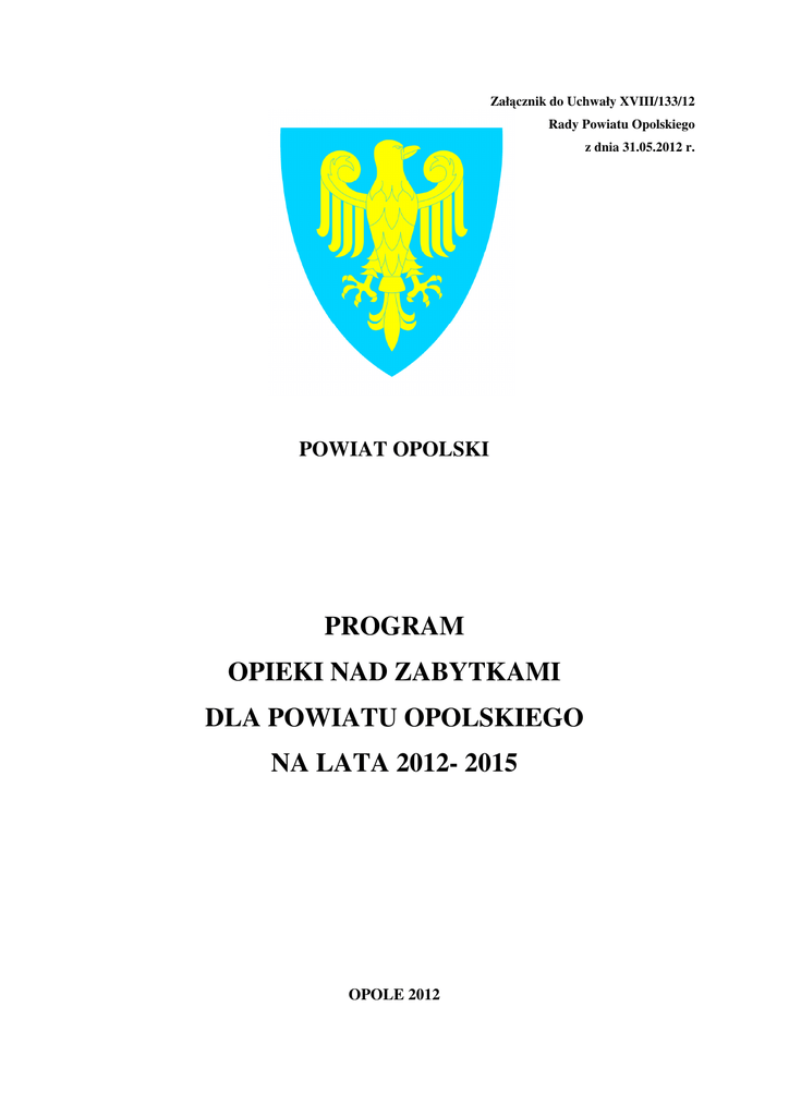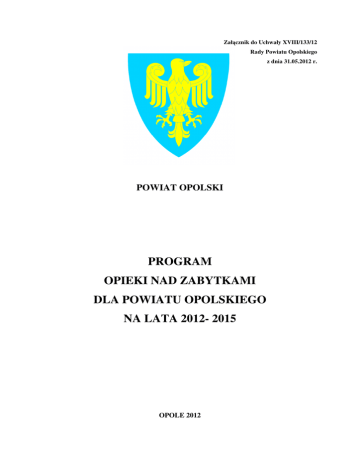 Załącznik do Uchwały XVIII/133/12 Rady Powiatu Opolskiego z dnia 31.05.2012 r. POWIAT OPOLSKI PROGRAM OPIEKI NAD ZABYTKAMI DLA POWIATU OPOLSKIEGO NA LATA 2012- 2015 OPOLE 2012 SPIS TREŚCI STR. WPROWADZENIE 4 I. PODSTAWA PRAWNA OPRACOWANIA POWIATOWEGO PROGRAMU OPIEKI NAD ZABYTKAMI 5 II. UWARUNKOWANIA PRAWNE OCHRONY ZABYTKÓW I OPIEKI NAD ZABYTKAMI W POLSCE 5 III. ZADANIA POWIATU W ZAKRESIE OCHRONY I OPIEKI NAD ZABYTKAMI 7 IV. UWARUNKOWANIA ZEWNĘTRZNE OCHRONY DZIEDZICTWA KULTUROWEGO 14 V. UWARUNKOWANIA WEWNĘTRZNE OCHRONY DZIEDZICTWA KULTUROWEGO 20 VI. CHARAKTERYSTYKA ZASOBÓW I ANALIZA STANU DZIEDZICTWA I KRAJOBRAZU KULTUROWEGO POWIATU OPOLSKIEGO 22 6.1. Historia powiatu opolskiego 22 6.2. Krajobraz kulturowy powiatu opolskiego 23 6.2.1. Rezerwaty przyrody 27 6.2.2. Stobrawski Park Krajobrazowy 28 6.2.3. Pomniki przyrody 28 6.2.4. Stanowisko dokumentacyjne „Trias” w Krasiejowie 29 6.2.5. Zespół przyrodniczo krajobrazowy – Lipno 30 6.3. Zabytki nieruchome 31 6.4. Zabytki ruchome 39 6.5. Zabytki archeologiczne 45 2 6.6. Zabytki zlokalizowane na terenie powiatu opolskiego 48 6.6.1. Kościoły drewniane w powiecie opolskim 48 6.6.2. Kościoły murowane w powiecie opolskim 52 6.6.3. Kapliczki na terenie powiatu opolskiego 64 6.6.4. Zabytki industrializacji 65 6.6.5. Pałace, zamki i dwory z terenu powiatu 68 6.7. Zabytki, do których Powiat Opolski posiada tytuł prawny 72 VII. OCENA STANU DZIEDZICTWA KULTUROWEGO NA TERENIE POWIATU – ANALIZA SWOT 79 VIII. ZAŁOŻENIA PROGRAMU OPIEKI NAD ZABYTKAMI POWIATU OPOLSKIEGO NA LATA 2012−2015 8.1. Cele operacyjne i podejmowanie w ich zakresie działania IX. 82 83 INSTRUMENTARIUM REALIZACJI PROGRAMU OPIEKI NAD ZABYTKAMI 87 X. ZASADY OCENY REALIZACJI PROGRAMU 88 XI. ŹRÓDŁA FINANSOWANIA PROGRAMU 89 XII. REALIZACJA PRZEZ POWIAT OPOLSKI ZADAŃ Z ZAKRESU OCHRONY ZABYTKÓW W LATACH 2012-2015 93 ZAŁĄCZNIK: Nr 1 - Wykaz prac wykonanych przy zabytkach będących własnością Powiatu Opolskiego w latach 2009 – 2011 95 Nr 2 – Wykaz obiektów nieruchomych wpisanych do ewidencji zabytków gmin powiatu opolskiego (wersja elektroniczna na płycie CD) 3 Wprowadzenie Dziedzictwo kulturowe to jeden z najważniejszych czynników życia i działalności człowieka. Stanowi dorobek materialny i duchowy poprzednich pokoleń, a także dorobek naszych czasów. Oznacza zarówno wartość materialną jak i niematerialną, przekazaną przez przodków i określającą naszą kulturę. Bogactwo i różnorodność dziedzictwa kultury może w istotny sposób przyczynić się do rozwoju społeczno-gospodarczego powiatu, a tym samym do poprawy jakości życia jej mieszkańców. Na krajobraz kulturowy składają się tak elementy przyrodnicze, jak i wytwory, i osiągnięcia cywilizacyjne człowieka. Są to pojedyncze obiekty i zespoły budowli, dzieła sztuki, elementy zagospodarowania przestrzeni, krajobraz miejski i wiejski, obszary kształtujące świadomość i tożsamość regionalną mieszkańców. Powiat opolski ze względu na położenie geograficzne był miejscem przeplatania się różnych kultur. Krzyżowały się w nim drogi i szlaki handlowe, stanowił azyl dla uchodźców religijnych i był miejscem nowego życia dla przybywających kolonistów. Ślady przenikania się kultur, zwłaszcza polskiej i niemieckiej, znajdziemy w architekturze, rzemiośle, obrzędach i folklorze. Do dzisiaj przetrwało wiele skarbów kultury materialnej ukazujących zmienne losy i skomplikowane układy polityczne tego regionu, to m.in. zamki, pałace, świątynie, a także kapliczki, krzyże przydrożne, budowle użyteczności publicznej, układy przestrzenne miast i wsi, zabytki techniczne, nekropolie, parki dworskie i arboreta. Każdy z nich jest kroniką, swoistą opowieścią ludzkiego losu, a przez to obrazem całej społeczności. Historia nie oszczędzała tej ziemi. Prawie co 200 lat zmieniali się dysponenci. Byli nimi królowie polscy, czescy, potem zaś władali nią cesarze niemieccy, a następnie królowie pruscy, aby znów powrócić w granice Polski. Niniejsze opracowanie podaje podstawy prawne i główne cele polityki Powiatu Opolskiego w zakresie dziedzictwa kulturowego, priorytety dotyczące opieki nad zabytkami określa w kontekście obowiązujących dokumentów o charakterze strategicznym, takich jak: Narodowa Strategia Kultury na lata 2004-2013, Strategia Rozwoju Województwa Opolskiego. Przedstawia zasoby dziedzictwa kulturowego w powiecie opolskim, uproszczoną analizę SWOT, założenia programu oraz sposób realizacji i finansowania działań w ramach Programu. 4 I. Podstawa prawna opracowania Powiatowego Programu Opieki nad Zabytkami Przedmiotem opracowania programu opieki nad zabytkami jest ochrona dziedzictwa kulturowego znajdującego się w granicach administracyjnych powiatu opolskiego, natomiast celem jest określenie zasadniczych kierunków działań i zadań na rzecz wspomnianej wyżej ochrony i opieki nad zabytkami. Obowiązek sporządzenia na okres 4 lat Powiatowego Programu Opieki nad Zabytkami nakłada na Zarząd Powiatu art. 87 ust. 1 ustawy z dnia 23 lipca 2003 r. o ochronie zabytków i opiece nad zabytkami (Dz.U. 2003 r. Nr 162 poz. 1568 z późn. zm.) Opracowując „Program Opieki nad Zabytkami dla Powiatu Opolskiego na lata 2012-2015”, zwany dalej Programem, przyjęto zadania należące z mocy ustawy do obowiązków Powiatu m.in. opieki nad zabytkami, do których Powiat Opolski posiada tytuł prawny. Program określa również ogólną politykę Powiatu Opolskiego w dziedzinie opieki nad zabytkami, nie naruszając przy tym kompetencji poszczególnych gmin i praw właścicieli obiektów zabytkowych. Podstawą do opracowania Programu jest ewidencja zabytków prowadzona przez Wojewódzkiego Konserwatora Zabytków. Zarząd Powiatu Opolskiego zgodnie z art. 87 ust. 5 ww. ustawy sporządza co 2 lata, sprawozdanie, które przedstawia Radzie Powiatu Opolskiego. II. Uwarunkowania prawne ochrony i opieki nad zabytkami w Polsce 1. Ustaw