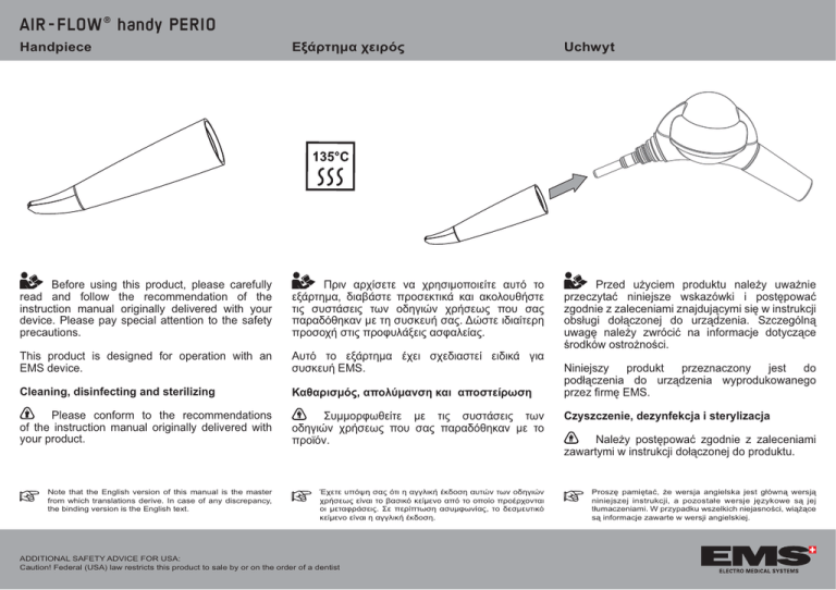 AIR-FLOW® handy PERIO Handpiece Εξάρτημα χειρός Uchwyt Before using this product, please carefully read and follow the recommendation of the instruction manual originally delivered with your device. Please pay special attention to the safety precautions. Πριν αρχίσετε να χρησιμοποιείτε αυτό το εξάρτημα, διαβάστε προσεκτικά και ακολουθήστε τις συστάσεις των οδηγιών χρήσεως που σας παραδόθηκαν με τη συσκευή σας. Δώστε ιδιαίτερη προσοχή στις προφυλάξεις ασφαλείας. Przed użyciem produktu należy uważnie przeczytać niniejsze wskazówki i postępować zgodnie z zaleceniami znajdującymi się w instrukcji obsługi dołączonej do urządzenia. Szczególną uwagę należy zwrócić na informacje dotyczące środków ostrożności. This product is designed for operation with an EMS device. Αυτό το εξάρτημα έχει σχεδιαστεί ειδικά για συσκευή EMS. Cleaning, disinfecting and sterilizing Καθαρισμός, απολύμανση και αποστείρωση Please conform to the recommendations of the instruction manual originally delivered with your product. Συμμορφωθείτε με τις συστάσεις των οδηγιών χρήσεως που σας παραδόθηκαν με το προϊόν. Note that the English version of this manual is the master from which translations derive. In case of any discrepancy, the binding version is the English text. Έχετε υπόψη σας ότι η αγγλική έκδοση αυτών των οδηγιών χρήσεως είναι το βασικό κείμενο από το οποίο προέρχονται οι μεταφράσεις. Σε περίπτωση ασυμφωνίας, το δεσμευτικό κείμενο είναι η αγγλική έκδοση. ADDITIONAL SAFETY ADVICE FOR USA: Caution! Federal (USA) law restricts this product to sale by or on the order of a dentist Niniejszy produkt przeznaczony jest do podłączenia do urządzenia wyprodukowanego przez firmę EMS. Czyszczenie, dezynfekcja i sterylizacja Należy postępować zgodnie z zaleceniami zawartymi w instrukcji dołączonej do produktu. Proszę pamiętać, że wersja angielska jest główną wersją niniejszej instrukcji, a pozostałe wersje językowe są jej tłumaczeniami. W przypadku wszelkich niejasności, wiążące są informacje zawarte w wersji angielskiej. Hаконечник Ručna jedinica Tutacak kısmı Прежде, чем приступать к эксплуатации изделия, внимательно ознакомьтесь с руководством по эксплуатации, которое входит в комплект поставки данного изделия. Уделите особое внимание мерам безопасности. Prije uporabe ovog proizvoda, molimo da pažljivo pročitate i pratite preporuke priručnika s instrukcijama izvorno dostavljenih uz vaš uređaj. Molimo da obratite poseban pozor na mjere sigurnosti. Bu ürünü kullanmadan önce lütfen cihazınızla birlikte verilen talimatlar el kitabındaki tavsiyeleri dikkatle okuyun ve riayet edin. Güvenlik tedbirlerine lütfen özellikle dikkat edin. Данное изделие рассчитано на подключению к устройству EMS. Ovaj proizvod namijenjen je za povezivanje s uređajem EMS. Чистка, дезинфекция и стерилизация Čištění, dezinfekce a sterilizace Просьба соблюдать рекомендации, изложенные в инструкции по эксплуатации, прилагаемой к изделию. Řiďte se, prosím, doporučeními uvedenými v návodu k obsluze, který byl dodán společně s vaším produktem. Следует иметь в виду, что основным вариантом настоящего руководства явялется англоязычный, поэтому в случае возникновения недоразумений следует обращаться к нему. Napominjemo da je inačica na engleskom jeziku ove instrukcije izvornik iz koga potječu prijevodi. U slučaju bilo kakvog odstupanja, obvezujuća inačica je tekst na engleskom jeziku. Bu ürün bir EMS cihazına bağlanmak üzere tasarlanmıştır. EMS Electro Medical Systems SA Ch. de la Vuarpillière 31 1260 Nyon / Switzerland Tel. +41 22 99 44 700 Fax +41 22 99 44 701 e-mail: [email protected] www.ems-swissquality.ch EMS worldwide offices EMS Canada Inc. 6525 Décarie, Suite 205 Montréal Québec H3W 3E3 Canada Tel. +1 514 736 5066 Fax. +1 514 736 5065 e-mail: [email protected] EMS France Sarl / 23, Av. Louis Bréguet Immeuble Santos Dumont, Bât. D, F-78140 Vélizy Villacoublay Tél. +33 1 34 58 03 80 Fax +33 1 34 58 03 90 e-mail: [email protected] EMS Germany Gmbh Schatzbogen 86 D-81829 München Tel. +49 89 42 71 610 Fax +49 89 42 71 6160 e-mail: [email protected] EMS Italia S.p.a. Via Faravelli 5 I-20149 Milano Tel. +39 02 3453 8111 Fax +39 02 3453 2778 e-mail: [email protected] Lütfen ürününüz ile birlikte verilen kullanım kılavuzundaki tavsiyelere uygun hareket ediniz. FB-442/5 Bu el kitabının İngilizce versiyonunun ana metin olduğunu ve çevirilere esas oluşturduğunu lütfen unutmayın. Herhangi bir farklılık olması durumunda, İngilizce metin bağlayıcı versiyon olacaktır. © Copyright EMS SA Temizleme, dezenfeksiyon ve sterilizasyon ed. 2008/06 AIR-FLOW® handy PERIO EMS España SL Bernardino Obregón 14 bis, E-28012 Madrid Tlf. +34 91 528 99 89 Fax +34 91 539 34 89 e-mail: [email protected] EMS Corporation 11886 Greenville Ave. #120 Dallas TX-75243, USA Tel. +1 972 690 83 82 Fax +1 972 690 89 81 e-mail: [email protected]