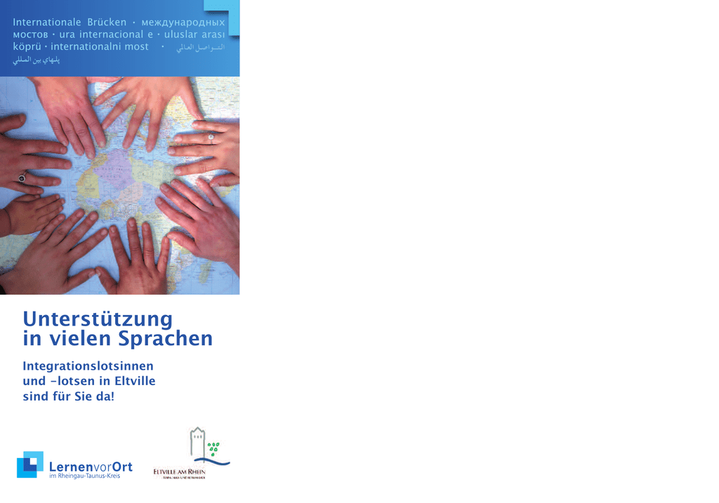 Internationale Brücken • международных мостов • ura internacional e • uluslar arası köprü • internationalni most • Unterstützung in vielen Sprachen Integrationslotsinnen und -lotsen in Eltville sind für Sie da! Integrationslotsinnen/-lotsen der Stadt Eltville Wir kommen aus verschiedenen Ländern der Welt und leben in Eltville. Wir bieten anderen ausländischen Bürgerinnen und Bürgern der Stadt Eltville: Unterstützung bei der Suche nach einem geeigneten Sprachkurs Hilfe beim Ausfüllen von Formularen Unterstützung bei dem Besuch einer Behörde, eines Arztes oder einer anderen Einrichtung Begleitung zu einem Elterngespräch in der Schule oder im Kindergarten Und anderes mehr…. Wir arbeiten ehrenamtlich und vertraulich! Rufen Sie uns an oder kommen Sie während unserer Sprechzeit ins Mehrgenerationenhaus/ MÜZE e.V.: Tel.: 06123-701772 (auch Anrufbeantworter möglich) Das Büro des Mehrgenerationenhaus/MÜZE e.V. ist vormittags immer besetzt. Hier können Rückrufbitten an uns hinterlassen werden. Mehrgenerationenhaus/MÜZE e.V. Gutenbergstr. 38, 65343 Eltville Sprechzeit der Integrationslots/innen: Freitag 16.30 – 18:00 Uhr Eltville Şehri Uyum kılavuzları Biz dünyanın değişik ülkelerinden geliyoruz ve Eltville̕ de yaşıyoruz. Eltville şehrinin yabancı kökenli halkına aşağıdaki hizmetleri veriyoruz: Kişiye özel uygun dil kursu seçim yardımı Form doldurma̕da destek Alman makamları, resmi kurumlar veya doktor randevularınız̕da size eşlik etmek Okullar̕da veya anaokulların̕da olan veli ve öğretmen görüşmelerin̕de size eşlik etmek Daha bir çok alanda size yardımcı olabiliriz Bizler gönüllü olarak çalışıyoruz ve sır saklama yükümlülüğüne tabiyiz! Bizlere telefonla veya yazılı olarak ulaşabilirsiniz: Mehrgenerationenhaus/MÜZE e.V., Gutenbergstr. 38, 65343 Eltville Tel.: 06123/701772 Büromuz sabahları daima açıktır. Büromuza bıraktığınız mesajlar bize derhal iletilecektir. Randevularımız anlaşmalıdır. Uyum Klavuzluğu büromuza cuma günleri saat 16.30 ile 18.00 arası ulaşabilirsiniz. Przewodnicy integracyjni miasta Eltville Mieszkamy w Eltville, ale pochodzimy z róUnych stron świata. Pomagamy wszystkim obcojęzycznych mieszkańcom miasta Eltville: w znalezieniu odpowiedniego kursu nauki języka niemieckiego w wypełnianiu wszelkiego rodzaju formularzy w znalezieniu niezbędnych urzędów, lekarzy itp. Oprzy prowadzeniu rodzicielskich rozmów w szkole lub przedszkolu równieU w innych sytaucjach, w których potrzebne jest wsparcie Pracujemy bezpłatnie oraz gwarantujemy pełną dyskrecję. MoUesz skontaktować się z nami telefonicznie (telefon 06123–701772 takUe z automatyczną sekretarką) lub przyjść osobiście. Urzędujemy w piątki w Mehrgenerationenhaus/MÜZE e.V. (Dom Wielu Generacji) między godziną 16.30 a 18.00. Biuro w Mehrgenerationenhaus/MÜZE e.V. jest przed południem zawsze otwarte, więc moUesz zostawić w biurze swój numer telefonu, wtedy my do Ciebie zadzwonimy. Mehrgenerationenhaus/MÜZE e.V. Gutenbergstraße 38 65343 Eltville Integration Lotsen in the City of Eltville We Integration Guides come from different countries around the world and live in Eltville. We offer other foreigners in Eltville and Rheingau the following assistance: Our help is voluntary, free of charge, confidential! Contact us: Visiting hours: Friday 16:30 – 18:00 h (4:30-6:00 pm) and by arrangement Mehrgenerationenhaus/MÜZE e.V., Gutenbergstr. 38, 65343 Eltville Telephone: 06123-701772 The office is occupied in the morning. If you leave a message with your telephone number, we will call back as soon as possible. We will also arrange for Integration Guides who speak other languages. Impressum Mehrgenerationenhaus/MÜZE e.V. Gutenbergstr. 38 65343 Eltville 06123-701772 Christine Knapp-Aschberger Lernen vor Ort im Rheingau-Taunus-Kreis, vhs Rheingau-Taunus e.V. Ein Projekt der Fachstelle Bildung des RheingauTaunus-Kreises und des Büros LERNENDE NETZWERK REGION der vhs Rheingau-Taunus e.V. www.lernen-vor-ort.net Fotos: contrastwerkstatt, Joachim Wendler, Franz Pfluegl help in adjusting to life in Germany translation at appointments with official authorities, doctors, and other institutions talks with teachers at school and kindergarten help in filling out forms finding a German course that's right for you help with your particular problems and more....