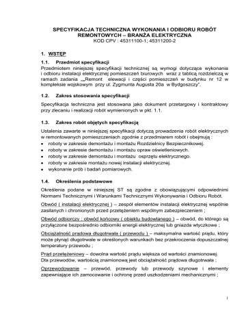 SPECYFIKACJA TECHNICZNA WYKONANIA I ODBIORU ROBÓT REMONTOWYCH – BRANŻA ELEKTRYCZNA KOD CPV : 45311100-1; 45311200-2 1. WSTĘP 1.1. Przedmiot specyfikacji Przedmiotem niniejszej specyfikacji technicznej są wymogi dotyczące wykonania i odbioru instalacji elektrycznej pomieszczeń biurowych wraz z tablicą rozdzielczą w ramach zadania „„Remont elewacji i części pomieszczeń w budynku nr 12 w kompleksie wojskowym przy ul. Zygmunta Augusta 20a w Bydgoszczy”. 1.2. Zakres stosowania specyfikacji Specyfikacja techniczna jest stosowana jako dokument przetargowy i kontraktowy przy zlecaniu i realizacji robót wymienionych w pkt. 1.1. 1.3. Zakres robót objętych specyfikacją Ustalenia zawarte w niniejszej specyfikacji dotyczą prowadzenia robót elektrycznych w remontowanych pomieszczeniach zgodnie z przedmiarem robót i obejmują : roboty w zakresie demontażu i montażu Rozdzielnicy Bezpiecznikowej. roboty w zakresie demontażu i montażu opraw oświetleniowych. roboty w zakresie demontażu i montażu osprzętu elektrycznego. roboty w zakresie montażu nowej instalacji elektrycznej. wykonanie prób i badań pomiarowych. 1.4. Określenia podstawowe Określenia podane w niniejszej ST są zgodne z obowiązującymi odpowiednimi Normami Technicznymi i Warunkami Technicznymi Wykonywania i Odbioru Robót. Obwód ( instalacji elektrycznej ) – zespół elementów instalacji elektrycznej wspólnie zasilanych i chronionych przed przetężeniem wspólnym zabezpieczeniem ; Obwód odbiorczy : obwód końcowy ( obiektu budowlanego ) – obwód, do którego są przyłączone bezpośrednio odbiorniki energii elektrycznej lub gniazda wtyczkowe ; Obciążalność prądowa długotrwała ( przewodu ) – maksymalna wartość prądu, który może płynąć długotrwale w określonych warunkach bez przekroczenia dopuszczalnej temperatury przewodu ; Prąd przetężeniowy – dowolna wartość prądu większa od wartości znamionowej. Dla przewodów, wartością znamionową jest obciążalność prądowa długotrwała ; Oprzewodowanie – przewód, przewody lub przewody szynowe i elementy zapewniające ich zamocowanie i ochronę przed uszkodzeniami mechanicznymi ; 1 Urządzenia elektryczne – wszystkie urządzenia i elementy instalacji elektrycznej przeznaczone do takich celów jak wytwarzanie, przekształcanie, przesyłanie rozdział lub wykorzystanie energii elektrycznej ; Odbiorniki energii elektrycznej – urządzenia przeznaczono do przetwarzania energii elektrycznej w inną formę energii ( np. światło, ciepło, energię mechaniczną itp. ) ; Ochrona przed dotykiem pośrednim – ochrona dostępnych części przewodzących w przypadku pojawienia się na nich napięcia w warunkach zakłóceniowych ; Obudowa, osłona – element zapewniający ochronę przed niektórymi wpływami otoczenia i przed dotykiem bezpośrednim z dowolnej strony ; Przewód ochronny ( PE ) – przewód lub żyła przewodu przeznaczony do elektrycznego połączenia następujących części : dostępnej części przewodzącej, obcej przewodzącej, głównej szyny ( zacisku uziemiającego ), uziomu, uziemionego punktu naturalnego źródła zasilania lub punktu neutralnego sztucznego ; Przewód ochronno – neutralny ( PEN ) – uziemiony przewód ( żyła przewodu ) spełniający jednocześnie funkcje przewodu ochronnego i przewodu neutralnego ; Przewód uziemiający –przewód ochronny łączący główną szynę (zacisk) uziemiającą z uziomem ; Główna szyna uziemiająca – szyna ( zacisk ) przeznaczona do przyłączenia do uziomu przewodów ochronnych, w tym przewodów połączeń wyrównawczych oraz przewodów uziemień roboczych, jeżeli one występują ; Połączenia wyrównawcze – elektryczne połączenia części przewodzących dostępnych lub/i części przewodzących obcych w celu uzyskania wyrównania potencjałów . 2. MATERIAŁY 2.1. Wymagania ogólne Wszystkie zakupione przez Wykonawcę materiały, muszą być obrotu i powszechnego stosowania. Materiałami i wyrobami dopuszczonymi do obrotu i powszechnego dla których wydano certyfikat na znak bezpieczeństwa lub zgodności i wydano certyfikat lub deklarację zgodności z PN, techniczną. 2.2. - dopuszczone do stosowania są te, dokonano oceny BN lub aprobatą Zastosowane materiały przewody typu YDYp – 450/750 V 3x1,5 mm ; YDYp 450/750 V 3x2,5 mm oprawy oświetleniowe typu ONR 2x36 W rastrowe oprawy oświetleniowe rastrowe do sufitów podwieszanych 4x20W oprawy oświetleniowe plafoniery PK 211 IP 65 osprzęt modułowy : wyłączniki nadprądowe S301 10-16A 2 - osprzęt elektryczny podtynkowy (gniazdka podtynkowe podwójne 2-biegunowe z bolcem ochronnym, wyłączniki podtynkowe Składowanie materiałów : Materiały należy przechowywać w pomieszczeniach przystosowanych do tego celu, suchych, przewietrzanych i dobrze oświetlonych. Przewody izolowane przechowywać w pomieszczeniach suchych i chłodnych. Oprawy oświetleniowe, źródła światła, osprzęt elektryczny przechowywać w suchych i ciepłych pomieszczeniach najlepiej w opakowaniach fabrycznych. Dostarczać je na budowę w fazie końcowej, aby uniknąć zbędnych uszkodzeń. Wszystkie zastosowane materiały, zgodnie z ustawą „Prawo budowlane”, muszą być dopuszczone do obrotu i powszechnego stosowania. 3. SPRZĘT 3.1. Wymagania ogólne Wykonawca jest zobowiązany do użycia takiego sprzętu, który nie spowoduje niekorzystnego wpływu na jakość wykonywanych robót, zarówno w miejscu tych robót, jak też przy wykonywaniu czynności pomocniczych oraz w czasie transportu, załadunku i wyładunku materiałów, sprzętu itp. 3.2. - Zastosowany sprzęt do wykonywania robót zestaw elektronarzędzi przyrządy pomiarowe do prób i badań pomontażowych 4. TRANSPORT 4.1. Wymagania ogólne Wykonawca jest zobowiązany do użycia jedynie takich środków transportu, które nie wpłyną niekorzystnie na jakość wykonywania robót (materiał nie ulegnie uszkodzeniu) 4.2. Środki transportu Wyko