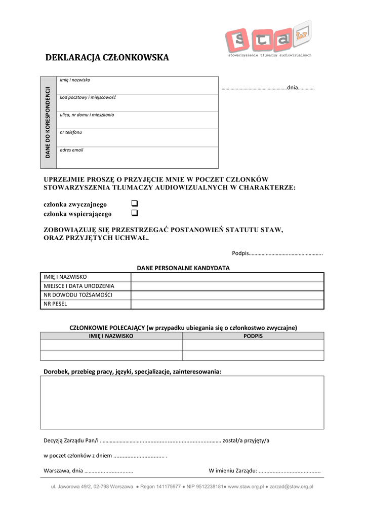 DEKLARACJA CZŁONKOWSKA DANE DO KORESPONDENCJI imię i nazwisko ………….………………………………..dnia….……… kod pocztowy i miejscowość ulica, nr domu i mieszkania nr telefonu adres email UPRZEJMIE PROSZĘ O PRZYJĘCIE MNIE W POCZET CZŁONKÓW STOWARZYSZENIA TŁUMACZY AUDIOWIZUALNYCH W CHARAKTERZE: członka zwyczajnego członka wspierającego ZOBOWIĄZUJĘ SIĘ PRZESTRZEGAĆ POSTANOWIEŃ STATUTU STAW, ORAZ PRZYJĘTYCH UCHWAŁ. Podpis………………………..………………….. DANE PERSONALNE KANDYDATA IMIĘ I NAZWISKO MIEJSCE I DATA URODZENIA NR DOWODU TOŻSAMOŚCI NR PESEL CZŁONKOWIE POLECAJĄCY (w przypadku ubiegania się o członkostwo zwyczajne) IMIĘ I NAZWISKO PODPIS Dorobek, przebieg pracy, języki, specjalizacje, zainteresowania: Decyzją Zarządu Pan/i ………………………...............................................……. został/a przyjęty/a w poczet członków z dniem ................................. . Warszawa, dnia …….......................... W imieniu Zarządu: ........................................ ul. Jaworowa 49/2, 02-798 Warszawa ● Regon 141175977 ● NIP 9512238181● www.staw.org.pl ● [email protected]