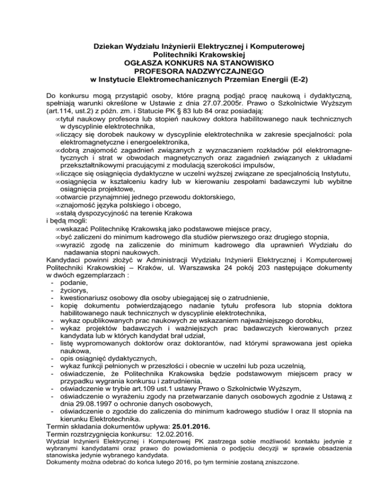 Dziekan Wydziału Inżynierii Elektrycznej i Komputerowej Politechniki Krakowskiej OGŁASZA KONKURS NA STANOWISKO PROFESORA NADZWYCZAJNEGO w Instytucie Elektromechanicznych Przemian Energii (E-2) Do konkursu mogą przystąpić osoby, które pragną podjąć pracę naukową i dydaktyczną, spełniają warunki określone w Ustawie z dnia 27.07.2005r. Prawo o Szkolnictwie Wyższym (art.114, ust.2) z późn. zm. i Statucie PK § 83 lub 84 oraz posiadają: • tytuł naukowy profesora lub stopień naukowy doktora habilitowanego nauk technicznych w dyscyplinie elektrotechnika, • liczący się dorobek naukowy w dyscyplinie elektrotechnika w zakresie specjalności: pola elektromagnetyczne i energoelektronika, • dobrą znajomość zagadnień związanych z wyznaczaniem rozkładów pól elektromagnetycznych i strat w obwodach magnetycznych oraz zagadnień związanych z układami przekształtnikowymi pracującymi z modulacją szerokości impulsów, • liczące się osiągnięcia dydaktyczne w uczelni wyższej związane ze specjalnością Instytutu, • osiągnięcia w kształceniu kadry lub w kierowaniu zespołami badawczymi lub wybitne osiągnięcia projektowe, • otwarcie przynajmniej jednego przewodu doktorskiego, • znajomość języka polskiego i obcego, • stałą dyspozycyjność na terenie Krakowa i będą mogli: • wskazać Politechnikę Krakowską jako podstawowe miejsce pracy, • być zaliczeni do minimum kadrowego dla studiów pierwszego oraz drugiego stopnia, • wyrazić zgodę na zaliczenie do minimum kadrowego dla uprawnień Wydziału do nadawania stopni naukowych. Kandydaci powinni złożyć w Administracji Wydziału Inżynierii Elektrycznej i Komputerowej Politechniki Krakowskiej – Kraków, ul. Warszawska 24 pokój 203 następujące dokumenty w dwóch egzemplarzach : - podanie, - życiorys, - kwestionariusz osobowy dla osoby ubiegającej się o zatrudnienie, - kopię dokumentu potwierdzającego nadanie tytułu profesora lub stopnia doktora habilitowanego nauk technicznych w dyscyplinie elektrotechnika, - wykaz opublikowanych prac naukowych ze wskazaniem najważniejszego dorobku, - wykaz projektów badawczych i ważniejszych prac badawczych kierowanych przez kandydata lub w których kandydat brał udział, - listę wypromowanych doktorów oraz doktorantów, nad którymi sprawowana jest opieka naukowa, - opis osiągnięć dydaktycznych, - wykaz funkcji pełnionych w przeszłości i obecnie w uczelni lub poza uczelnią, - oświadczenie, że Politechnika Krakowska będzie podstawowym miejscem pracy w przypadku wygrania konkursu i zatrudnienia, - oświadczenie w trybie art.109 ust.1 ustawy Prawo o Szkolnictwie Wyższym, - oświadczenie o wyrażeniu zgody na przetwarzanie danych osobowych zgodnie z Ustawą z dnia 29.08.1997 o ochronie danych osobowych, - oświadczenie o zgodzie do zaliczenia do minimum kadrowego studiów I oraz II stopnia na kierunku Elektrotechnika. Termin składania dokumentów upływa: 25.01.2016. Termin rozstrzygnięcia konkursu: 12.02.2016. Wydział Inżynierii Elektrycznej i Komputerowej PK zastrzega sobie możliwość kontaktu jedynie z wybranymi kandydatami oraz prawo do powiadomienia o podjęciu decyzji w sprawie obsadzenia stanowiska jedynie wybranego kandydata. Dokumenty można odebrać do końca lutego 2016, po tym terminie zostaną zniszczone.