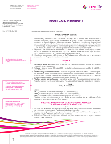 Open Life TU Życie S.A. ul. Przyokopowa 33 01-208 Warszawa infolinia 801 222 333 [email protected] www.openlife.pl REGULAMIN FUNDUSZU Załącznik nr 2 z 2 do Ogólnych Warunków Ubezpieczenia indywidualnego na życie i dożycie z Ubezpieczeniowym Funduszem Kapitałowym (OWU) Kod OWU: UB_OLIJ109 Kod Funduszu „UFK Open Life Depo RT12”: FOLRT012 POSTANOWIENIA OGÓLNE § 1 1. Niniejszy Regulamin Funduszu „UFK Open Life Depo RT12”, (zwany dalej „Regulaminem”) oferowanego przez Towarzystwo Ubezpieczeń w ramach Umowy ubezpieczenia indywidualnego na życie i dożycie z Ubezpieczeniowym Funduszem Kapitałowym (zwanej dalej „Umową ubezpieczenia”) określa zasady funkcjonowania oraz lokowania środków Funduszu, w tym strategię inwestycyjną oraz charakterystykę aktywów wchodzących w skład Funduszu „UFK Open Life Depo RT12”, a także sposób wyceny Udziałów jednostkowych. 2. Regulamin ma zastosowanie do środków pochodzących ze Składek Inwestycyjnych wpłacanych z tytułu Umów ubezpieczenia, zgodnie z którymi środki lokowane są w Fundusz „UFK Open Life Depo RT12”, zgodnie z postanowieniami OWU. 3. Określenia, które zostały zdefiniowane w OWU używane są w Regulaminie w tym samym znaczeniu, o ile Regulamin nie stanowi inaczej. Poniższe definicje stanowią uzupełnienie pojęć zdefiniowanych w OWU. 1. 2. 3. 4. W ten sposób obliczana jest Wartość udziału jednostkowego. Więcej na temat zastosowania wyznaczonej w ten sposób wartości przeczytasz w § 6. Koniecznie zapoznaj się z zamieszczonymi w tym miejscu informacjami o Funduszu oraz jego strategii inwestycyjnej. 1 DEFINICJE § 2 Udziały jednostkowe – jednostki, na które został podzielony Fundusz służące do ustalenia Wartości rachunku udziałów. Ustawa – Ustawa z dnia 22 maja 2003 r. o działalności ubezpieczeniowej (Dz. U. z 2013 r. poz. 950 ze zm.). Wartość aktywów netto Funduszu – wartość wszystkich aktywów Funduszu, ustalana zgodnie z obowiązującymi przepisami prawa, pomniejszona o zobowiązania przewidziane Umową ubezpieczenia oraz inne zobowiązania wynikające z powszechnie obowiązujących przepisów prawa, ustalaną zgodnie z zasadami zawartymi w Regulaminie. Wartość udziału jednostkowego – wartość aktywów netto Funduszu podzielona przez liczbę Udziałów jednostkowych zgromadzonych w Funduszu, obliczana zgodnie z poniższym wzorem: WUJT = WANT LUJT -1 gdzie: WUJT – Wartość udziału jednostkowego na Dzień wyceny (T), WANT – Wartość aktywów netto Funduszu na Dzień wyceny (T), LUJT-1 – liczba wszystkich Udziałów jednostkowych na dzień T-1. Wartość udziału jednostkowego na dany Dzień wyceny ustalana jest w najbliższym Dniu roboczym następującym po tym Dniu wyceny. STRATEGIA INWESTYCYJNA, CHARAKTERYSTYKA AKTYWÓW WCHODZĄCYCH W SKŁAD FUNDUSZU § 3 1. Fundusz jest wydzieloną rachunkowo częścią aktywów Towarzystwa Ubezpieczeń, składającą się z Udziałów jednostkowych Funduszu o jednakowej wartości. 2. Fundusz powstaje z alokowanych przez Towarzystwo Ubezpieczeń Składek Inwestycyjnych poprzez nabycie Udziałów jednostkowych Funduszu. 3. Celem Funduszu jest powiększanie Wartości aktywów netto Funduszu w wyniku wzrostu wartości lokat Funduszu. Open Life Towarzystwo Ubezpieczeń Życie Spółka Akcyjna z siedzibą w Warszawie przy ul. Przyokopowej 33, 01-208 Warszawa, zarejestrowana w Sądzie Rejonowym dla m.st. Warszawy, XII Wydział Gospodarczy Krajowego Rejestru Sądowego pod numerem KRS 0000292551, posiadająca numer REGON 141186640 i numer NIP 107-00-08-220, kapitał zakładowy zarejestrowany i w całości wpłacony wynosi 95 500 000 zł. Open Life TU Życie S.A. ul. Przyokopowa 33 01-208 Warszawa infolinia 801 222 333 [email protected] www.openlife.pl 4. W szczególności celem Funduszu jest ochrona 100% Składki Inwestycyjnej na koniec Okresu ubezpieczenia. Cel Funduszu, o którym mowa w zdaniu poprzednim, realizowany jest poprzez zawarcie przez Towarzystwo Ubezpieczeń umów depozytów terminowych, o których mowa w ust. 5, z zastrzeżeniem ryzyka kredytowego, o którym mowa w § 5 ust. 1 pkt 1. Na początku Okresu ubezpieczenia Towarzystwo Ubezpieczeń zawiera umowę depozytu terminowego z Getin Noble Bank Spółka Akcyjna. 5. Środki Funduszu są lokowane w depozyty terminowe oraz środki pieniężne. Towarzystwo Ubezpieczeń w Dacie początku ubezpieczenia dokona podziału środków Funduszu zgodnie z poniższą strukturą aktywów, mając na uwadze osiągnięcie celu Funduszu, o którym mowa w ust. 3 - 4: 6. 7. 8. 9. Minimalny udział w Funduszu Maksymalny udział w Funduszu Depozyty terminowe 0% 100% Środki pieniężne 0% 100% przy czym łączna wartość środków Funduszu alokowanych we wskazane w tabeli instrumenty finansowe stanowi 100% aktywów Funduszu, z zastrzeżeniem ust. 6. Środki pieniężne mogą stanowić do 100% środków Funduszu wyłącznie w pierwszych dniach Okresu ubezpieczenia i w ostatnich dniach Okresu ubezpieczenia oraz w związku z realizacją postanowień ust. 8, do daty rozliczenia zawartych transakcji. Instrumenty finansowe, o których mowa w ust. 5, wyceniane są w złotych polskich. W przypadku realizacji ryzyka kredytowego Getin Noble Bank Spółka Akcyjna, o którym mowa w § 5 ust. 1 pkt 1 środki Funduszu będą lokowane w depozyty terminowe w innym banku krajowym lub zagranicznym lub instytucji kredytowej, z którym/ z którą Towarzystwo Ubezpieczeń zawrze umowę depozytu terminowego. Aktualne dane banku krajowego lub zagranicznego lub instytucji kredytowej, z którym/ z którą Towarzystwo Ubezpieczeń zawarło umowę depozytu terminowego, Towarzystwo Ubezpieczeń zamieszcza na stronie internetowej. W razie takiej potrzeby informacje te można uzyskać od Towarzystwa Ubezpieczeń na pisemny wniosek. W przypadku, o którym mowa w ust. 8, ustalenie Wartości udziału jednostkowego Funduszu następuje w oparciu o Wartość aktywów netto Funduszu stanowiącą równowartość k