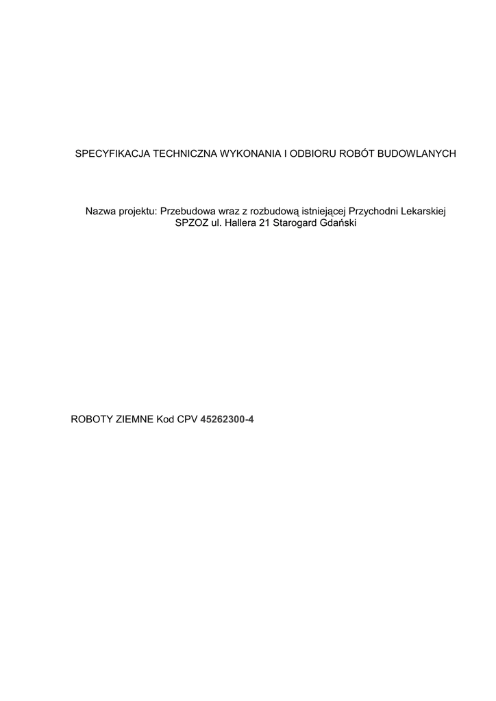 SPECYFIKACJA TECHNICZNA WYKONANIA I ODBIORU ROBÓT BUDOWLANYCH Nazwa projektu: Przebudowa wraz z rozbudową istniejącej Przychodni Lekarskiej SPZOZ ul. Hallera 21 Starogard Gdański ROBOTY ZIEMNE Kod CPV 45262300-4 1. PRZEDMIOT I ZAKRES STOSOWANIA SPECYFIKACJI 1.1. Przedmiot specyfikacji i zakres stosowania Przedmiotem niniejszej Szczegółowej Specyfikacji Technicznej (SST) są wymagania dotyczące realizacji robót betonowych przewidzianych do wykonania w ramach robót PRZEBUDOWA WRAZ Z ROZBUDOWĄ ISTNIEJĄCEJ PRZYCHODNI LEKARSKIEJ SPZOZ Przychodnia Lekarska Ul. Hallera 21 Starogard Gdański 1.2.Zakres stosowania specyfikacji. Niniejsza specyfikacja będzie stosowana jako dokument przetargowy i kontraktowy przy zlecaniu i realizacji robót wymienionych w punkcie 1.1. Ustalenia zawarte w niniejszej specyfikacji obejmują wszystkie czynności umoŜliwiające i mające na celu wykonanie wszystkich robót betonowych przewidzianych w projekcie budowlanym. Obejmują prace związane z dostawą materiałów, wykonawstwem i wykończeniem robót betonowych, wykonywanych na miejscu. Roboty betonowe obejmują konstrukcyjne betony zbrojone i nie zbrojone, betony fundamentowe i podbudowy. 1.3. Zakres robót objętych specyfikacją W ramach prac budowlanych przewiduje się wykonanie następujących robót betonowych: - ławy fundamentowe zbrojone - schody betonowe zew. zbrojone - betonowe warstwy wyrównawcze , - Słupy - podkład betonowy na podłoŜu gruntowym - stropy i podciągi - wszystkie inne nie wymienione wyŜej roboty betonowe jakie występują przy realizacji umowy. Rozwiązania techniczne stanowiące podstawę do wykonania tych robót są przedstawione na rysunkach technicznych oraz w opisie technicznym w projekcie budowlanym. 1.4. Określenia podstawowe Określenia podstawowe uŜyte w niniejszej SST są zgodne z obowiązującymi Polskimi Normami i Ogólną Specyfikacją Techniczną p. 1.5. 1.5. Ogólne wymagania dotyczące robót Ogólne wymagania dotyczące zasad prowadzenia robót podano w Ogólnej Specyfikacji Technicznej p.2. Niniejsza specyfikacja obejmuje całość robót związanych z wykonywaniem elementów betonowych i Ŝelbetowych: szalowanie, zbrojenie, przygotowanie i układanie mieszanki betonowej oraz wszystkie roboty pomocnicze. Wykonawca jest odpowiedzialny za jakość wykonania tych robót oraz ich zgodność z umową, projektem wykonawczym, pozostałymi SST i poleceniami zarządzającego realizacją umowy. Wprowadzanie jakichkolwiek odstępstw od tych dokumentów wymaga akceptacji zarządzającego realizacją umowy. 1.6. Dokumentacja, którą naleŜy przedstawić w trakcie budowy Dokumentacja przedstawiana przez Wykonawcę w trakcie budowy musi być zgodna z zasadami podanymi w Ogólnej Specyfikacji Technicznej Dodatkowo w razie potrzeby Wykonawca dostarczać następujące dokumenty: 1. Harmonogram i kolejność prac betonowych. 2. Rysunki robocze wymagane przez zarządzającego realizacją umowy. 3. Skład mieszanki betonowej i granulację kruszywa. 4. Świadectwa jakości przedstawione przez producenta wyszczególnione w dalszej części opracowania. 5. Zalecenia i instrukcje dostarczane przez producentów, wyszczególnione w dalszej części opracowania. 2. MATERIAŁY 2.1. Ogólne wymagania dotyczące materiałów Ogólne wymagania dotyczące materiałów i ich rodzaju podano w Ogólnej Specyfikacji Technicznej p.4. 2.2 Szalowanie 2.2.1 Drewno do wyrobu szalunków: deski i sklejki uŜywane przy deskowaniu oraz pozostałe materiały do budowy szalunków 2.2.2 Płyty deskowania: 1. Sklejka – patrz WTWO, rozdział 5. 2 Łączenie deskowań: złącza usuwalne lub na zatrzaskach metalowych o stałej lub zmiennej długości, nie posiadające elementów pozostawiających w powierzchni betonu otworów o średnicy większej niŜ 25 mm. 2.2.3 Środek anty-przyczepny: aktywne chemicznie środki zawierające składniki wchodzące w reakcję z wolnym wapnem znajdującym się w betonie, powodujące wytwarzanie się nierozpuszczalnych w wodzie substancji, zapobiegających przywieraniu betonu do deskowania. 2.2.4 Środek uŜywany przy demontaŜu deskowań: bezbarwny olej mineralny, nie zawierający kerosenu, o lepkości od 100 do 110 s (w uniwersalnej skali Saybolta) w temp. 40ºC, oraz temperaturze zapłonu wyŜszej od 150ºC, w otwartych pojemnikach. 2.3 Zbrojenie 2.3.1. śebrowana stal zbrojeniowa Zbrojenie główne naleŜy wykonać z Ŝebrowanych prętów zbrojeniowych ze stali podanej przez projektanta w dokumentacji projektowej. Musi ona spełniać wymagania norm PN-82/H-93215, PN-84/B-03264. 2.3.2 Elektrody spawalnicze Elektrody spawalnicze powinny spełniać warunki normy PN-84/B-03264. 2.3.3. Materiały pomocnicze Drut do wiązania prętów musi być typu czarnego, o średnicy 1,6mm miękki. Klocki dystansowe pod zbrojenie muszą odpowiadać celom jakim mają słuŜyć. 2.4 Składniki mieszanki betonowej 2.4.1. Cement Do stosowania dopuszczone są tylko cementy podane poniŜej. Nie wolno stosować Ŝadnych materiałów zamiennych. 1. Cement portlandzki, marki 25 i 35 zgodnie z normą PN-88/B-30000. 2.4.2 Woda Czysta woda, nie zawierająca oleju, kwasu, zasad, związków organicznych i innych substancji zabronionych w normie PN-88/B-32250. 2.4.3 Kruszywo ZałoŜenia ogólne: Kruszywo naturalne, wolne od zanieczyszczeń . Kruszywo nie powinno wchodzić w reakcje chemiczne. Zawartość siarczanów powinna być mniejsza od 1%. Kruszywo drobnoziarniste (0 - 2 mm): Frakcje o uziarnieniu mniejszym niŜ 0,063 mm nie powinny przekraczać 4%. NaleŜy uŜywać tylko czystego, naturalnego piasku o ostrych krawędziach. Kruszywo grube (2 - 96 mm): NaleŜy uŜywać Ŝwiru naturalnego, mieszanki Ŝwiru i łamanego Ŝwiru, łamanych kamieni lub mieszanki tych materiałów, zawierającej nie więcej niŜ 15% płaskich bądź wydłuŜonych ziaren (długość 5 razy większa od szerokości) . Frakcje o uziarnieniu mniejszym niŜ 0,063 mm nie powinny przekraczać 2%. Mrozoodporność kruszy