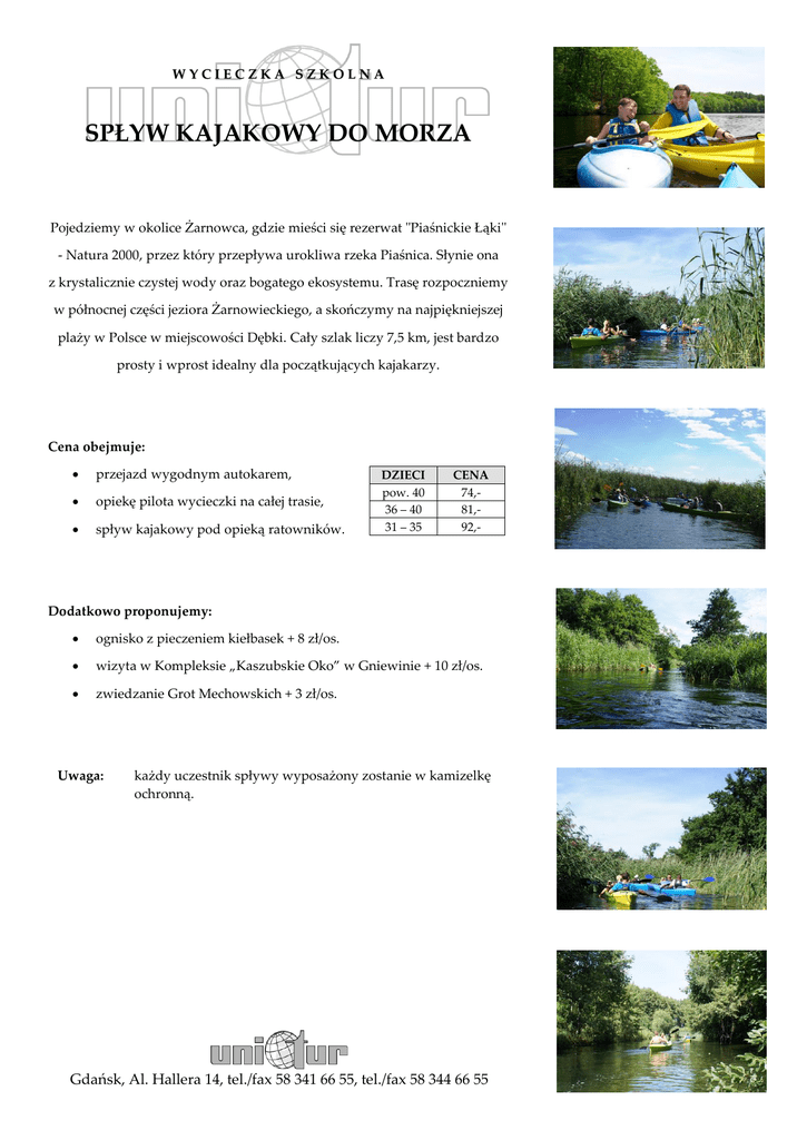 WYCIECZKA SZKOLNA SPŁYW KAJAKOWY DO MORZA Pojedziemy w okolice Żarnowca, gdzie mieści się rezerwat "Piaśnickie Łąki" - Natura 2000, przez który przepływa urokliwa rzeka Piaśnica. Słynie ona z krystalicznie czystej wody oraz bogatego ekosystemu. Trasę rozpoczniemy w północnej części jeziora Żarnowieckiego, a skończymy na najpiękniejszej plaży w Polsce w miejscowości Dębki. Cały szlak liczy 7,5 km, jest bardzo prosty i wprost idealny dla początkujących kajakarzy. Cena obejmuje: przejazd wygodnym autokarem, opiekę pilota wycieczki na całej trasie, spływ kajakowy pod opieką ratowników. DZIECI pow. 40 36 – 40 31 – 35 CENA 74,81,92,- Dodatkowo proponujemy: ognisko z pieczeniem kiełbasek + 8 zł/os. wizyta w Kompleksie „Kaszubskie Oko” w Gniewinie + 10 zł/os. zwiedzanie Grot Mechowskich + 3 zł/os. Uwaga: każdy uczestnik spływy wyposażony zostanie w kamizelkę ochronną. Gdańsk, Al. Hallera 14, tel./fax 58 341 66 55, tel./fax 58 344 66 55