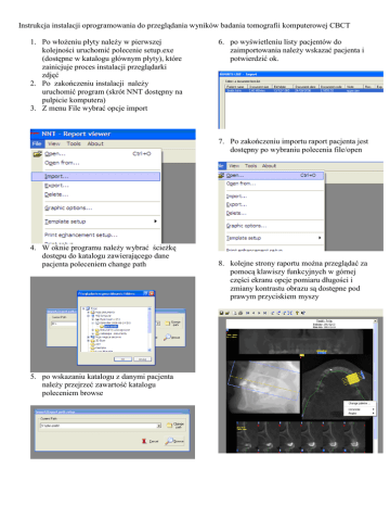 Instrukcja instalacji oprogramowania do przeglądania wyników badania tomografii komputerowej CBCT 1. Po włoŜeniu płyty naleŜy w pierwszej kolejności uruchomić polecenie setup.exe (dostępne w katalogu głównym płyty), które zainicjuje proces instalacji przeglądarki zdjęć 2. Po zakończeniu instalacji naleŜy uruchomić program (skrót NNT dostępny na pulpicie komputera) 3. Z menu File wybrać opcje import 6. po wyświetleniu listy pacjentów do zaimportowania naleŜy wskazać pacjenta i potwierdzić ok. 7. Po zakończeniu importu raport pacjenta jest dostępny po wybraniu polecenia file/open 4. W oknie programu naleŜy wybrać ścieŜkę dostępu do katalogu zawierającego dane pacjenta poleceniem change path 5. po wskazaniu katalogu z danymi pacjenta naleŜy przejrzeć zawartość katalogu poleceniem browse 8. kolejne strony raportu moŜna przeglądać za pomocą klawiszy funkcyjnych w górnej części ekranu opcje pomiaru długości i zmiany kontrastu obrazu są dostępne pod prawym przyciskiem myszy