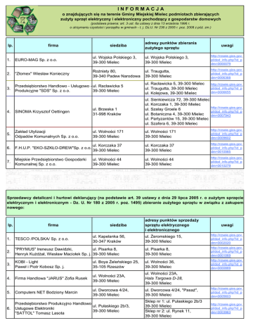 INFORMACJA INFORMACJA o znajdujących się na terenie Gminy Miejskiej Mielec podmiotach zbierających o znajdujących się na terenie Gminy Miejskiej Mielec podmiotach zbierających zużyty sprzęt elektryczny i elektroniczny pochodzący z gospodarstw domowych zużyty sprzęt elektryczny i elektroniczny pochodzący z gospodarstw domowych (podstawa prawna: art. 3 ust. 6a ustawy z dnia 13 września 1996 r. 3 ust. 6a ustawy z- dnia 13 września o (podstawa utrzymaniu prawna: czystości art. i porządku w gminach t. j. Dz.U. Nr 236 z1996 2005r.r. poz. 2008 z póź. zm.) o utrzymaniu czystości i porządku w gminach - t. j. Dz.U. Nr 236 z 2005 r. poz. 2008 z póź. zm.) lp. firma siedziba adresy punktów zbierania zużytego sprzętu uwagi 1. EURO-MAG Sp. z o.o. ul. Wojska Polskiego 3, 39-300 Mielec ul. Wojska Polskiego 3, 39-300 Mielec http://rzseie.gios.gov. pl/dod_info.php?id_p dm=0000079 2. "Złomex" Wiesław Konieczny Rożniaty 80, 39-340 Padew Narodowa ul. Traugutta, 39-300 Mielec http://rzseie.gios.gov. pl/dod_info.php?id_p dm=0006368 3. Przedsiębiorstwo Handlowo - Usługowo - ul. Racławicka 5 Produkcyjne "SDS" Sp. z o.o. 39-300 Mielec ul. Racławicka 5, 39-300 Mielec ul. Traugutta, 39-300 Mielec ul. Kolejowa, 39-300 Mielec http://rzseie.gios.gov. pl/dod_info.php?id_p dm=0006655 4. SINOMA Krzysztof Oettingen ul. Brzeska 1 31-998 Kraków ul. Sienkiewicza 72, 39-300 Mielec ul. Korczaka 1, 39-300 Mielec http://rzseie.gios.gov. ul. Szalay Groele 6 pl/dod_info.php?id_p ul. Botaniczna 4, 39-300 Mielec dm=0007943 ul. Partyzantów 15, 39-300 Mielec ul. Szafera 6, 39-300 Mielec 5. Zakład Utylizacji Odpadów Komunalnych Sp. z o.o. ul. Wolności 171 39-300 Mielec ul. Wolności 171 39-300 Mielec http://rzseie.gios.gov. pl/dod_info.php?id_p dm=0009602 6. F.H.U.P. "EKO-SZKŁO-DREW"Sp. z o.o. ul. Korczaka 37 39-300 Mielec ul. Korczaka 37 39-300 Mielec http://rzseie.gios.gov. pl/dod_info.php?id_p dm=0010565 7. Miejskie Przedsiębiorstwo Gospodarki Komunalnej Sp. z o.o. ul. Wolności 44 39-300 Mielec ul. Wolności 44 39-300 Mielec http://rzseie.gios.gov. pl/dod_info.php?id_p dm=0010279 Sprzedawcy detaliczni i hurtowi deklarujący (na podstawie art. 39 ustawy z dnia 29 lipca 2005 r. o zużytym sprzęcie elektrycznym i elektronicznym - Dz. U. Nr 180 z 2005 r. poz. 1495) zbieranie zużytego sprzętu w związku z zakupem nowego: lp. firma siedziba adresy punktów sprzedaży sprzętu elektrycznego i elektronicznego uwagi ul. Żeromskiego 15, 39-300 Mielec http://rzseie.gios.gov. pl/dod_info.php?id_p dm=0002020 "PRYMUS" Ireneusz Dawidzki, ul. Pisarka 8, Henryk Kużdżał, Wiesław Maciołek Sp. j. 39-300 Mielec ul. Pisarka 8, 39-300 Mielec http://rzseie.gios.gov. pl/dod_info.php?id_p dm=0001069 3. KOBI - Light Paweł i Piotr Kobosz Sp. j. ul. Boya Żeleńskiego 25, 35-105 Rzeszów ul. Wolności 36, 39-300 Mielec http://rzseie.gios.gov. pl/dod_info.php?id_p dm=0000869 4. Firma Handlowa "JARUS" Zofia Rusek ul. Wolności 23A, 39-300 Mielec ul. Wolności 23A, Hala Targowa D-28, 39-300 Mielec 5. Computers NET Bodziony Marcin ul. Dworcowa 4/24, 39-300 Mielec ul. Dworcowa 4/24, "Pasaż", 39-300 Mielec http://rzseie.gios.gov. pl/dod_info.php?id_p dm=0005603 6. Przedsiębiorstwo Produkcyjno Handlowo ul. Pułaskiego 2b/3, Usługowe Elektroniki 39-300 Mielec "SATTOL" Tomasz Lasota Sklep nr 1: ul. Pułaskiego 2b/3 39-300 Mielec Sklep nr 2: ul. Rynek 11, 39-300 Mielec http://rzseie.gios.gov. pl/dod_info.php?id_p dm=0003963 1. TESCO /POLSKA/ Sp. z o.o. 2. ul. Kapelanka 56, 30-347 Kraków 7. ANNEKS Handel - Produkcja Kulpa Mariusz ul. Drzewieckiego 3/48, 39-300 Mielec ul. Dworcowa 4/49A, 39-300 Mielec 8. Przedsiębiorstwo Zaopatrzeniowe MORS Sp. z o. o. Sieć Hurtowni Elektrotechnicznych ul. Hutnicza 35, 81-038 Gdynia Hurtownia: ul. Piaskowa 9, 39-300 Mielec http://rzseie.gios.gov. pl/dod_info.php?id_p dm=0001089 9. GSMSCOM Krzysztof Kukiełka ul. Mickiewicza 31, 39-300 Mielec ul. Mickiewicza 31, 39-300 Mielec http://rzseie.gios.gov. pl/dod_info.php?id_p dm=0006186 ul. Rzochowska 44, 39-300 Mielec ul. Wolności 32, 39-300 Mielec http://rzseie.gios.gov. pl/dod_info.php?id_p dm=0008674 11. StudioGSM.pl Krystian Zarzecki ul. Legionów 12, 39-300 Mielec ul. Legionów 8, 39-300 Mielec ul. Legionów 12, 39-300 Mielec ul. Rynek 24, 39-300 Mielec al. Niepodległości 14, 39-300 Mielec http://rzseie.gios.gov. pl/dod_info.php?id_p dm=0004397 12. Telekomunikacja Polska S.A. ul. Twarda 18, 00-105 Warszawa Telepunkt: al. Niepodległości 9, 39-300 Mielec http://rzseie.gios.gov. pl/dod_info.php?id_p dm=0001615 http://rzseie.gios.gov. pl/dod_info.php?id_p dm=0005563 10. Arrcom Rafał Romanowski 13. Firma Handlowo-Usługowa "Merkury" Sp. z o.o. ul. Czajkowskiego 51, 38-400 Krosno ul. Wolności 44B, 39-300 Mielec 14. P. U. H. WIKAMA Sp. j. Andrzej Świerk & Wiesław Wiącek ul. Przemysłowa 10, 39-300 Mielec ul. Wolności 1, 39-300 Mielec ul. Gabrieli Zapolskiej 38, 30-126 Kraków Sklep Albert 3511, ul. Pisarka, 39-300 Mielec http://rzseie.gios.gov. pl/dod_info.php?id_p dm=0006471 15. Ahold Polska Sp. z o.o. 16. BASCO 2 Andrzej Nawrot i Wspólnicy Sp. j. ul. Piaskowa 7, 39-300 Mielec ul. Piaskowa 7, 39-300 Mielec http://rzseie.gios.gov. pl/dod_info.php?id_p dm=0006011 17. Firma Produkcyjno - Usługowo Handlowa CzaJen 39-305 Borowa 224 ul. 3-go Maja 12, 39-300 Mielec http://rzseie.gios.gov. pl/dod_info.php?id_p dm=0006176 Apteka Prywatna "REMEDIUM" 18. mgr farm. Krystyna Łoś mgr farm. Anna Szklarska Sp. j. ul. Chałubińskiego 6, 39-300 Mielec ul. Chałubińskiego 6, 39-300 Mielec http://rzseie.gios.gov. pl/dod_info.php?id_p dm=0000636 Firma BATMAX 19. Batkowski Piotr ul. Kolejowa 8B, 39-300 Mielec ul. Kolejowa 8B, 39-300 Mielec ul. Piaskowa 9, 39-300 Mielec http://rzseie.gios.gov. pl/dod_info.php?id_p dm=0007035 ul. Pułaskiego 2b/4, 39-300 Mielec ul. Pułaskiego 2b/4, 39-300 Mielec http://rzseie.gios.gov. pl/dod_info.php?id_p dm=0007113 21. EKO-MASA Sp. z o.o. ul. Piaskowa 9, 39-300 Mielec ul. Piaskowa 9, 39-300 Mielec http://rzseie.g