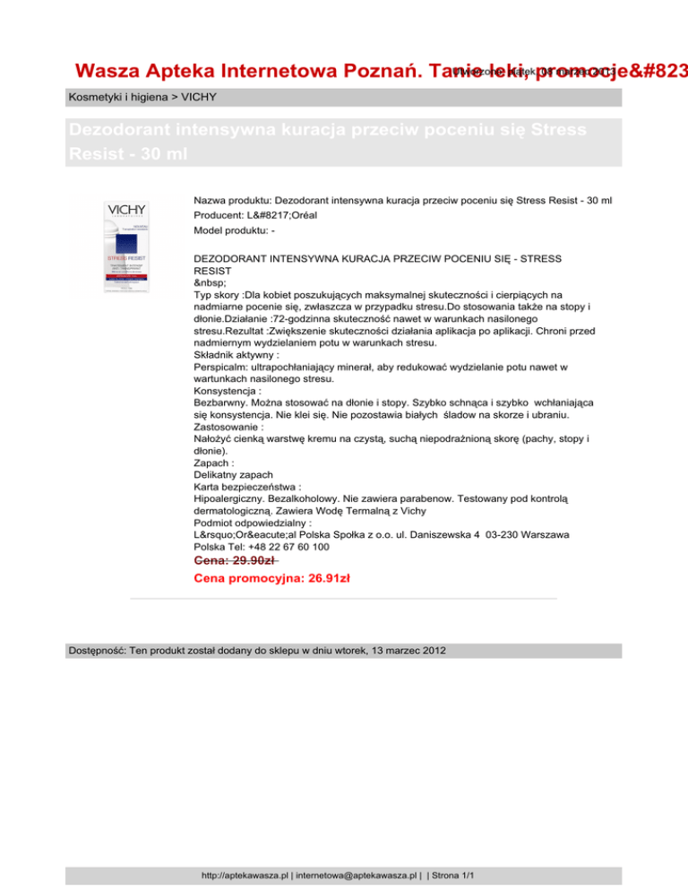 Utworzono: piątek,promocje̷ 08 marzec 2013 Wasza Apteka Internetowa Poznań. Tanie leki, Kosmetyki i higiena > VICHY Dezodorant intensywna kuracja przeciw poceniu się Stress Resist - 30 ml Nazwa produktu: Dezodorant intensywna kuracja przeciw poceniu się Stress Resist - 30 ml Producent: L’Oréal Model produktu: DEZODORANT INTENSYWNA KURACJA PRZECIW POCENIU SIĘ - STRESS RESIST Typ skory :Dla kobiet poszukujących maksymalnej skuteczności i cierpiących na nadmiarne pocenie się, zwłaszcza w przypadku stresu.Do stosowania także na stopy i dłonie.Działanie :72-godzinna skuteczność nawet w warunkach nasilonego stresu.Rezultat :Zwiększenie skuteczności działania aplikacja po aplikacji. Chroni przed nadmiernym wydzielaniem potu w warunkach stresu. Składnik aktywny : Perspicalm: ultrapochłaniający minerał, aby redukować wydzielanie potu nawet w wartunkach nasilonego stresu. Konsystencja : Bezbarwny. Można stosować na dłonie i stopy. Szybko schnąca i szybko wchłaniająca się konsystencja. Nie klei się. Nie pozostawia białych śladow na skorze i ubraniu. Zastosowanie : Nałożyć cienką warstwę kremu na czystą, suchą niepodrażnioną skorę (pachy, stopy i dłonie). Zapach : Delikatny zapach Karta bezpieczeństwa : Hipoalergiczny. Bezalkoholowy. Nie zawiera parabenow. Testowany pod kontrolą dermatologiczną. Zawiera Wodę Termalną z Vichy Podmiot odpowiedzialny : L’Oréal Polska Społka z o.o. ul. Daniszewska 4 03-230 Warszawa Polska Tel: +48 22 67 60 100 Cena: 29.90zł Cena promocyjna: 26.91zł Dostępność: Ten produkt został dodany do sklepu w dniu wtorek, 13 marzec 2012 http://aptekawasza.pl | [email protected] | | Strona 1/1