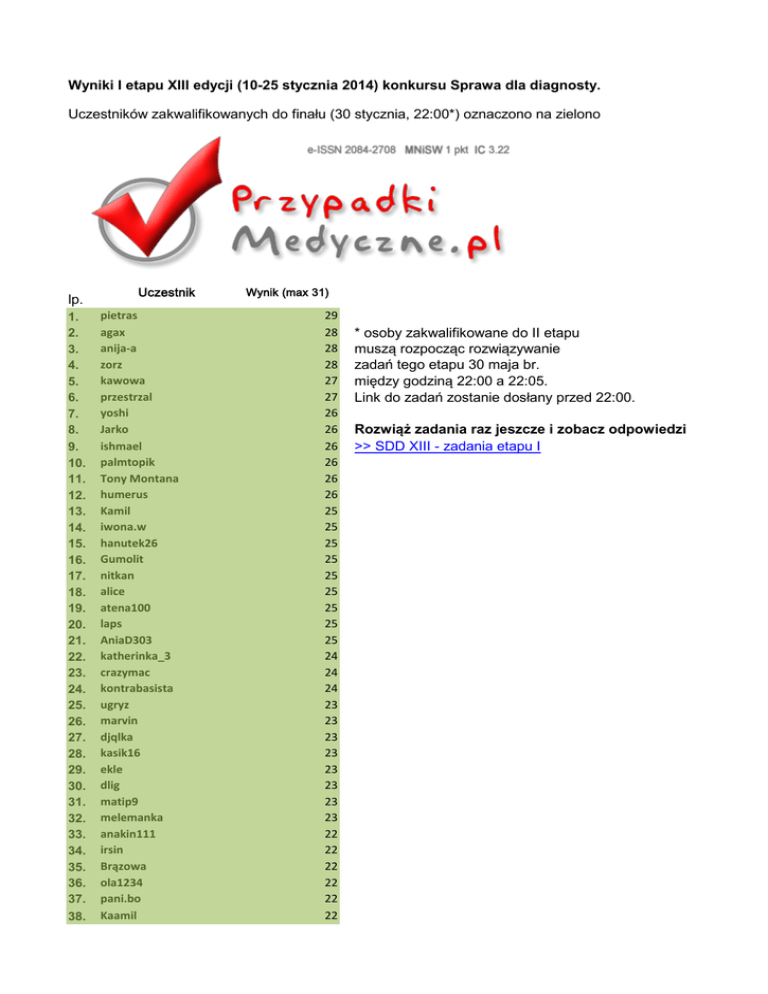 Wyniki I etapu XIII edycji (10-25 stycznia 2014) konkursu Sprawa dla diagnosty. Uczestników zakwalifikowanych do finału (30 stycznia, 22:00*) oznaczono na zielono lp. 1. 2. 3. 4. 5. 6. 7. 8. 9. 10. 11. 12. 13. 14. 15. 16. 17. 18. 19. 20. 21. 22. 23. 24. 25. 26. 27. 28. 29. 30. 31. 32. 33. 34. 35. 36. 37. 38. Uczestnik pietras agax anija-a zorz kawowa przestrzal yoshi Jarko ishmael palmtopik Tony Montana humerus Kamil iwona.w hanutek26 Gumolit nitkan alice atena100 laps AniaD303 katherinka_3 crazymac kontrabasista ugryz marvin djqlka kasik16 ekle dlig matip9 melemanka anakin111 irsin Brązowa ola1234 pani.bo Kaamil Wynik (max 31) 29 28 28 28 27 27 26 26 26 26 26 26 25 25 25 25 25 25 25 25 25 24 24 24 23 23 23 23 23 23 23 23 22 22 22 22 22 22 * osoby zakwalifikowane do II etapu muszą rozpocząc rozwiązywanie zadań tego etapu 30 maja br. między godziną 22:00 a 22:05. Link do zadań zostanie dosłany przed 22:00. Rozwiąż zadania raz jeszcze i zobacz odpowiedzi >> SDD XIII - zadania etapu I 39. 40. 41. 42. 43. 44. 45. 46. 47. 48. 49. 50. 51. 52. 53. 54. 55. 56. 57. 58. 59. 60. 61. 62. 63. 64. 65. 66. 67. 68. 69. 70. 71. 72. 73. 74. 75. 76. 77. 78. 79. 80. 81. 82. 83. 84. 85. 86. 87. 88. 89. 90. 91. pawelzwpn pocahontas87 katarinka milkchocolate guska27 Natalia900 monia_ania Gerberos monifly Filip cypuś gusia0311 krysiawin Tinkerbell ingson paulinek7 doitsu Gandalf trix michalarysz kml tucha olka_strepto surrealistyczny_zubr gryzon Staphylococcus BartekPL saMarta maciejk folusiaczek mala89 wlodar333 Corazon mikamat Vagabond kobalamina seledynka abcde niebieski yanina pasta07 adamdanielD potas00 maggie_zet owca89 johnson higerush nemo12 catty hagnos justyna.k TOM_18 MatkaDyrektorka 22 22 21 21 21 21 21 21 21 21 21 21 21 21 21 21 21 21 20 20 20 20 20 20 20 20 20 20 20 20 20 20 20 20 20 20 20 20 20 19 19 19 19 19 19 19 19 19 19 19 19 19 19 Asik Einne aniatomka kalafior Adka topaz klaudusia_hey student adak hinimo monamm NervusVagusX clavicula-i karla gaga88 czupakabra smerfetka sothisguy aligatorka lukasgo agus07 mayaku ma_k signet Ewka margot999 118. misiek121319 119. heartattack 120. mducek 121. Dobek 122. hopfstosser 123. Bart 124. 1991pgm 125. roxygdy88 126. tommarek92 127. Chinaski 128. wojtala 129. MisiuWielki 130. czarownica87 131. moscati 132. Ag22 133. agan7 134. Magda 135. drM 136. agnieszka.m 137. meryc 138. kabaka 139. london 140. cajamarca 141. sochapawel97 142. greenrzekotka 143. samba 144. spoxkler 92. 93. 94. 95. 96. 97. 98. 99. 100. 101. 102. 103. 104. 105. 106. 107. 108. 109. 110. 111. 112. 113. 114. 115. 116. 117. 19 19 19 19 19 18 18 18 18 18 18 18 18 18 18 18 18 18 18 18 18 17 17 17 17 17 17 17 17 17 17 17 17 17 17 17 17 17 17 17 17 17 17 17 17 17 17 17 16 16 16 16 16 145. 146. 147. 148. 149. 150. 151. 152. 153. 154. 155. 156. 157. 158. 159. 160. 161. 162. 163. 164. 165. 166. 167. 168. 169. 170. 171. 172. 173. 174. 175. 176. 177. 178. 179. 180. 181. 182. 183. 184. 185. 186. 187. 188. 189. 190. 191. 192. 193. 194. 195. 196. 197. goslawa dajana91 lukaszf kasiula aleksandraZST Moniq madzia0630 gatomg Mateusz Malik Matrix potwur buglady oksah natrudia madziulkaw2 madziab54 insomniaa mr89 butterflyblue tomiv018 BiliBee rybka7 dr.ruta fieryscissors magooo cnam rach666_1990 Rudy kredens00 nalepka7 Elunia doktorek89 Asia_Olkowicz ac89 pielęgniarz anian gziel AnnaS student21 Turron justynazzzz Agouti matkotek LeoVoussen whiterose goller grabosia102 piesek22 michasz drTasza Barni soloo odlej 16 16 16 16 16 16 16 16 16 16 16 16 16 16 16 16 16 16 16 16 15 15 15 15 15 15 15 15 15 15 15 15 15 15 15 15 15 15 15 15 15 15 14 14 14 14 14 14 14 14 14 14 14 198. 199. 200. 201. 202. 203. 204. 205. 206. 207. 208. 209. 210. 211. 212. 213. 214. 215. 216. 217. 218. 219. 220. 221. 222. 223. 224. 225. 226. 227. 228. 229. 230. 231. 232. 233. 234. 235. 236. 237. 238. 239. 240. 241. 242. 243. 244. 245. 246. 247. 248. 249. 250. MedykAgnes mkujawa1989 aneta469 vaveraczka wtorcia5 Sza forte kasia_slimaczek Filkiss Agatish poklewski76 Madziolek marys_90 olusia1600 charliehavranek DamianR Kosik vilemmo_87 R1k raissa bloom_89 ceglus milkowicz HannaG. lambada1 looczus Trokar esdo madllene00 sorry_gregory ewagi1 siulas joannaange netia powlokaK BOGO wolny aga10b annawitkowska Patryk R Skretek borealis mimikra99 kkasiurekk Nuclear1991 thermopoliska nazwauzytkownika libertador Anula91 MartwyPapiez spr Agness huba_buba 14 14 14 14 14 14 14 14 14 14 13 13 13 13 13 13 13 13 13 13 13 13 13 13 13 13 12 12 12 12 12 12 12 12 12 12 12 12 12 12 11 11 11 11 11 11 11 11 11 11 11 11 11 251. 252. 253. 254. 255. 256. 257. 258. 259. 260. 261. 262. 263. 264. 265. 266. 267. 268. 269. 270. 271. 272. 273. 274. 275. 276. 277. 278. 279. 280. 281. 282. 283. 284. 285. 286. 287. 288. 289. 290. 291. 292. 293. 294. 295. 296. 297. 298. 299. 300. 301. 302. 303. emilia.c janco lekinspe czupurr krupsko no-vanitas olekbb Elbo1 gucio926 monia12311 pitolihno Hypokrates Fibula elola xxxniktxxx cathrinax Vitto FLICKA cellistka magdalenaaaaa goHa polana ewa76 studentka2015 potfur afds foreverever marianek Ivona_16 bziuta sasanka55 8stokrotka8 piotrk_88 levis Malcia czarek1201 majeczka04 marcelka Merenwen olkadown liczi999 renatajar marysia sz weronika16 ula.micinska voytek18 sokokiti wtorek5 Dominika_s Szymeq bibegla nata w anaretka18 11 11 11 11 10 10 10 10 10 10 10 10 10 10 10 10 10 10 10 9 9 9 9 9 9 8 8 8 8 8 8 8 8 8 8 8 7 7 7 7 7 7 7 6 6 6 6 6 6 6 6 5 5 304. Diaphragma 305. MsNinja 4 4