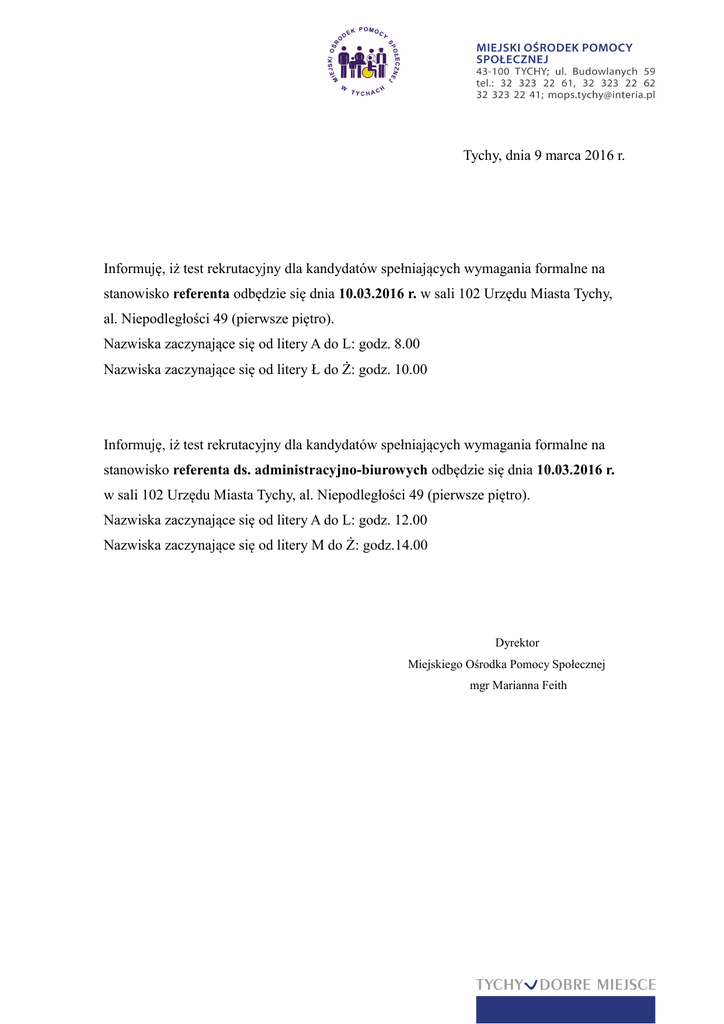 Tychy, dnia 9 marca 2016 r. Informuję, iż test rekrutacyjny dla kandydatów spełniających wymagania formalne na stanowisko referenta odbędzie się dnia 10.03.2016 r. w sali 102 Urzędu Miasta Tychy, al. Niepodległości 49 (pierwsze piętro). Nazwiska zaczynające się od litery A do L: godz. 8.00 Nazwiska zaczynające się od litery Ł do Ż: godz. 10.00 Informuję, iż test rekrutacyjny dla kandydatów spełniających wymagania formalne na stanowisko referenta ds. administracyjno-biurowych odbędzie się dnia 10.03.2016 r. w sali 102 Urzędu Miasta Tychy, al. Niepodległości 49 (pierwsze piętro). Nazwiska zaczynające się od litery A do L: godz. 12.00 Nazwiska zaczynające się od litery M do Ż: godz.14.00 Dyrektor Miejskiego Ośrodka Pomocy Społecznej mgr Marianna Feith