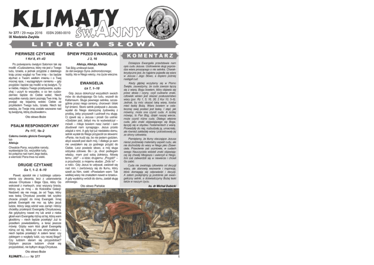 Nr 377 / 29 maja 2016 IX Niedziela Zwykła ISSN 2080-0010 L I T U R G I A S Ł O W A PIERWSZE CZYTANIE ŚPIEW PRZED EWANGELIĄ 1 Krl 8, 41–43 J 3, 16 Po poświęceniu świątyni Salomon tak się modlił: «Cudzoziemca, który nie jest z Twego ludu, Izraela, a jednak przyjdzie z dalekiego kraju przez wzgląd na Twe imię – bo będzie słychać o Twoim wielkim imieniu i o Twej mocnej ręce, i wyciągniętym ramieniu – gdy przyjdzie i będzie się modlić w tej świątyni, Ty w niebie, miejscu Twego przebywania, wysłuchaj i uczyń to wszystko, o co ten cudzoziemiec będzie do Ciebie wołać. Niech wszystkie narody ziemi poznają Twe imię, by przejąć się bojaźnią wobec Ciebie za przykładem Twego ludu, Izraela. Niech też wiedzą, że Twoje imię zostało wezwane nad tą świątynią, którą zbudowałem». Alleluja, Alleluja, Alleluja Tak Bóg umiłował świat, że dał swojego Syna Jednorodzonego; każdy, kto w Niego wierzy, ma życie wieczne. Oto słowo Boże PSALM RESPONSORYJNY Ps 117, 1b–2 Całemu światu głoście Ewangelię lub Alleluja Chwalcie Pana, wszystkie narody, wysławiajcie Go, wszystkie ludy, bo potężna nad nami Jego łaska, a wierność Pana trwa na wieki. DRUGIE CZYTANIE Ga 1, 1–2. 6–10 Paweł, apostoł nie z ludzkiego ustanowienia czy zlecenia, lecz z ustanowienia Jezusa Chrystusa i Boga Ojca, który Go wskrzesił z martwych, oraz wszyscy bracia, którzy są ze mną – do Kościołów Galacji: Nadziwić się nie mogę, że od Tego, który was łaską Chrystusa powołał, tak szybko chcecie przejść do innej Ewangelii. Innej jednak Ewangelii nie ma: są tylko jacyś ludzie, którzy sieją wśród was zamęt i którzy chcieliby przekręcić Ewangelię Chrystusową. Ale gdybyśmy nawet my lub anioł z nieba głosił wam Ewangelię różną od tej, którą wam głosiliśmy – niech będzie przeklęty! Już to przedtem powiedzieliśmy, a teraz jeszcze mówię: Gdyby wam ktoś głosił Ewangelię różną od tej, którą od nas otrzymaliście – niech będzie przeklęty! A zatem teraz: czy zabiegam o względy ludzi, czy raczej Boga? Czy ludziom staram się przypodobać? Gdybym jeszcze ludziom chciał się przypodobać, nie byłbym sługą Chrystusa. EWANGELIA Łk 7, 1–10 Gdy Jezus dokończył wszystkich swoich mów do słuchającego Go ludu, wszedł do Kafarnaum. Sługa pewnego setnika, szczególnie przez niego ceniony, chorował i bliski był śmierci. Skoro setnik posłyszał o Jezusie, wysłał do Niego starszyznę żydowską z prośbą, żeby przyszedł i uzdrowił mu sługę. Ci zjawili się u Jezusa i prosili Go usilnie: «Godzien jest, żebyś mu to wyświadczył – mówili – miłuje bowiem nasz naród i sam zbudował nam synagogę». Jezus przeto zdążał z nimi. A gdy był już niedaleko domu, setnik wysłał do Niego przyjaciół ze słowami: «Panie, nie trudź się, bo nie jestem godzien, abyś wszedł pod dach mój. I dlatego ja sam nie uważałem się za godnego przyjść do Ciebie. Lecz powiedz słowo, a mój sługa odzyska zdrowie. Bo i ja, choć podlegam władzy, mam pod sobą żołnierzy. Mówię temu: „Idź!” – a idzie; drugiemu: „Przyjdź!” – a przychodzi; a mojemu słudze: „Zrób to!” – a robi». Gdy Jezus to usłyszał, zadziwił się nad nim, i zwróciwszy się do tłumu, który szedł za Nim, rzekł: «Powiadam wam: Tak wielkiej wiary nie znalazłem nawet w Izraelu». A gdy wysłańcy wrócili do domu, zastali sługę zdrowego. Oto słowo Pańskie KOMENTARZ Dzisiejsza Ewangelia przedstawia nam opis cudu Jezusa. Uzdrowienie sługi poprzedza wiara proszącego o nie setnika. Charakterystyczne jest, że najpierw pojawiła się wiara w Jezusa i Jego Słowo, a dopiero później nastąpił cud. Kiedy głębiej wczytamy się w Pismo Święte, zauważymy, że cuda zawsze łączą się z wiarą. Bogu bowiem, który objawia się przez słowa i czyny, czyli cudowne znaki, człowiek winien jest okazać posłuszeństwo wiary (por. Rz 1, 5; 16, 26; 2 Kor 10, 5–6). Jednak, by móc okazać taką wiarę, trzeba mieć łaskę Bożą. Wiara bowiem w ostatecznej swej postaci jest łaską. I stąd, jak mówimy, może ona czynić cuda. A ściślej mówiąc, to Pan Bóg, dzięki naszej wierze, może czynić różne cuda. Dlatego właśnie cuda, jako znaki objawiającego się Boga, łączyły się w obydwu Testamentach z wiarą. Prowadziły do niej, rozbudzały ją, umacniały, ale również zakładały wiarę i potrzebowały jej ze strony człowieka. Pamiętamy, że tłumy otaczające Jezusa nieraz podziwiały materialny aspekt cudu, ale nie dochodziły do wiary w Niego jako Zbawiciela. Przeciwnie zaś uczniowie, w cudach swego Nauczyciela widzieli znaki objawiającej się chwały Mesjasza i uwierzyli w Niego. Inni zaś zatwardzili się w niewierze i chcieli Go zabić. Cuda nie zwalniają człowieka od decyzji wiary, ale stanowią wezwanie i inspirację, które domagają się odpowiedzi i decyzji. A zatem podejmijmy ją podobnie jak ewangeliczny setnik, a doświadczymy Bożej łaski także w naszym życiu. ks. dr Michał Dubicki Oto słowo Boże Nr 377 1 POBOŻNY EGOISTA Z pamiętnika katolika ... aszyńska Tekst: Maria P Ostatnio sięgnęłam po raz nie-wiadomoktóry (tak, tak jest to jedna z tych lektur, do której na różnych etapach życia warto jest powracać) po książkę węgierskiego jezuity Franza Jalicsa pt. Rekolekcje kontemplatywne. Sam autor mówi, że do napisania tej książki zainspirowali go ludzie i historie ich dróg do Boga. „Spotkania z ludźmi w czasie ponad trzydziestu pięciu lat mojej działalności duszpasterskiej doprowadziły mnie do przekonania, że w głębi duszy za najróżniejszymi rodzajami życia kryje się poszukiwanie Boga i że ludzie właśnie na podstawie tego poszukiwania kształtują swoje życie”. W zasadzie to zdanie idealnie oddaje treść tej książki, której głównym tematem jest „prosta droga, wyróżniona przez bezpośredniość relacji do Boga, nazywana kontemplacją