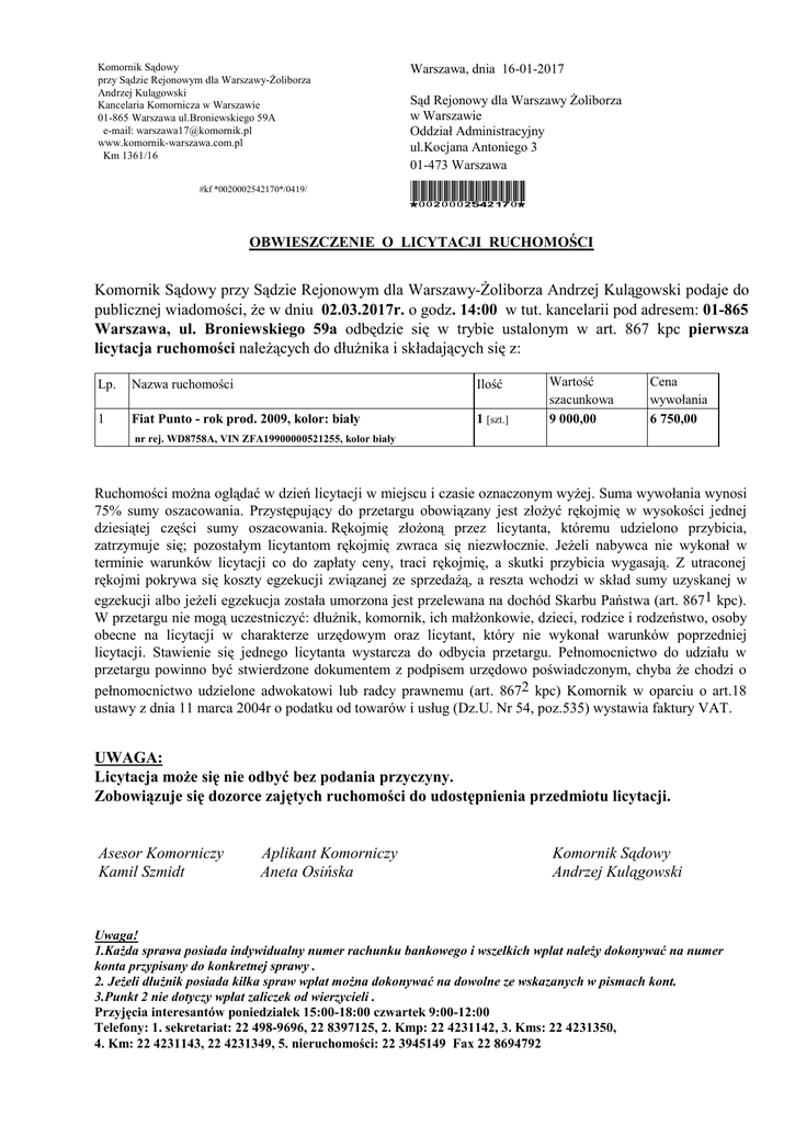 Komornik Sądowy przy Sądzie Rejonowym dla Warszawy-Żoliborza Andrzej Kulągowski Kancelaria Komornicza w Warszawie 01-865 Warszawa ul.Broniewskiego 59A e-mail: [email protected] www.komornik-warszawa.com.pl Km 1361/16 #kf *0020002542170*/0419/ Warszawa, dnia 16-01-2017 Sąd Rejonowy dla Warszawy Żoliborza w Warszawie Oddział Administracyjny ul.Kocjana Antoniego 3 01-473 Warszawa *0020002542170* OBWIESZCZENIE O LICYTACJI RUCHOMOŚCI Komornik Sądowy przy Sądzie Rejonowym dla Warszawy-Żoliborza Andrzej Kulągowski podaje do publicznej wiadomości, że w dniu 02.03.2017r. o godz. 14:00 w tut. kancelarii pod adresem: 01-865 Warszawa, ul. Broniewskiego 59a odbędzie się w trybie ustalonym w art. 867 kpc pierwsza licytacja ruchomości należących do dłużnika i składających się z: Lp. Nazwa ruchomości Ilość 1 Fiat Punto - rok prod. 2009, kolor: biały 1 [szt.] Wartość szacunkowa 9 000,00 Cena wywołania 6 750,00 .nr rej. WD8758A, VIN ZFA19900000521255, kolor biały Ruchomości można oglądać w dzień licytacji w miejscu i czasie oznaczonym wyżej. Suma wywołania wynosi 75% sumy oszacowania. Przystępujący do przetargu obowiązany jest złożyć rękojmię w wysokości jednej dziesiątej części sumy oszacowania. Rękojmię złożoną przez licytanta, któremu udzielono przybicia, zatrzymuje się; pozostałym licytantom rękojmię zwraca się niezwłocznie. Jeżeli nabywca nie wykonał w terminie warunków licytacji co do zapłaty ceny, traci rękojmię, a skutki przybicia wygasają. Z utraconej rękojmi pokrywa się koszty egzekucji związanej ze sprzedażą, a reszta wchodzi w skład sumy uzyskanej w egzekucji albo jeżeli egzekucja została umorzona jest przelewana na dochód Skarbu Państwa (art. 8671 kpc). W przetargu nie mogą uczestniczyć: dłużnik, komornik, ich małżonkowie, dzieci, rodzice i rodzeństwo, osoby obecne na licytacji w charakterze urzędowym oraz licytant, który nie wykonał warunków poprzedniej licytacji. Stawienie się jednego licytanta wystarcza do odbycia przetargu. Pełnomocnictwo do udziału w przetargu powinno być stwierdzone dokumentem z podpisem urzędowo poświadczonym, chyba że chodzi o pełnomocnictwo udzielone adwokatowi lub radcy prawnemu (art. 8672 kpc) Komornik w oparciu o art.18 ustawy z dnia 11 marca 2004r o podatku od towarów i usług (Dz.U. Nr 54, poz.535) wystawia faktury VAT. UWAGA: Licytacja może się nie odbyć bez podania przyczyny. Zobowiązuje się dozorce zajętych ruchomości do udostępnienia przedmiotu licytacji. Asesor Komorniczy Kamil Szmidt Aplikant Komorniczy Aneta Osińska Komornik Sądowy Andrzej Kulągowski Uwaga! 1.Każda sprawa posiada indywidualny numer rachunku bankowego i wszelkich wplat należy dokonywać na numer konta przypisany do konkretnej sprawy . 2. Jeżeli dłużnik posiada kilka spraw wpłat można dokonywać na dowolne ze wskazanych w pismach kont. 3.Punkt 2 nie dotyczy wpłat zaliczek od wierzycieli . Przyjęcia interesantów poniedziałek 15:00-18:00 czwartek 9:00-12:00 Telefony: 1. sekretariat: 22 498-9696, 22 8397125, 2. Kmp: 22 4231142, 3. Kms: 22 4231350, 4. Km: 22 4231143, 22 4231349, 5. nieruchomości: 22 3945149 Fax 22 8694792 w/w telefony czynne są codziennie w godz. 12:00 - 14:00. 5. Kontakt drogą elektroniczną dla spraw alimentacyjnych : [email protected], dla spraw KMS : [email protected] Adresaci Sąd Rejonowy dla Warszawy Żoliborza w Warszawie Oddział Administracyjny 1. Zachariasz Gosk, 01-951 Warszawa 2. Adwokat Krzysztof Czeszejko-Sochacki Kancelaria Adwokacka, 02-002 Warszawa 3. Sąd Rejonowy dla Warszawy Żoliborza w Warszawie Oddział Administracyjny, 01-473 Warszawa 4. Zachariasz Gosk, 01-914 Warszawa 5. Kancelaria Prawnicza FORUM Radca Prawny Krzysztof Piluś i s-ka sp. k., 22-400 Zamość 6. a/a