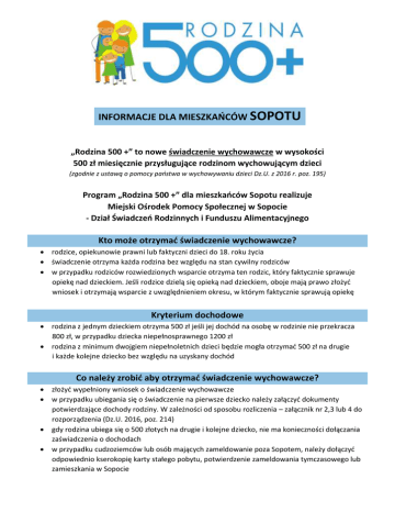 INFORMACJE DLA MIESZKAŃCÓW SOPOTU „Rodzina 500 +” to nowe świadczenie wychowawcze w wysokości 500 zł miesięcznie przysługujące rodzinom wychowującym dzieci (zgodnie z ustawą o pomocy państwa w wychowywaniu dzieci Dz.U. z 2016 r. poz. 195) Program „Rodzina 500 +” dla mieszkańców Sopotu realizuje Miejski Ośrodek Pomocy Społecznej w Sopocie - Dział Świadczeń Rodzinnych i Funduszu Alimentacyjnego Kto może otrzymać świadczenie wychowawcze? rodzice, opiekunowie prawni lub faktyczni dzieci do 18. roku życia świadczenie otrzyma każda rodzina bez względu na stan cywilny rodziców w przypadku rodziców rozwiedzionych wsparcie otrzyma ten rodzic, który faktycznie sprawuje opiekę nad dzieckiem. Jeśli rodzice dzielą się opieką nad dzieckiem, oboje mają prawo złożyć wniosek i otrzymają wsparcie z uwzględnieniem okresu, w którym faktycznie sprawują opiekę Kryterium dochodowe rodzina z jednym dzieckiem otrzyma 500 zł jeśli jej dochód na osobę w rodzinie nie przekracza 800 zł, w przypadku dziecka niepełnosprawnego 1200 zł rodzina z minimum dwojgiem niepełnoletnich dzieci będzie mogła otrzymać 500 zł na drugie i każde kolejne dziecko bez względu na uzyskany dochód Co należy zrobić aby otrzymać świadczenie wychowawcze? złożyć wypełniony wniosek o świadczenie wychowawcze w przypadku ubiegania się o świadczenie na pierwsze dziecko należy załączyć dokumenty potwierdzające dochody rodziny. W zależności od sposobu rozliczenia – załącznik nr 2,3 lub 4 do rozporządzenia (Dz.U. 2016, poz. 214) gdy rodzina ubiega się o 500 złotych na drugie i kolejne dziecko, nie ma konieczności dołączania zaświadczenia o dochodach w przypadku cudzoziemców lub osób mających zameldowanie poza Sopotem, należy dołączyć odpowiednio kserokopię karty stałego pobytu, potwierdzenie zameldowania tymczasowego lub zamieszkania w Sopocie Jak i gdzie złożyć wniosek? drogą elektroniczną: a) za pomocą systemu teleinformatycznego udostępnianego przez ZUS, www.zus.pl b) poprzez banki krajowe świadczące usługi drogą elektroniczną (informacje na stronie www.mrpips.gov.pl) c) za pośrednictwem Platformy Emp@tia, www.empatia.mrpips.gov.pl – wymagany bezpieczny kwalifikowany podpis lub podpis potwierdzony profilem zaufanym ePUAP. Informacje o tym, jak uzyskać tzw. profil zaufany można znaleźć pod adresem www.epuap.gov.pl osobiście w Punktach Obsługi Programu 500 + godziny przyjęć interesantów (w okresie od 01.04 do 01.07.2016) poniedziałek i czwartek w godz. 9.00-17.00; wtorek, środa i piątek w godz. 9.00-15.00 w punktach: a) al. Niepodległości 876 (Dział Świadczeń Rodzinnych i Funduszu Alimentacyjnego MOPS Sopot) b) ul. Kolejowa 14, (siedziba MOPS Sopot) drogą pocztową na adres: Miejski Ośrodek Pomocy Społecznej w Sopocie, ul. Kolejowa 14, 81-835 Sopot Kiedy można złożyć wniosek? Wnioski można składać od 1 kwietnia 2016 r. Jeśli wniosek zostanie złożony w ciągu pierwszych 3 miesięcy (od 01.04 do 01.07.2016 r.), rodzice otrzymają wyrównanie za cały okres od 1 kwietnia. Złożony wniosek uprawniać będzie do otrzymywania świadczenia wychowawczego do 30 września 2017 r. Następny okres przyjmowania wniosków rozpocznie się 1 sierpnia 2017 r. W celu usprawnienia obsługi interesantów oraz uniknięcia kolejek zalecamy wcześniejszą rejestrację telefoniczną (czynną od 1 marca 2016r. od poniedziałku do piątku w godz. 8.00-15.00) nr tel. (58) 555 09 04 lub (58) 551 61 63 lub składanie wniosków drogą elektroniczną (od 1 kwietnia 2016 r.) lub Skąd pobrać formularz wniosku? ze strony www.mrpips.gov.pl lub www.mopssopot.pl al. Niepodległości 876 (Dział Świadczeń Rodzinnych i Funduszu Alimentacyjnego MOPS Sopot) ul. Kolejowa 14 (siedziba Miejskiego Ośrodka Pomocy Społecznej) Urząd Miasta Sopotu, ul. Kościuszki 25/27 Gdzie uzyskać informacje dotyczące Programu Rodzina 500 +? dzwoniąc pod numer tel. (58) 555 09 04 lub (58) 551 61 63 w Punkcie Informacyjnym w siedzibie MOPS Sopot przy ul. Kolejowej 14 w Dziale Świadczeń Rodzinnych i Funduszu Alimentacyjnego MOPS Sopot, al. Niepodległości 876 Punkty Informacyjne w okresie od 07.03 do 31.03.2016 r. czynne: w poniedziałek w godz. 9.00-17.00, od wtorku do piątku w godz. 9.00-15.00 Przed złożeniem wniosku można telefonicznie lub w Punktach Informacyjnych ustalić poprawność jego wypełnienia oraz skonsultować, jakie dokumenty należy przedłożyć (ważne dla osób ubiegających się na świadczenie wychowawcze na pierwsze dziecko).