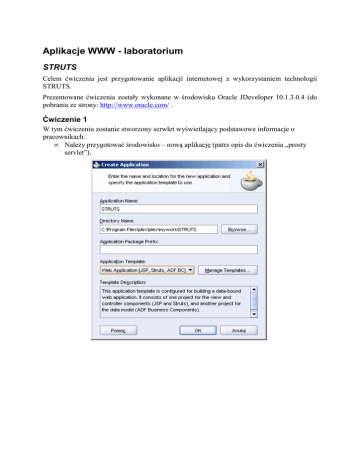 Aplikacje WWW - laboratorium STRUTS Celem ćwiczenia jest przygotowanie aplikacji internetowej z wykorzystaniem technologii STRUTS. Prezentowane ćwiczenia zostały wykonane w środowisku Oracle JDeveloper 10.1.3.0.4 (do pobrania ze strony: http://www.oracle.com/ . Ćwiczenie 1 W tym ćwiczeniu zostanie stworzony serwlet wyświetlający podstawowe informacje o pracownikach. • NaleŜy przygotować środowisko – nową aplikację (patrz opis do ćwiczenia „prosty servlet”). • W strukturze plików utworzonej aplikacji naleŜy znaleźć plik struts-config.xml i rozpocząć jego edycję. • Z pelety komponentów naleŜy wybrać komponent typu Page Forward i umieścić go w obszarze edycyjnym. NaleŜy określić jego nazwę jako Dane osobowe. Po dwukrotnym kliknięciu na utworzonej ikonie system zaproponuje utworzenie odpowiadającego mu pliku. Na stronach kreatora naleŜy zaakceptować wartości domyślne dla ustawień tworzonego pliku JSP • W pliku ApplicationResources.properties naleŜy dodać następujące wpisy person.title=Dane Osobowe person.subtitle=Wprowadz dane: • Następni naleŜy przejść do edycji utworzonej strony, korzystając z palety komponentów (biblioteka Struts Bean) umieścić na stronie element typu message i następnie ustawić jego właściwości • Podobnie naleŜy postąpić z kolejnym dodanym elementem typu message • Kolejnym elementem do mieszczenia na stronie jest formularz. • Z palety HTML Common naleŜy wybrać tabelę i umieścić ją wewnątrz formularza (powinna posiadać 7 wierszy i 2 kolumny) • W pliku ApplicationResources.properties naleŜy dodać następujące wpisy person.firstname=Imie: person.lastname=Nazwisko: person.birthdate=Data urodzenia (YYYY-MM-DD): person.age=Wiek (jezeli nie podano daty urodzenia): person.phone=Numer telefonu (XXX.XXX.XXXX): person.email=Email: person.explain.1=* pole obowiązkowe • W lewej kolumnie ostatniego wiersza tabeli na stronie dane osobowe umieścić przycisk RESET pochodzący z palety STRUTS HTML , natomiast w prawej kolumnie – przycisk SUBMIT • W kolumnie z lewej strony naleŜy umieścić elementy MESSAGE i powiązać je z utworzonymi poprzednio komponentami, dodatkowo przy polach imie i nazwisko dopisać symbol „*” oznaczający obowiązkowość tych komponentów • Następnie z prawej strony tabeli-formularza naleŜy wstawić pola tekstowe do wpisywania danych. Są to elementy typu Text Field z palety STRUTS HTML. Dla kaŜdego z nich naleŜy ustawić właściwość Property na jedną z wartości: firstname, lastname, birthdate, age, phone, email • Po wykonaniu powyŜszych kroków formularz powinien wyglądać następująco • Następnym krokiem jest wskazanie pliku struts-config.xml i stworzenie beana, który będzie obsługiwał stworzony właśnie formularz • Następnie naleŜy skonfigurować utworzonego beana • Typ beana naleŜy określić jako: org.apache.struts.validator.DynaValidatorForm, a nazwę: person • Podobnie naleŜy postąpić z właściwością Form Property • Tym razem jednak typem jest java.lang String, a nazwą: firstname • • Podobnie naleŜy określić właściwości dla pozostałych elementów formularza Kolejnym krokiem będzie dodanie akcji do formularza. W tym celu naleŜy przejść do edycji pliku: struts-config.xml, z palety komponentów wybrać komponent Action (paleta: Struts Page Flow), zmienić jego domyślną nazwę na przetwarzanie Po dwukrotnym kliknięciu na dodanej akcji zostanie utworzona odpowiednia klasa implementująca jej funkcjonalność • • Na diagramie przepływu sterowania naleŜy jeszcze umieścić element typu Page Forward i nazwać go: dane_zweryfikowane. Po podwójnym kliknięciu na tym elemencie utworzona zostanie strona JSP na której naleŜy umieścić element typu Message i jako pole key tego elementu wpisać: valid.ok . Odpowiedni opis tego komunikatu naleŜy teŜ umieścić w pliku ApplicationResources.properties valid.ok = Dane poprawne. • MoŜna juŜ uruchomić i przetestować aplikację Ćwiczenie 2 NaleŜy spróbować wzbogacić aplikację, a zwłaszcza przepływy sterowania o obsługę danych niepoprawnych (np. imię zaczynające się na A lub dowolna inna reguła). Obsługa taka powinna kończyć się powrotem sterowania do początkowego formularza z danymi osobowymi.