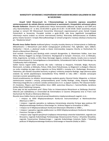 WARSZTATY GITAROWE Z HISZPAŃSKIM WIRTUOZEM RICARDO GALLENEM W ZSM W SZCZECINIE. Zespół Szkół Muzycznych im. F.Nowowiejskiego w Szczecinie zaprasza wszystkich zainteresowanych do udziału (bierne uczestnictwo) w warsztatach z hiszpańskim wirtuozem gitary Ricardo Gallenem. Otwarte dla publiczności lekcje mistrzowskie odbywać się będą w auli ZSM przy ulicy Staromłyńskiej 13 w dniu 22.03.2010 w godz.10-13.30 i 15.30-19.00. Dzień wcześniej artysta wystąpi w ramach XIII Wiosennych Koncertów Gitarowych organizowanych przez Zamek Książąt Pomorskich w Szczecinie. Początek recitalu o godz.18.00, sala Anny Jagiellonki (szczegółowe informacje można znaleźć na stronie internetowej Zamku). Warsztaty dofinansowano ze środków gminy miasta Szczecin i Urzędu Marszałkowskiego w ramach programu rozwoju edukacji artystycznej pn. "Akademia Sztuki". Ricardo Jesus Gallen Garcia studiował gitarę i muzykę muzykę dawną na Uniwersytecie w Salzburgu (Mozarteum) i z Monachium pod okiem następujących profesorów: Fisk, Eglhuber, Spiri, Gilbert, Huebscher i Clerch, a ukończył studia w klasie mistrzowskiej Joaquina Clercha w Hochschule fur Musik w Monachium (Niemcy). Grał recitale i koncerty pod dyrekcją wielu znanych dyrygentów, tj. Maximiano Valdes, Juan Jose Mena, Monica Huggett czy Seirgiu Comisiona. Występował w Europie i Ameryce, m.in. w Meksyku, Chile, Argentynie, na Kubie, w USA, Rosji, Norwegii, Egipcie, Jordanie, Libanie, Izraelu oraz w znanych salach koncertowych tj. Concertgebouw w Amsterdamie, Schostakovich Hall w Sankt Petersburgu czy Tchaikowsky Hall w Moskwie. Gallen Garcia nagrał wiele utworów dla radia i telewizji w Hiszpanii, Finlandii, Belgii, Rumunii, Niemczech, na Kubie, w Meksyku, Polsce, Chile, Korei Południowej, na Węgrzech i w Bułgarii. Obecnie na rynku znajdują się jego cztery nagrania na firmy NAXOS z muzyką m.in. Giulianiego, Brouwera i Takemitsu, jak również wszystkie koncerty na gitarę i orkiestrę Joaquina Rodrigo. Jego pierwsza płyta znalazła się wśród pięćdziesięciu bestsellerów firmy NAXOS w roku 2001 i dostała sensacyjne recenzje w prasie specjalistycznej. Został przedstawiony na okładce sierpniowego wydania gazety Classical Guitar Magazine, w którym zamieszczono wywiad z artystą, przeprowadzony przez Cecilię Rodrigo, córkę Joaquina Rodrigo. Informacja biograficzna o artyście została zamieszczona m.in. w piątym wydaniu The Classical Guitar: It's Evolution, Players and Personalities Since 1800, autorstwa Maurica J. Summerfielda, dyrektora Ashley Mark Publishing Company. Przez pięć lat był asystentem prof. Eliota Fiska na Uniwersytecie Mozarteum w Salzburgu (Austria). Obecnie jest wykładowcą w Unversidad de Extremadura w Caceres (Hiszpania) oraz w Franz Liszt Hochschule für Musik w Weimarze (Niemcy). Ricardo Jesus Gallen Garcia otrzymał ponad dwadzieścia międzynarodowych nagród, m.in.: − I miejsce na XXXII Międzynarodowym Konkursie Instrumentalnym w Markneukirchen (Niemcy) w 1997 r., − I miejsce i nagroda specjalna za najlepszą interpretację utworów Enrique Igoa podczas XIV Międzynarodowego Konkursu Gitarowego im. Andresa Segovii w Granadzie w 1998 r., − I miejsce na IV Międzynarodowym Konkursie Gitarowym Alhambra w 1998 r., − I miejsce i specjalna nagroda publiczności na XXXIII Międzynarodowym Konkursie Gitarowym Francisco Tarrega w 1999 r., − I miejsce i pięć nagród specjalnych (najlepsza interpretacja utworów kubańskich, nagroda Leo Brouwera, nagroda Kubańskiego Państwowego Stowarzyszenia Pisarzy i Artystów Muzyków, nagroda Towarzystwa Wydawniczego i nagroda Kubańskiego Instytutu Radia i Telewizji) podczas XI Międzynarodowego Konkursu Gitarowego w Hawanie (Kuba) w 2002 r.