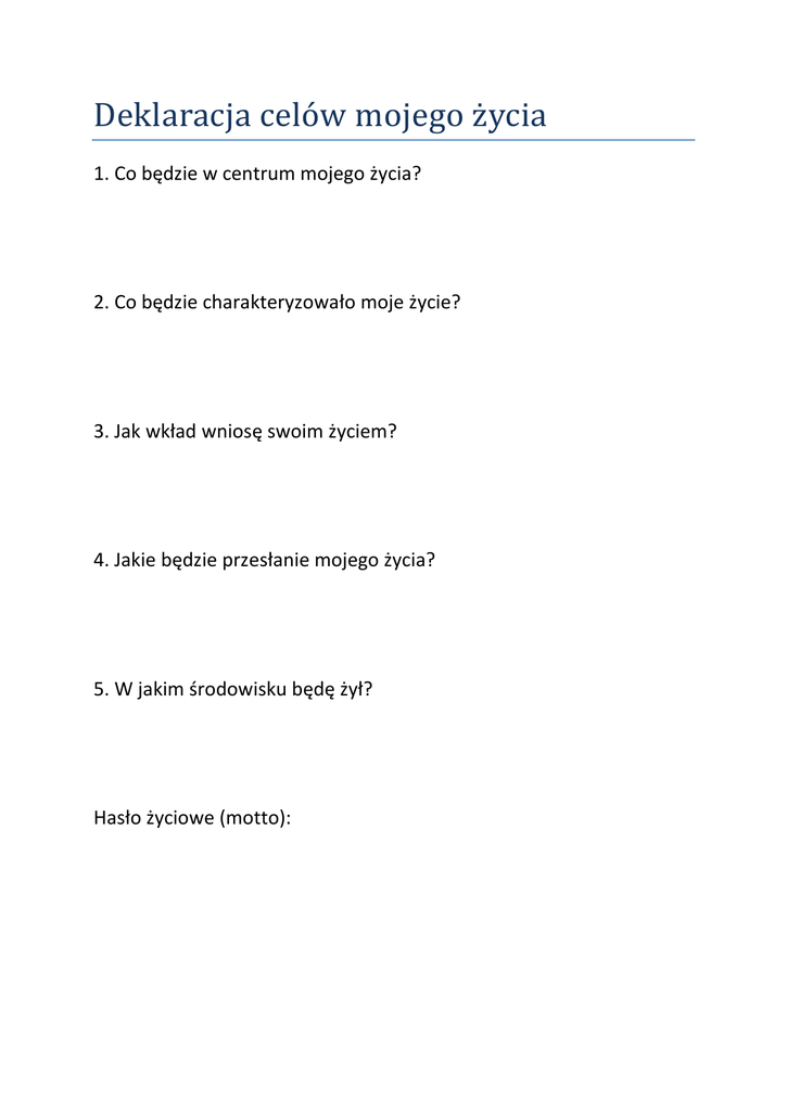 Deklaracja celów mojego życia 1. Co będzie w centrum mojego życia? 2. Co będzie charakteryzowało moje życie? 3. Jak wkład wniosę swoim życiem? 4. Jakie będzie przesłanie mojego życia? 5. W jakim środowisku będę żył? Hasło życiowe (motto):