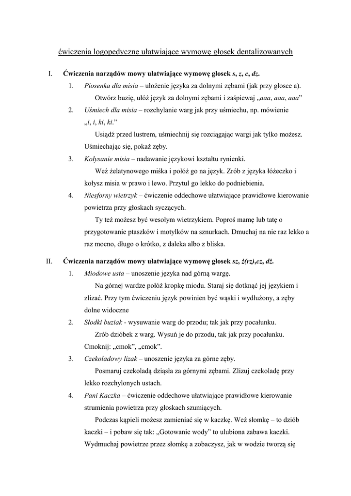 ćwiczenia logopedyczne ułatwiające wymowę głosek dentalizowanych I. Ćwiczenia narządów mowy ułatwiające wymowę głosek s, z, c, dz. 1. Piosenka dla misia – ułożenie języka za dolnymi zębami (jak przy głosce a). Otwórz buzię, ułóż język za dolnymi zębami i zaśpiewaj „aaa, aaa, aaa” 2. Uśmiech dla misia – rozchylanie warg jak przy uśmiechu, np. mówienie „i, i, ki, ki.” Usiądź przed lustrem, uśmiechnij się rozciągając wargi jak tylko możesz. Uśmiechając się, pokaż zęby. 3. Kołysanie misia – nadawanie językowi kształtu rynienki. Weź żelatynowego miśka i połóż go na język. Zrób z języka łóżeczko i kołysz misia w prawo i lewo. Przytul go lekko do podniebienia. 4. Niesforny wietrzyk – ćwiczenie oddechowe ułatwiające prawidłowe kierowanie powietrza przy głoskach syczących. Ty też możesz być wesołym wietrzykiem. Poproś mamę lub tatę o przygotowanie ptaszków i motylków na sznurkach. Dmuchaj na nie raz lekko a raz mocno, długo o krótko, z daleka albo z bliska. II. Ćwiczenia narządów mowy ułatwiające wymowę głosek sz, ż(rz),cz, dż. 1. Miodowe usta – unoszenie języka nad górną wargę. Na górnej wardze połóż kropkę miodu. Staraj się dotknąć jej językiem i zlizać. Przy tym ćwiczeniu język powinien być wąski i wydłużony, a zęby dolne widoczne 2. Słodki buziak - wysuwanie warg do przodu; tak jak przy pocałunku. Zrób dzióbek z warg. Wysuń je do przodu, tak jak przy pocałunku. Cmoknij: „cmok”, „cmok”. 3. Czekoladowy lizak – unoszenie języka za górne zęby. Posmaruj czekoladą dziąsła za górnymi zębami. Zlizuj czekoladę przy lekko rozchylonych ustach. 4. Pani Kaczka – ćwiczenie oddechowe ułatwiające prawidłowe kierowanie strumienia powietrza przy głoskach szumiących. Podczas kąpieli możesz zamieniać się w kaczkę. Weź słomkę – to dziób kaczki – i pobaw się tak: „Gotowanie wody” to ulubiona zabawa kaczki. Wydmuchaj powietrze przez słomkę a zobaczysz, jak w wodzie tworzą się bąbelki. Teraz trzymaj „dziób” nad wodą i delikatnie dmuchaj. Czy widzisz, jaki dołek powstaje na powierzchni wody? III. Ćwiczenia narządów mowy ułatwiające wymowę głosek ś, ź, ć, dź. 1. Mlaskający osiołek – mlaskanie środkiem języka Zabaw się w osiołka, który przy jedzeniu bardzo mlaska. 2. Zadowolony Gapcio – układanie języka w górkę Osiołek jest zadowolony i ryczy: iiii, ichi, ichi… 3. Ośle miny – wysuwanie warg do przodu Robienie min to ulubiona zabawa osiołka. Raz wysuwa wargi do przodu, a raz się uśmiecha (dzióbek – uśmiech na zmianę). 4. Kołysanka dla osiołka – dzięki temu ćwiczeniu dziecko uczy się oddychać przeponą i wydłużać fazę wydechową. Ważne jest, aby „aaa…” zaśpiewać na jednym wydechu. Połóż na brzuchu swoją ulubioną maskotkę. Może masz osiołka? Albo misia? Wciągnij dużo powietrza nosem, tak aby osiołek uniósł się na twoim brzuchu. Potem zaśpiewaj mu kołysankę: „aaa…, aaa…, aaa…”