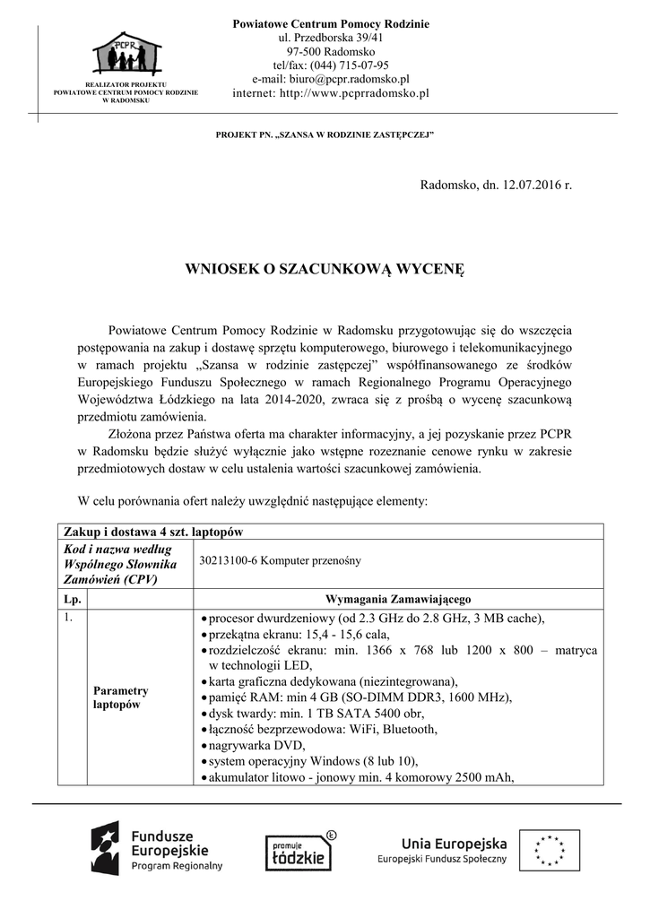 REALIZATOR PROJEKTU POWIATOWE CENTRUM POMOCY RODZINIE W RADOMSKU Powiatowe Centrum Pomocy Rodzinie ul. Przedborska 39/41 97-500 Radomsko tel/fax: (044) 715-07-95 e-mail: [email protected] internet: http://www.pcprradomsko.pl PROJEKT PN. „SZANSA W RODZINIE ZASTĘPCZEJ” Radomsko, dn. 12.07.2016 r. WNIOSEK O SZACUNKOWĄ WYCENĘ Powiatowe Centrum Pomocy Rodzinie w Radomsku przygotowując się do wszczęcia postępowania na zakup i dostawę sprzętu komputerowego, biurowego i telekomunikacyjnego w ramach projektu „Szansa w rodzinie zastępczej” współfinansowanego ze środków Europejskiego Funduszu Społecznego w ramach Regionalnego Programu Operacyjnego Województwa Łódzkiego na lata 2014-2020, zwraca się z prośbą o wycenę szacunkową przedmiotu zamówienia. Złożona przez Państwa oferta ma charakter informacyjny, a jej pozyskanie przez PCPR w Radomsku będzie służyć wyłącznie jako wstępne rozeznanie cenowe rynku w zakresie przedmiotowych dostaw w celu ustalenia wartości szacunkowej zamówienia. W celu porównania ofert należy uwzględnić następujące elementy: Zakup i dostawa 4 szt. laptopów Kod i nazwa według 30213100-6 Komputer przenośny Wspólnego Słownika Zamówień (CPV) Wymagania Zamawiającego Lp. 1. Parametry laptopów procesor dwurdzeniowy (od 2.3 GHz do 2.8 GHz, 3 MB cache), przekątna ekranu: 15,4 - 15,6 cala, rozdzielczość ekranu: min. 1366 x 768 lub 1200 x 800 – matryca w technologii LED, karta graficzna dedykowana (niezintegrowana), pamięć RAM: min 4 GB (SO-DIMM DDR3, 1600 MHz), dysk twardy: min. 1 TB SATA 5400 obr, łączność bezprzewodowa: WiFi, Bluetooth, nagrywarka DVD, system operacyjny Windows (8 lub 10), akumulator litowo - jonowy min. 4 komorowy 2500 mAh, REALIZATOR PROJEKTU POWIATOWE CENTRUM POMOCY RODZINIE W RADOMSKU Powiatowe Centrum Pomocy Rodzinie ul. Przedborska 39/41 97-500 Radomsko tel/fax: (044) 715-07-95 e-mail: [email protected] internet: http://www.pcprradomsko.pl PROJEKT PN. „SZANSA W RODZINIE ZASTĘPCZEJ” rodzaje wejść/ wyjść: DC-in (wejście zasilania) - 1 szt., wyjście słuchawkowe/wejście mikrofonowe - 1 szt., RJ-45 (LAN) - 1 szt., VGA (D-sub) - 1 szt., USB 2.0 - 1 szt., czytnik kart pamięci - 1 szt., HDMI - 1 szt., USB 3.0 - 2 szt. 2. 3. Gwarancja min. 24 miesiące Termin realizacji 10 dni od dnia otrzymania zamówienia 4. Miejsce dostawy Powiatowego Centrum Pomocy Rodzinie w Radomsku 97-500 Radomsko, ul. Przedborska 39/41 Zakup i dostawa 3 szt. drukarek laserowych Kod i nazwa według 30232110-8 Drukarki laserowe Wspólnego Słownika Zamówień (CPV) Wymagania Zamawiającego Lp. 1. Parametry drukarek automatyczny dupleks, czas wydruku 1 strony – min. 9 sek., eksploatacja startowa (w zestawie), eksploatacja zgodnie z normą ISO/IEC 19752, miesięczne obciążenie: min. 10.000 str., procesor: min. 266 MHz, interfejs standardowy: USB 2.0, 10/100 Ethernet Base TX, podajnik papieru: 250 arkuszy, podajnik wielofunkcyjny: 1 arkusz, poziom hałasu: drukowania 50 dB, prędkość druku: mono 30 str./min., pamięć (RAM): stardardowa 32MB, systemy operacyjne: Windows XP Home Edition, XP Professional Edition, XP Professional x64 Edition, Server 2003, Server 2003 x64 Edition, Vista, Server 2008, Server 2008 R2, 7, 8, 8.1, Server 2012, Server 2012 R2, Linux. 2. Gwarancja min. 24 miesiące 3. Termin realizacji 10 dni od dnia otrzymania zamówienia 4. Miejsce dostawy Powiatowego Centrum Pomocy Rodzinie w Radomsku 97-500 Radomsko, ul. Przedborska 39/41 REALIZATOR PROJEKTU POWIATOWE CENTRUM POMOCY RODZINIE W RADOMSKU Powiatowe Centrum Pomocy Rodzinie ul. Przedborska 39/41 97-500 Radomsko tel/fax: (044) 715-07-95 e-mail: [email protected] internet: http://www.pcprradomsko.pl PROJEKT PN. „SZANSA W RODZINIE ZASTĘPCZEJ” Zakup i dostawa 2 szt. niszczarek Kod i nazwa według 30191400-8 Niszczarki Wspólnego Słownika Zamówień (CPV) Wymagania Zamawiającego Lp. 1. Parametry drukarek rodzaj cięcia: ścinki, szerokość szczeliny wejściowej: min. 220 mm, automatyczny start / stop, mechanizm odporny na zszywki, zabezpieczenie przed przegrzaniem, funkcja cofania, objętość kosza: min. 16 litrów, ilość niszczonych arkuszy A4 80g: min. 8, moc: min. 200 W, poziom bezpieczeństwa – DIN 3 min. 24 miesiące 4. Gwarancja Gwarancja na noże Termin realizacji 5. Miejsce dostawy Powiatowego Centrum Pomocy Rodzinie w Radomsku 97-500 Radomsko, ul. Przedborska 39/41 2. 3. min. 24 miesiące 10 dni od dnia otrzymania zamówienia Zakup i dostawa 3 szt. telefonów (aparatów) komórkowych Kod i nazwa według 32250000-0 Telefony komórkowe Wspólnego Słownika Zamówień (CPV) Wymagania Zamawiającego Lp. 1. Parametry telefonów (aparatów) komórkowych rodzaj klawiatury: klasyczna, typ budowy: klasyczny, pamięć RAM: min.16 MB, Złącza: - gniazdo kart SIM – min.1 szt. - czytnik kart pamięci – 1 szt. - micro USB - 1 szt. - wyjście słuchawkowe/głośnikowe - 1 szt., przekątna ekranu: min. 2,4 cala, technologia wyświetlacza: kolorowy, LCD, rozdzielczość ekranu: min. 240x320, technologia baterii: Li-Ion, REALIZATOR PROJEKTU POWIATOWE CENTRUM POMOCY RODZINIE W RADOMSKU Powiatowe Centrum Pomocy Rodzinie ul. Przedborska 39/41 97-500 Radomsko tel/fax: (044) 715-07-95 e-mail: [email protected] internet: http://www.pcprradomsko.pl PROJEKT PN. „SZANSA W RODZINIE ZASTĘPCZEJ” pojemność baterii: min. 1000 mAh, wysokość: max. 120 mm, szerokość: max. 60 mm, kolor obudowy: czarny. 2. 3. Gwarancja min.24 miesiące Termin realizacji 10 dni od dnia otrzymania zamówienia 4. Miejsce dostawy Powiatowego Centrum Pomocy Rodzinie w Radomsku 97-500 Radomsko, ul. Przedborska 39/41 Zakup i dostawa 1 szt. telefonu (aparatu) stacjonarnego Kod i nazwa według 32550000-3 Sprzęt telefoniczny Wspólnego Słownika Zamówień (CPV) Wymagania Zamawiającego Lp. 1. Parametry telefonu (aparatu) stacjonarnego 2. 3. 4. Gwarancja Termin realizacji Miejsce dostawy Rodzaj telefonu: przewodowy, Wybieranie połączeń: tonowe, Wyświetlacz: LCD, Fun