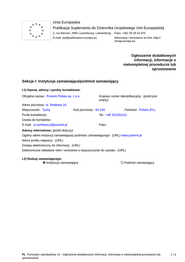 Unia Europejska Publikacja Suplementu do Dziennika Urzędowego Unii Europejskiej 2, rue Mercier, 2985 Luxembourg, Luksemburg Faks: +352 29 29 42 670 E-mail: [email protected] Informacje i formularze on-line: http:// simap.europa.eu Ogłoszenie dodatkowych informacji, informacje o niekompletnej procedurze lub sprostowanie Sekcja I: Instytucja zamawiająca/podmiot zamawiający I.1) Nazwa, adresy i punkty kontaktowe: Oficjalna nazwa: Pulverit Polska sp. z o.o Krajowy numer identyfikacyjny: (jeżeli jest znany) _____ Adres pocztowy: ul. Strefowa 16 Miejscowość: Tychy Kod pocztowy: 43-100 Punkt kontaktowy: _____ Państwo: Polska (PL) Tel.: +48 323291411 Osoba do kontaktów: _____ E-mail: [email protected] Faks: _____ Adresy internetowe: (jeżeli dotyczy) Ogólny adres instytucji zamawiającej/ podmiotu zamawiającego: (URL) www.pulverit.pl Adres profilu nabywcy: (URL) _____ Dostęp elektroniczny do informacji: (URL) _____ Elektroniczne składanie ofert i wniosków o dopuszczenie do udziału: (URL) _____ I.2) Rodzaj zamawiającego: Instytucja zamawiająca Podmiot zamawiający PL Formularz standardowy 14 - Ogłoszenie dodatkowych informacji, informacje o niekompletnej procedurze lub sprostowanie 1/4 Sekcja II: Przedmiot zamówienia II.1.1) Nazwa nadana zamówieniu: Dwuśrubowa wytłaczarka o wydajności pomiędzy 600 a 1000 kg/h oraz chłodzony przenośnik taśmowy o wydajności maksymalnej 1000 kg/h II.1.2) Krótki opis zamówienia lub zakupu: (podano w pierwotnym ogłoszeniu) Zamówienie dotyczy 2 szt. środków trwałych: 1. Dwuśrubowa wytłaczarka o wydajności pomiędzy 600 a 1000 kg/h, o następujących charakterystykach: - średnica ślimaków: 300 mm - jednostka grzewczo chłodząca - jednostka kontroli temperatury - podajnik - wymiennik ciepła - zestaw śrub i elementów roboczych śruby (1 komplet dwóch śrub) - wykrywacz metalu zainstalowany na wlocie podajnika. - wymagana deklaracja zgodności i oznaczenie CE. 2. Chłodzony przenośnik taśmowy o następujących charakterystykach: - wydajność maksymalna: 1000 kg/h - zintegrowany kalander i rozdrabniacz - chłodzenie transportera taśmy - bezszwowe połączenie taśmy - elektryczny panel kontrolny - obudowa z stali nierdzewnej - elektryczno-mechaniczny system przesuwu - chłodzenie w obiegu zamkniętym (zbiornik, pompa i wymiennik ciepła) - system zimnej wody. II.1.3) Wspólny Słownik Zamówień (CPV) Główny przedmiot Słownik główny 42993000 Słownik uzupełniający (jeżeli dotyczy) PL Formularz standardowy 14 - Ogłoszenie dodatkowych informacji, informacje o niekompletnej procedurze lub sprostowanie 2/4 Sekcja IV: Procedura IV.1)Rodzaj procedury (podano w pierwotnym ogłoszeniu) Otwarta Ograniczona Ograniczona przyspieszona Negocjacyjna Negocjacyjna przyspieszona Dialog konkurencyjny Negocjacyjna z uprzednim ogłoszeniem Negocjacyjna bez uprzedniego ogłoszenia Negocjacyjna z publikacją ogłoszenia o zamówieniu Negocjacyjna bez publikacji ogłoszenia o zamówieniu Udzielenie zamówienia bez uprzedniej publikacji ogłoszenia o zamówieniu w Dzienniku Urzędowym Unii Europejskiej IV.2)Informacje administracyjne IV.2.1)Numer referencyjny: (podano w pierwotnym ogłoszeniu) _____ IV.2.2)Dane referencyjne ogłoszenia w przypadku ogłoszeń przesłanych drogą elektroniczną: Pierwotne ogłoszenie przesłane przez eNotices TED eSender Login: ENOTICES_ECAS_nrachlwo Dane referencyjne ogłoszenia: 2016-015853 rok i numer dokumentu IV.2.3)Ogłoszenie, którego dotyczy niniejsza publikacja: Numer ogłoszenia w Dz.U.: 2016/S 028-045076 z dnia: 10/02/2016 (dd/mm/rrrr) IV.2.4)Data wysłania pierwotnego ogłoszenia: 05/02/2016 (dd/mm/rrrr) PL Formularz standardowy 14 - Ogłoszenie dodatkowych informacji, informacje o niekompletnej procedurze lub sprostowanie 3/4 Sekcja VI: Informacje uzupełniające VI.1) Ogłoszenie dotyczy: Procedury niepełnej Sprostowania Informacji dodatkowych VI.2) Informacje na temat niepełnej procedury udzielenia zamówienia: Postępowanie o udzielenie zamówienia zostało przerwane Postępowanie o udzielenie zamówienia uznano za nieskuteczne Zamówienia nie udzielono Zamówienie może być przedmiotem ponownej publikacji VI.3) Informacje do poprawienia lub dodania : VI.3.1) Zmiana oryginalnej informacji podanej przez instytucję zamawiającą Publikacja w witrynie TED niezgodna z oryginalną informacją, przekazaną przez instytucję zamawiającą Oba przypadki VI.3.2) W ogłoszeniu pierwotnym W odpowiedniej dokumentacji przetargowej (więcej informacji w odpowiedniej dokumentacji przetargowej) W obu przypadkach (więcej informacji w odpowiedniej dokumentacji przetargowej) VI.3.3) Tekst, który należy poprawić w pierwotnym ogłoszeniu Miejsce, w którym znajduje się Zamiast: zmieniany tekst: Powinno być: VI.3.4) Daty, które należy poprawić w pierwotnym ogłoszeniu Miejsce, w którym znajdują się Zamiast: zmieniane daty: 31/03/2016 Godzina: 15:00 IV.3.4 (dd/mm/rrrr) Powinno być: 20/04/2016 Godzina: 15:00 (dd/mm/rrrr) Miejsce, w którym znajdują się zmieniane daty: IV.3.8 Powinno być: 21/04/2016 Godzina: 10:00 (dd/mm/rrrr) Zamiast: 01/04/2016 Godzina: 10:00 (dd/mm/rrrr) VI.3.5) Adresy i punkty kontaktowe, które należy poprawić VI.3.6) Tekst, który należy dodać do pierwotnego ogłoszenia Miejsce, w którym należy dodać tekst: Tekst do dodania: VI.4) Inne dodatkowe informacje: _____ VI.5) Data wysłania niniejszego ogłoszenia: 24/03/2016 (dd/mm/rrrr) - ID:2016-038025 PL Formularz standardowy 14 - Ogłoszenie dodatkowych informacji, informacje o niekompletnej procedurze lub sprostowanie 4/4